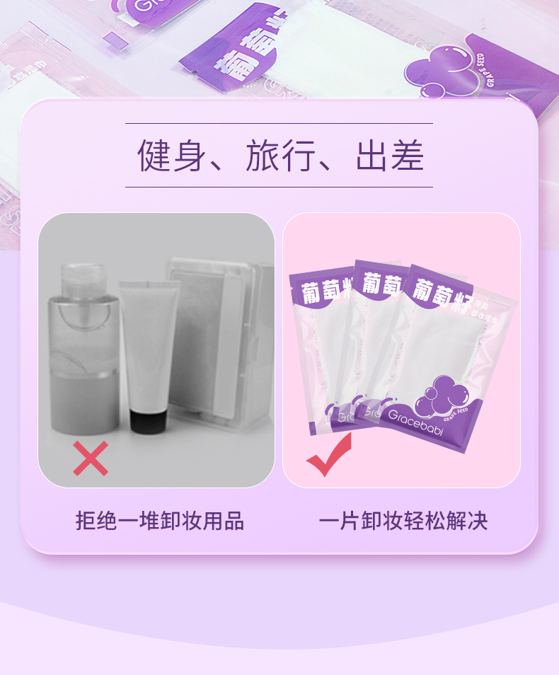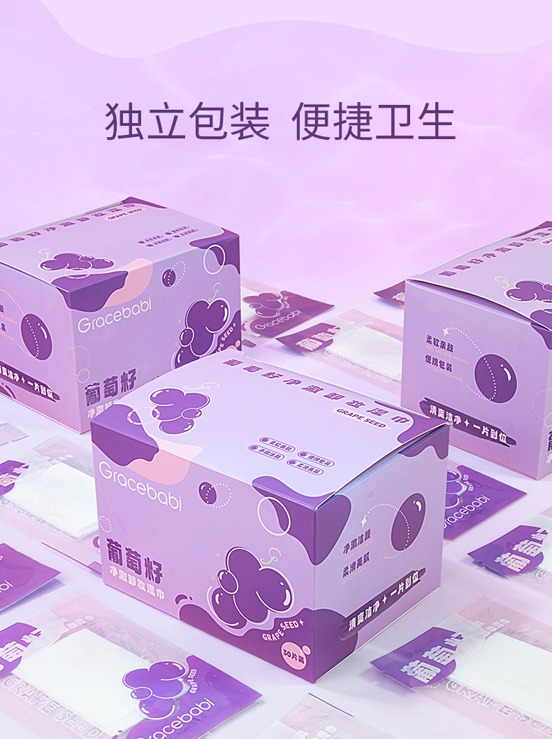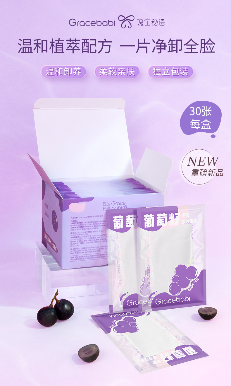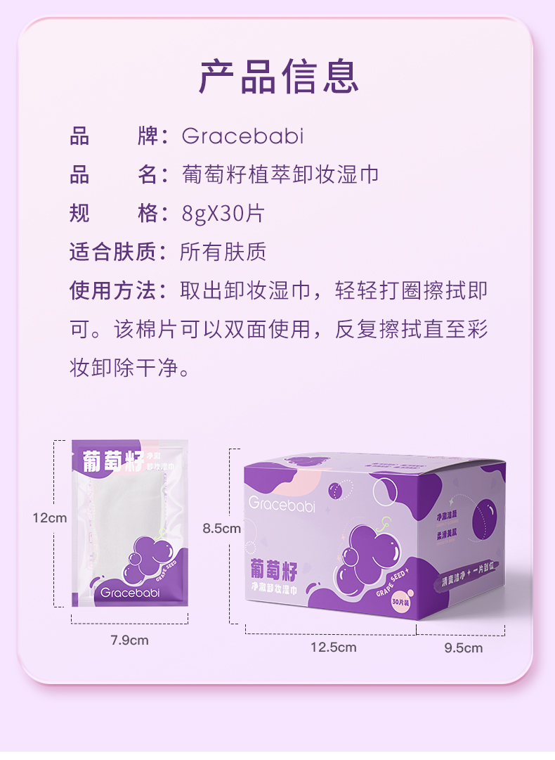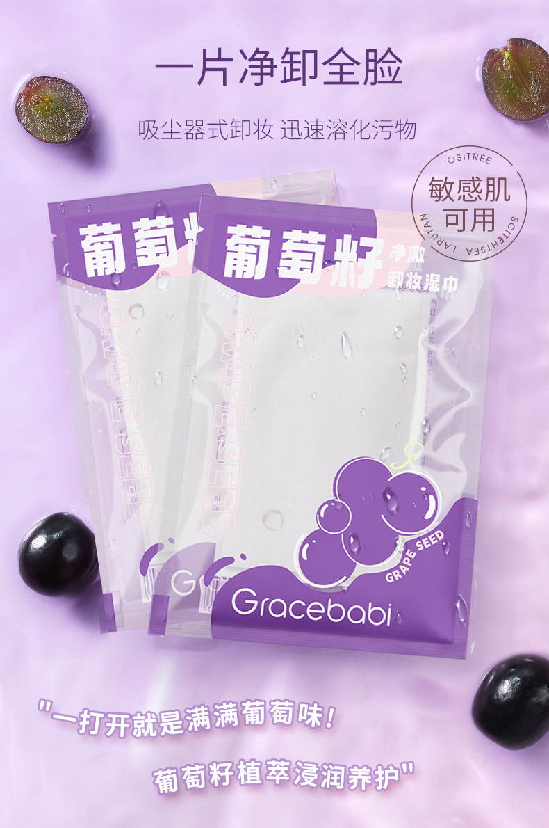 【多规格】Gracebabi葡萄籽植萃卸妆湿巾 温和不刺激深层清洁眼唇卸妆湿巾