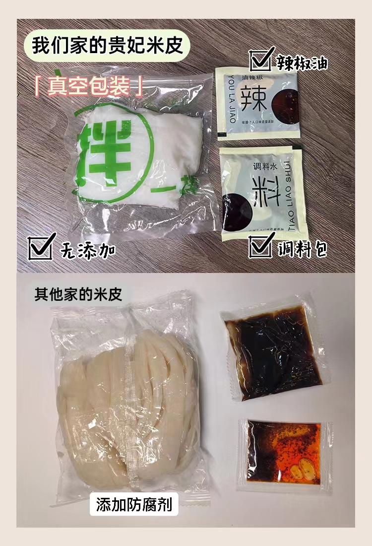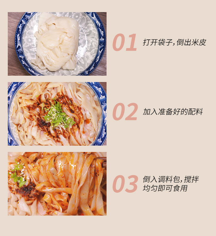 3.米皮出厂时已经是熟质。产品采用真空包装,开袋即食产品,收到后不需要加热,不需要蒸煮,加入调料搅拌后就食用。