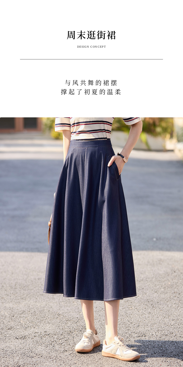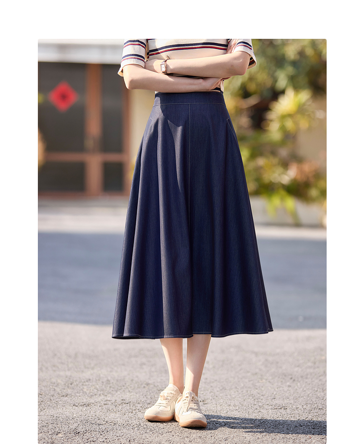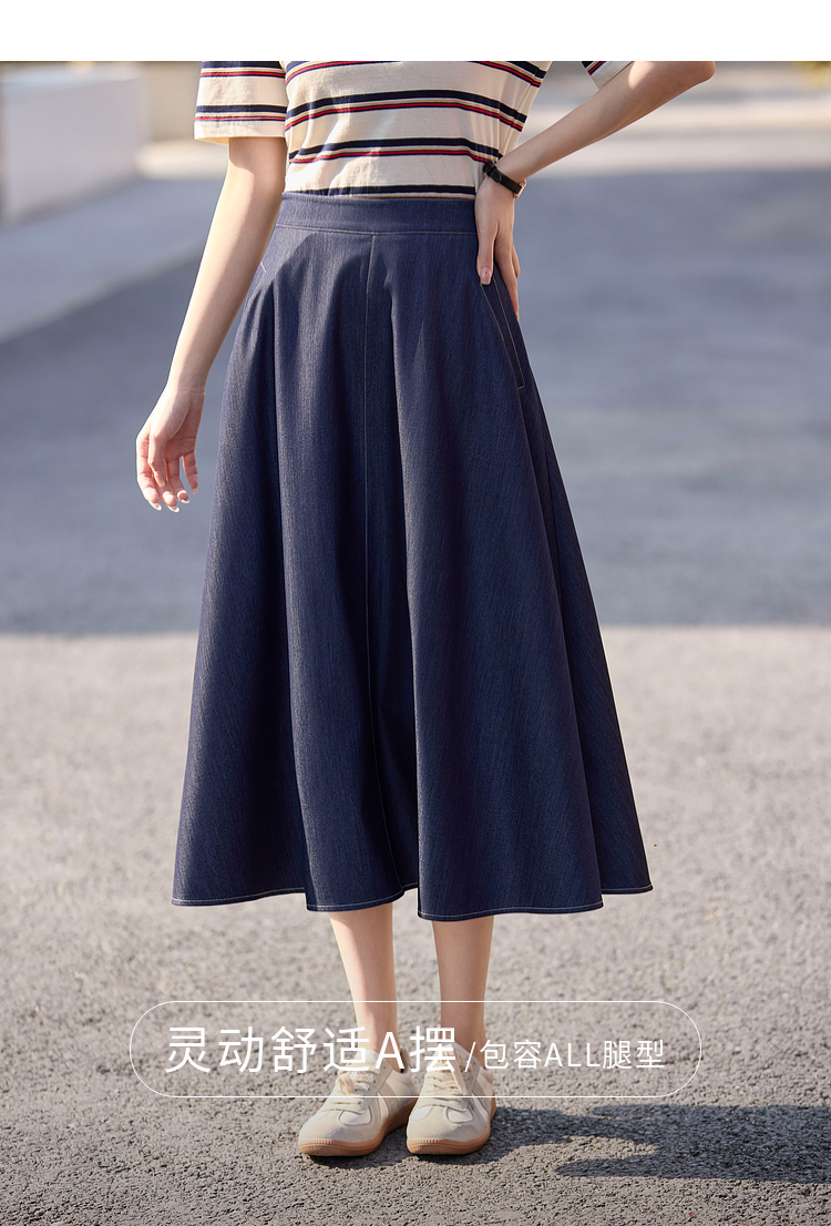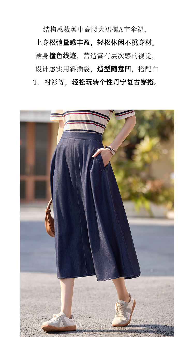 【专属特价】熙世界仿天丝牛仔蓝半身裙女薄款2025年夏季新款高腰显瘦a字伞裙