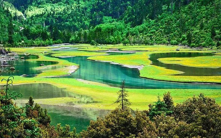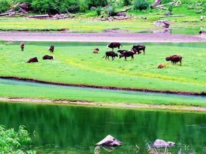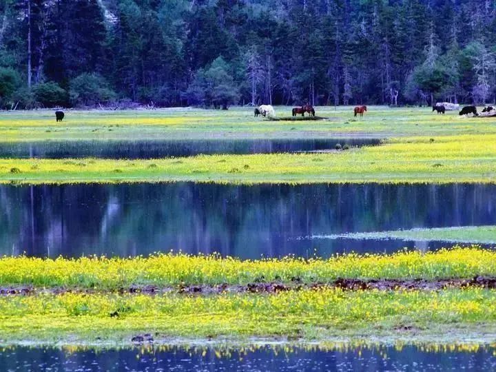 山谷内,溪流曲折蜿蜒,流速极缓,澄澈如明镜般的大小荷花海里水草丛生,湖面树影婆婆,高山鱼类在白云里嬉戏,在藻荇中穿行。