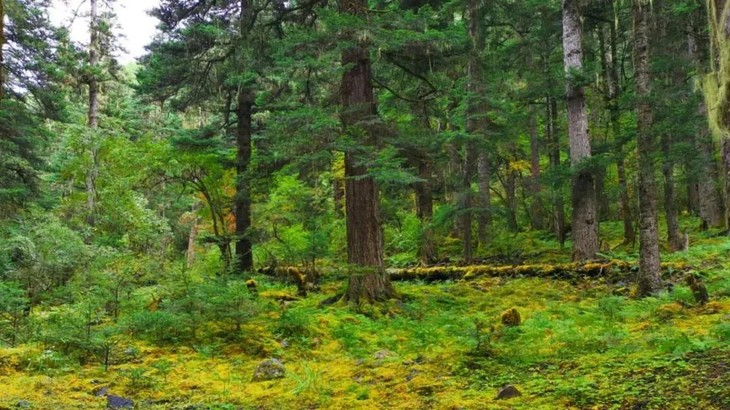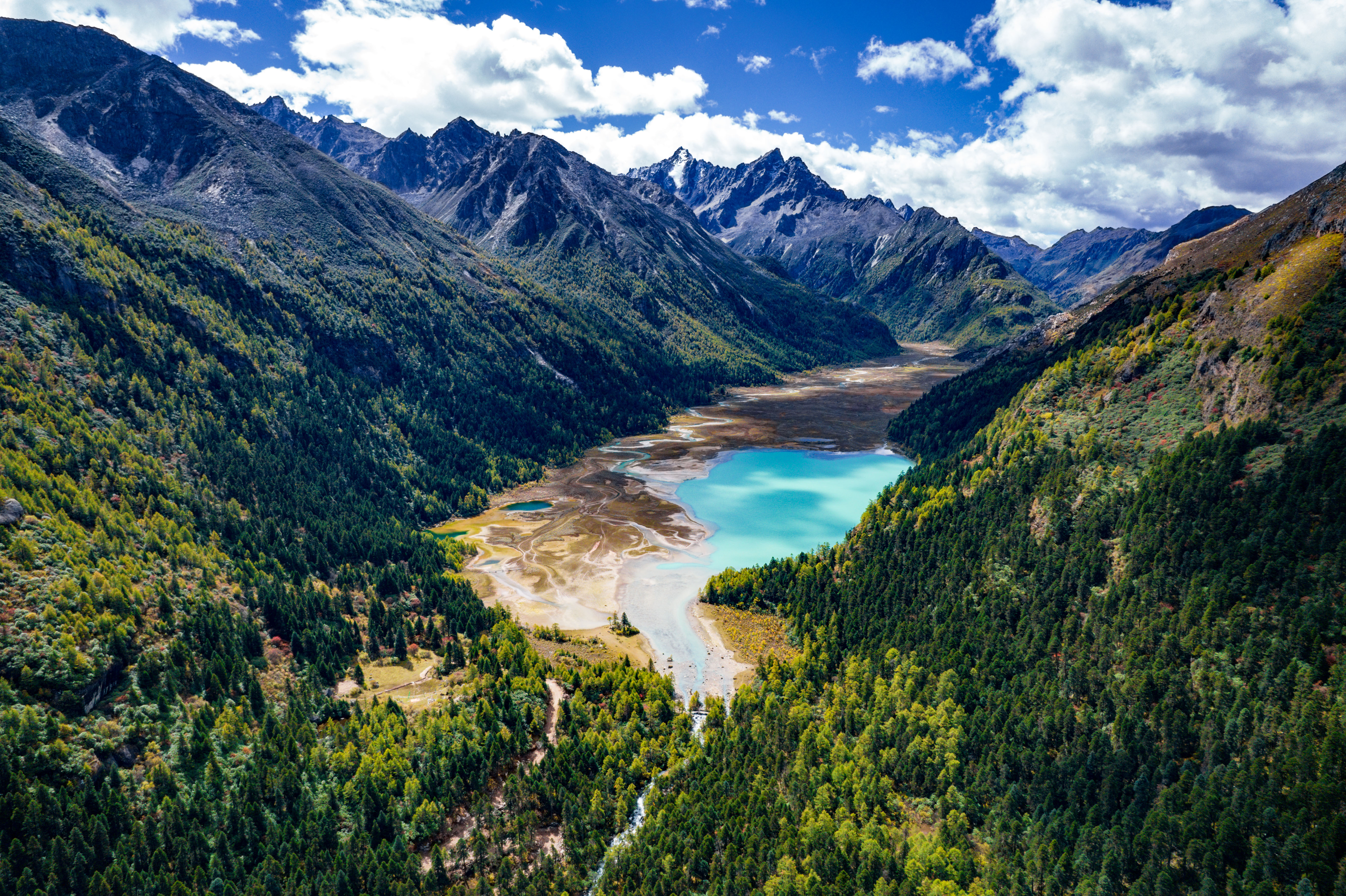 海子所在的山谷谷底两侧雪山高耸入云,峻峭、诡异的花岗岩滑石山,或挺立似宝塔,或层层叠叠似经书,或随类赋形如各种动物。山麓和山脚,则是大片茂密的杉树林和青冈林。