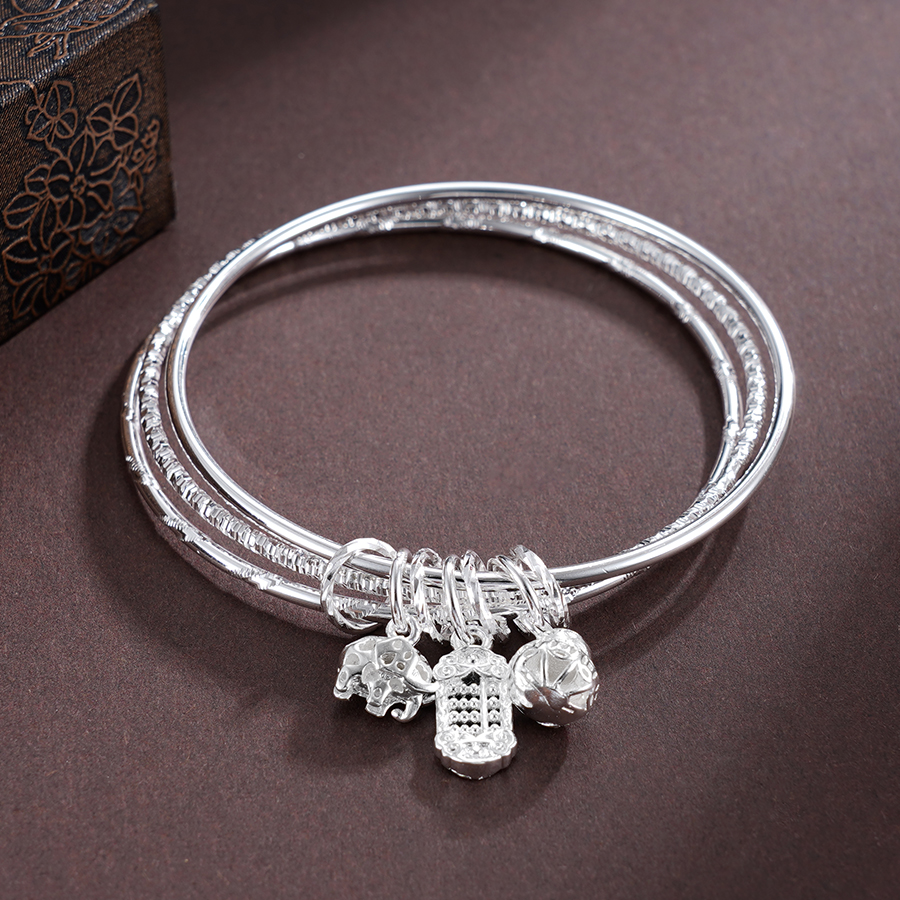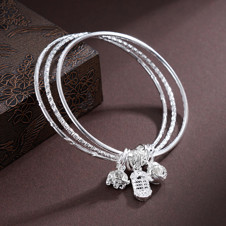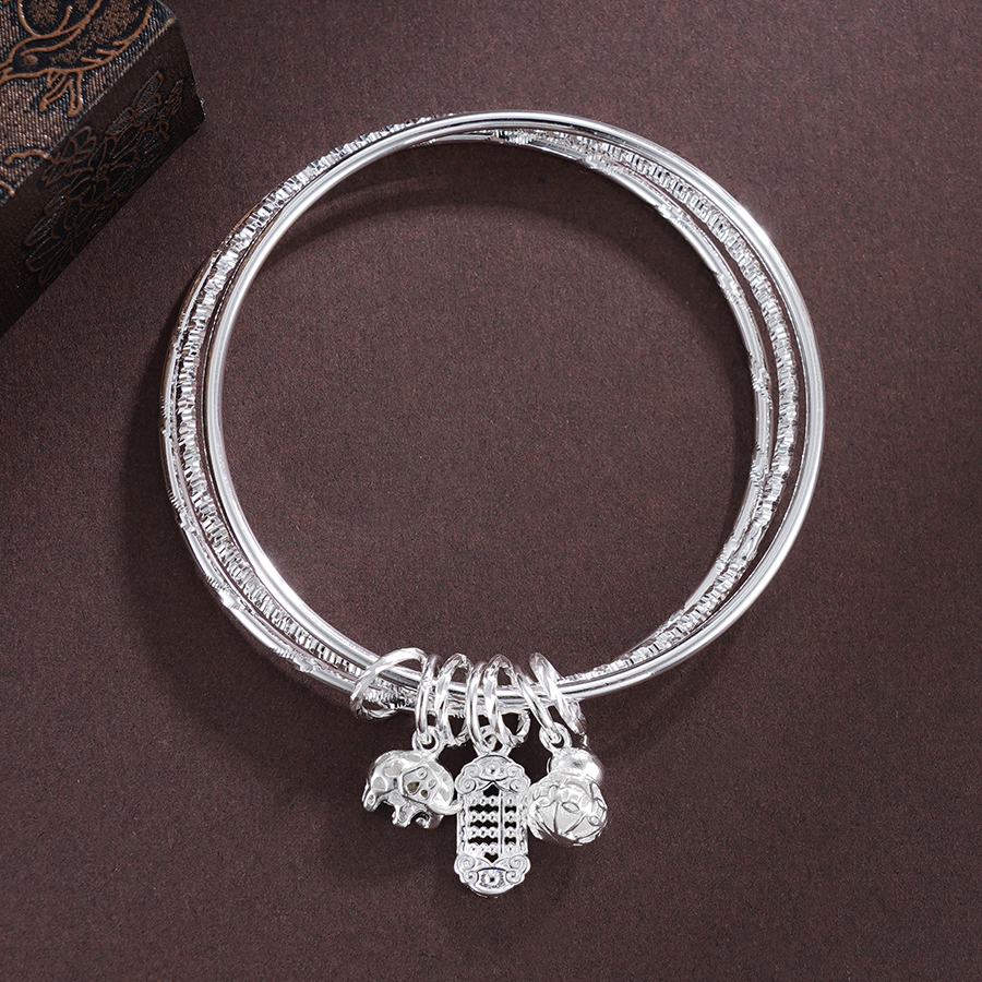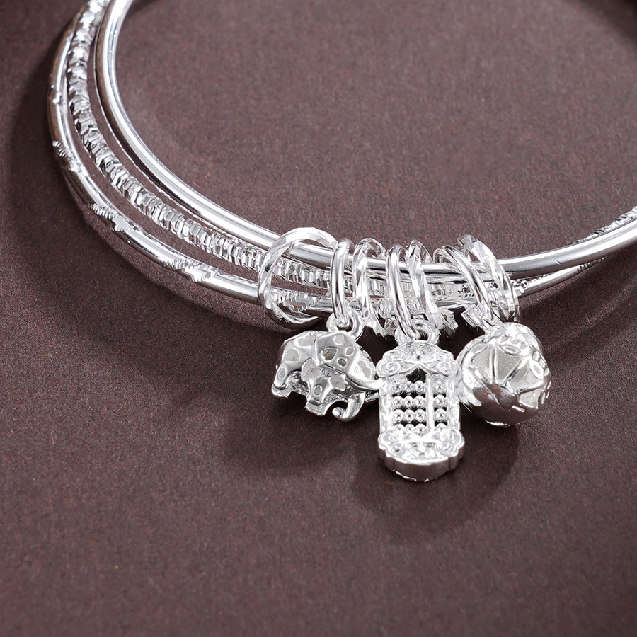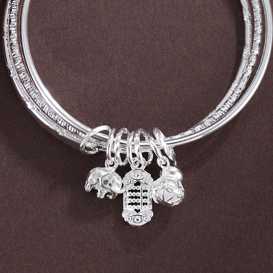 【寓意】:纯银三圈镯腕间交叠,点缀“大象、算盘、葫芦”三种小坠饰,传统吉祥元素加持之下,镯体轻叩,演奏出幸福盛宴。