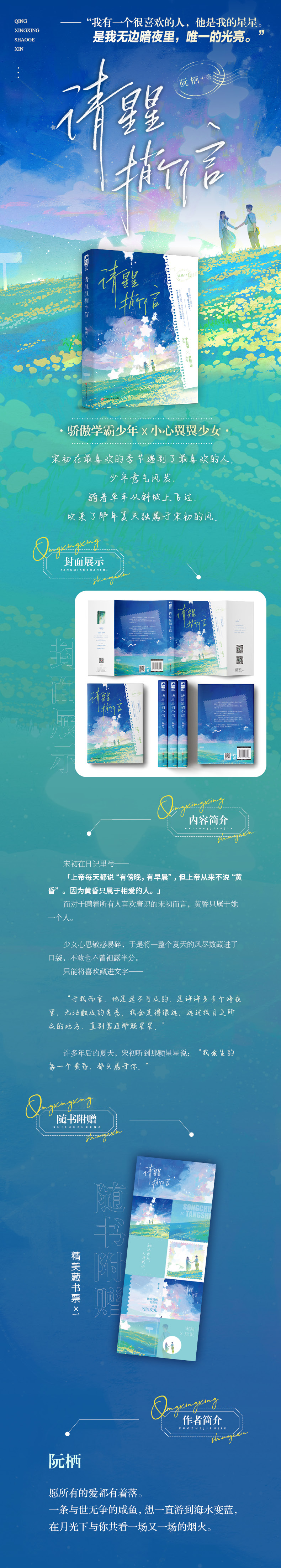 1、 骄傲学霸少年 唐识 x小心翼翼少女 宋初,校园暗恋、酸涩甜蜜,平凡少女的青春暗恋日常,写尽少女的心事,阅读时极易产生共鸣。 男主唐识转学来到女主宋初的班级,和宋初成为了好朋友。 在宋初受伤、需要帮助的时候,唐识一直都在,永远为她兜底。 尽管他是不经意的,尽管有非常多的巧合,唐识确实在她生命里很多个时刻,都给予了她陪伴。 她被嗜酒的爸爸弄得伤痕累累,是他拽着她去医务室;她回不去家了,是他把给了她一个暂时的避风港;被人欺负的时候,也是他站出来保护了她;她被妈妈抛弃,哭鼻子的时候,也是他把帽子盖在她头上,把人全都拦在了教室外面,替她保持着自尊…… 在她生命那么多至暗时刻,那个少年带着光,精准地把光束打在她的身上。 而胆小的宋初只敢悄悄仰望了那个又骄傲又温柔的少年一整个青春。 阿米亥说,上帝每天都说有傍晚,有早晨,但上帝从来不说黄昏。因为黄昏只属于相爱的人。 她在日记里写,“黄昏不属于我”。 那个时候的少女心事,敏感得只能放进玻璃罩,小心翼翼地保护起来。 她在这场暗恋里,一直是一个患得患失的胆小鬼。 2、暗恋成真,久别重逢,从校园到婚纱。优选的爱情是双向奔赴,是为了靠近你,我成长为更好的自己! 和唐识分开的日子,宋初努力追赶,终于变成足以和他相配的人。 再相遇的时候,终于有足够的底气站在他的身边。 “我有一个很喜欢的人,他叫唐识,是我的星星。是我无边暗夜里,专享的光亮。” “我所做的努力,都只是觉得,我想尽我所能,离他更近一点。” 我曾经以为,你是上天赐给十七八岁的我的一份绚丽却短暂的梦,从来没敢想,梦醒了,你依旧在我身边。 3、 晋江人气作者阮栖,擅长写清新治愈风格的爱情故事。文笔青春文艺,引人共鸣。 4、随书附赠—— 精美藏书票
