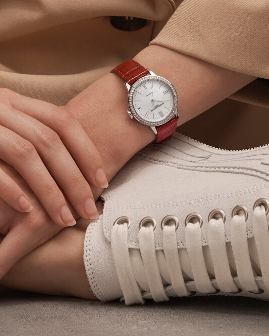 镜面材质 | 蓝宝石水晶玻璃 | 表盘 | 精钢表壳 镶钻表圈 白色珍珠母贝表盘, 罗马数字 棒状时标 日期显示 透底 |