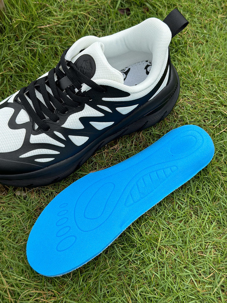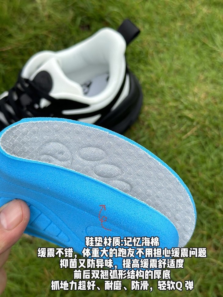 高弹的透气鞋垫 鞋垫记忆海棉搭配,下层很柔软 缓震不错,体重大的跑友不用担心缓震问题 抑菌又防异味,提高缓震舒适度 前后双翘弧形结构的厚底 抓地力超好、耐磨、防滑,轻软q 弹