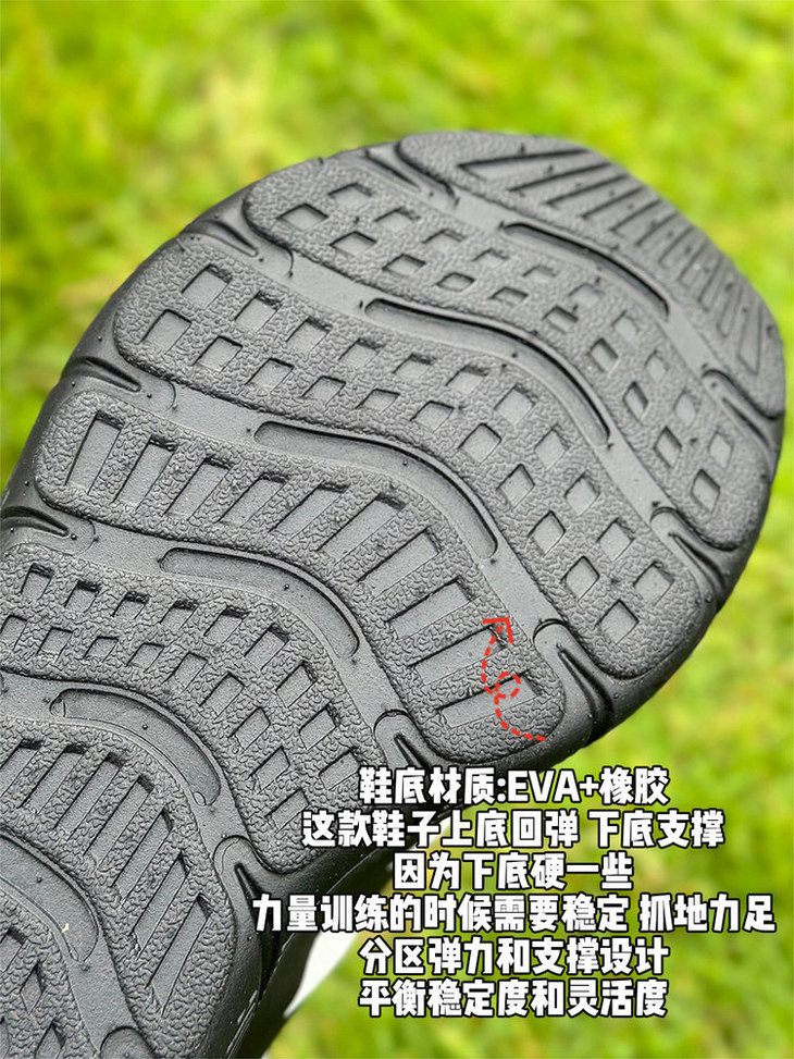不同于市面上其他款 这款鞋子上底回弹 下底支撑 因为下底硬一些 力量训练的时候需要稳定 抓地力足 分区弹力和支撑设计 平衡稳定度和灵活度