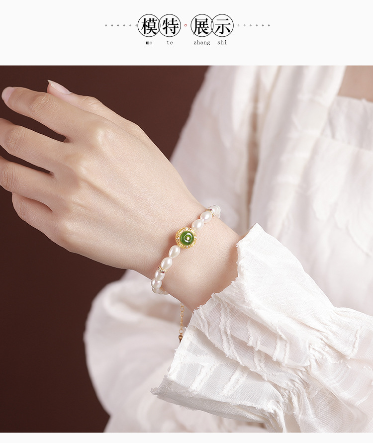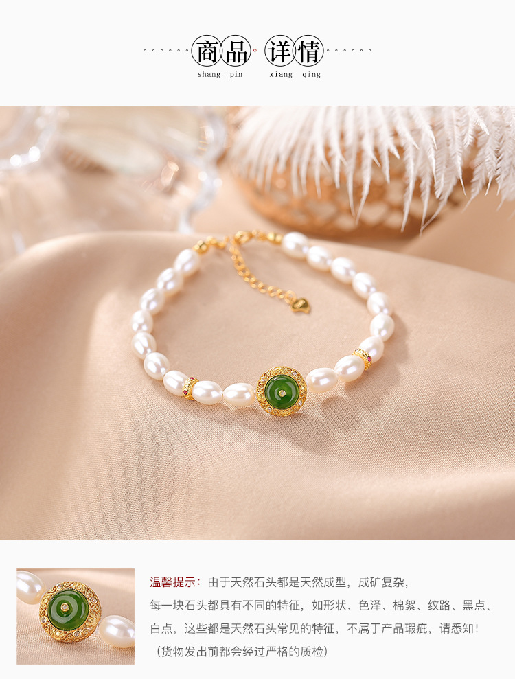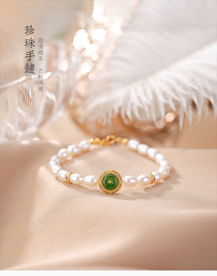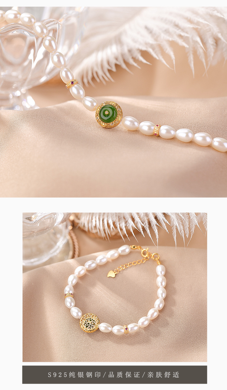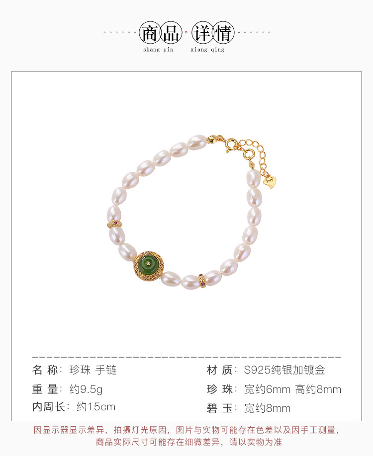 【天仙碧玉】S925纯银镀金和田玉碧玉淡水珍珠平安扣手串【CW-SL11627-11】