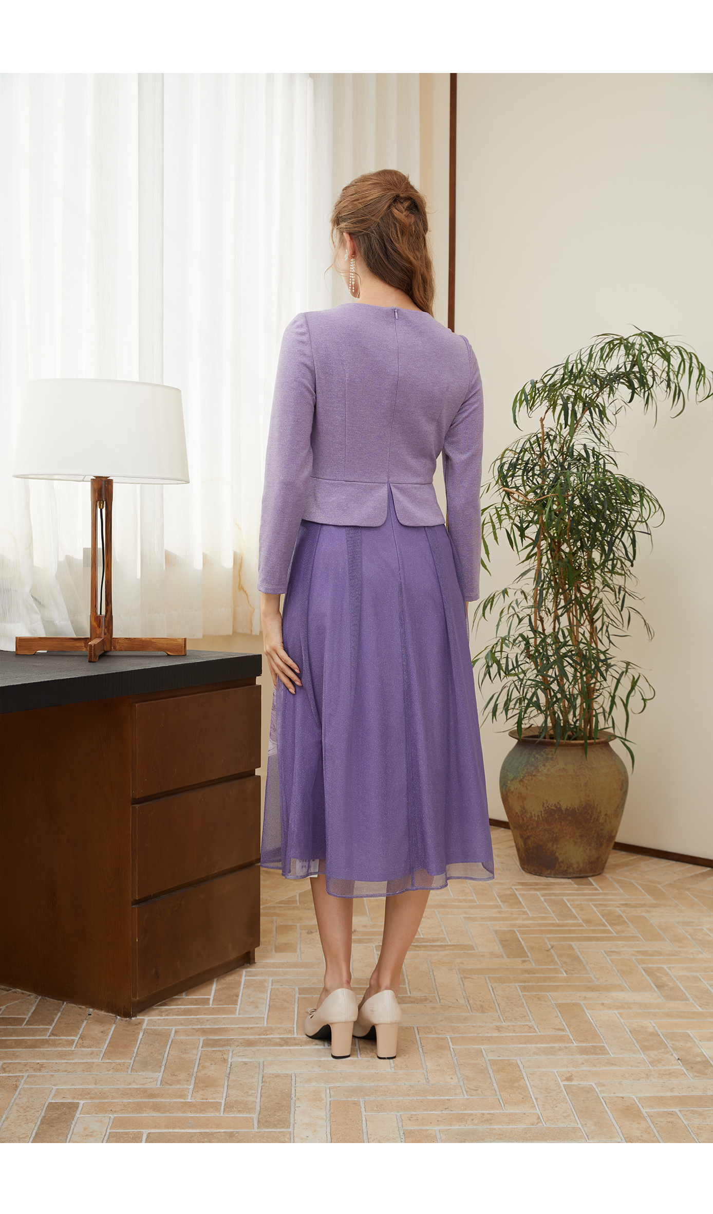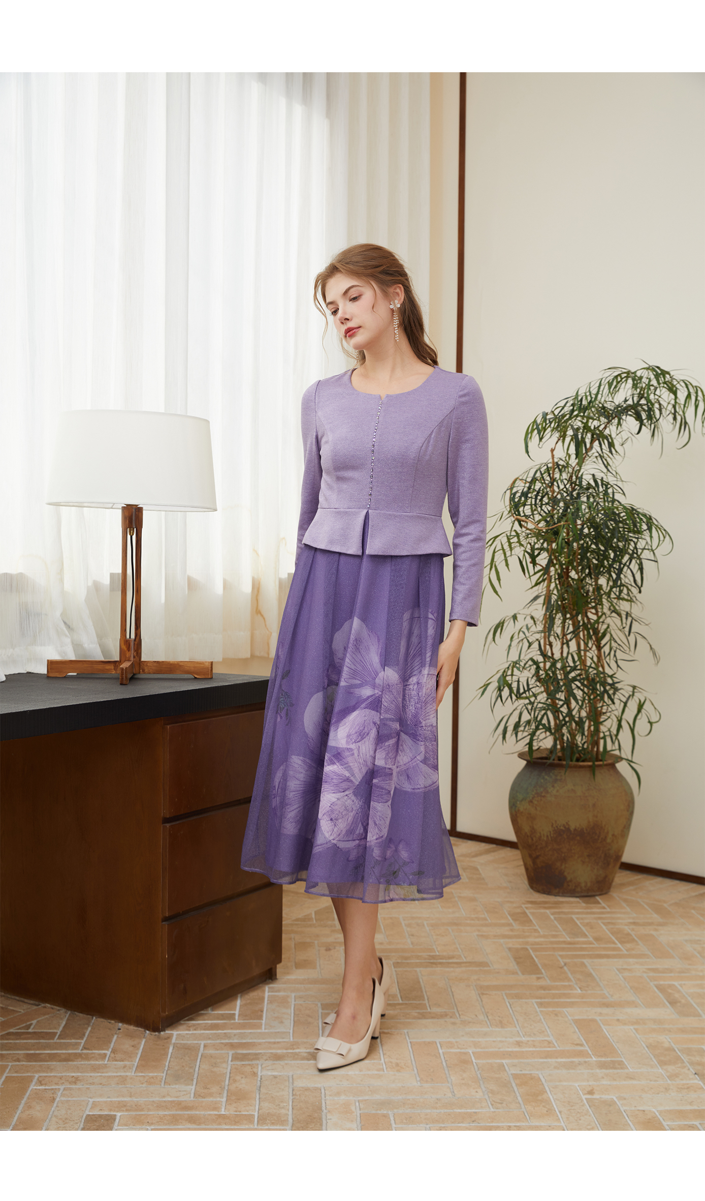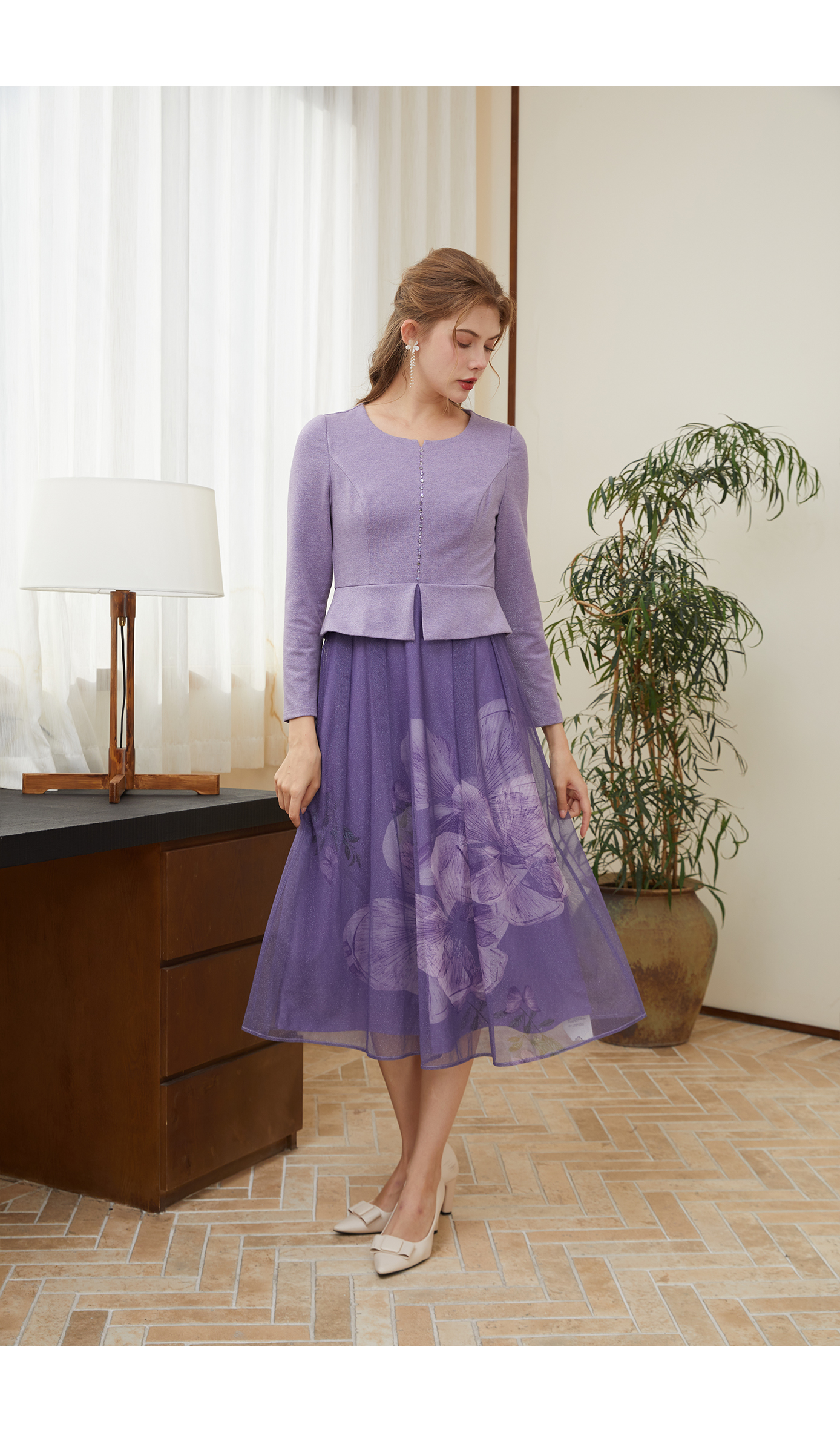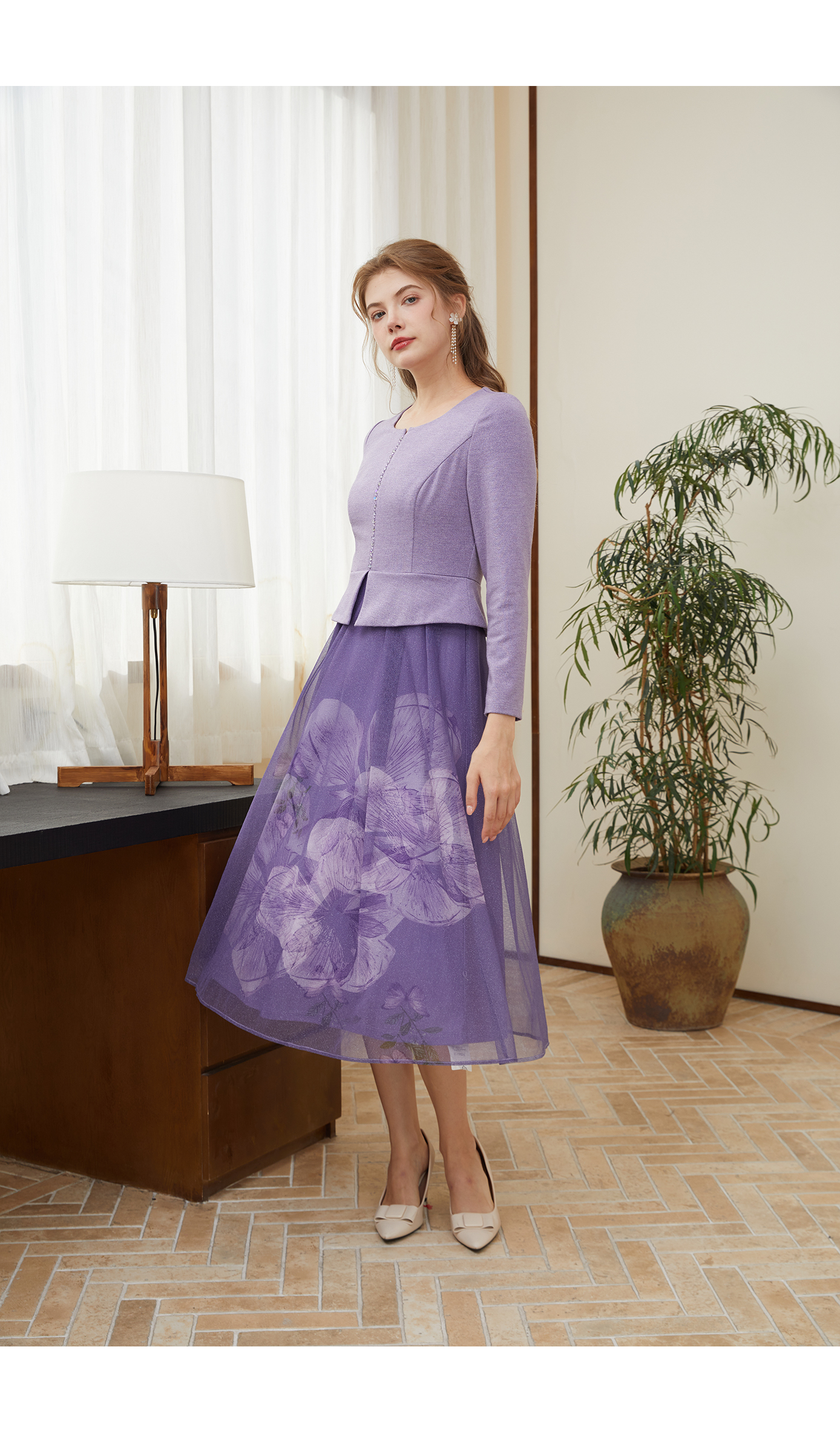 司歌刺绣长袖重工连衣裙紫色A901068X