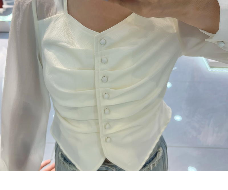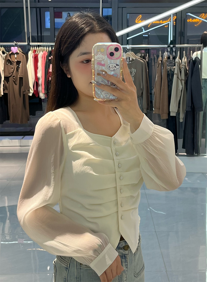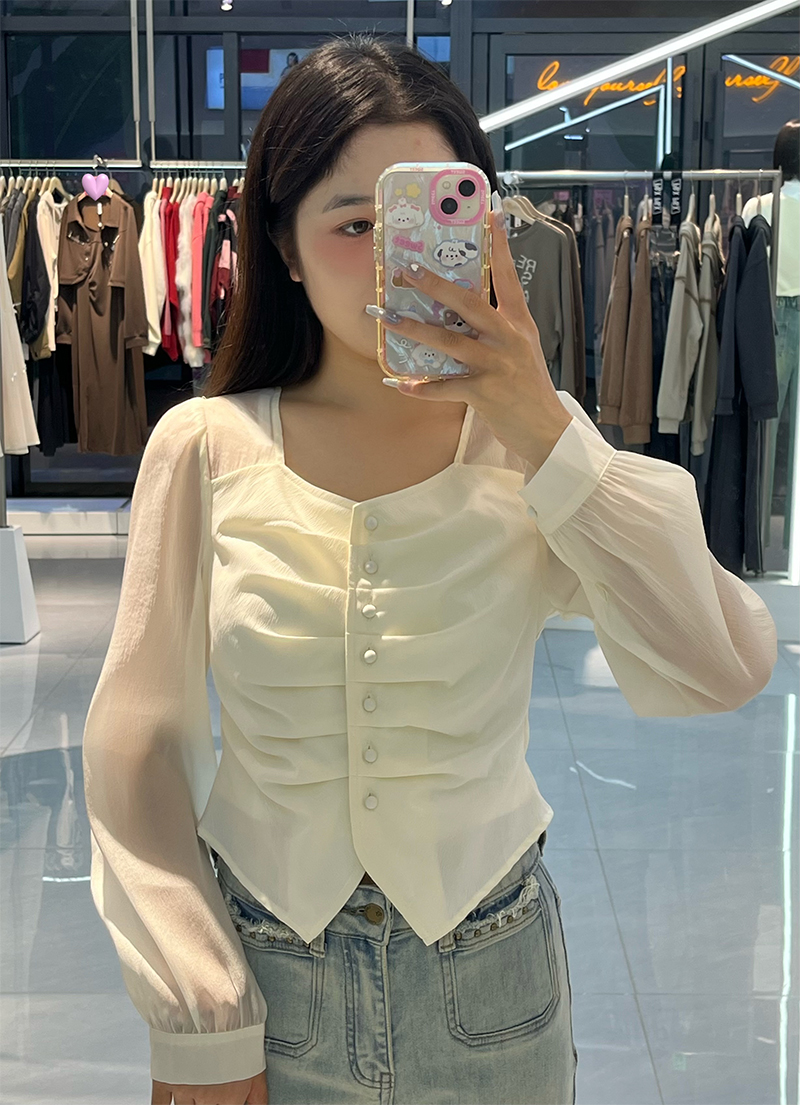 P&X设计师女装秋季新款褶皱气质衬衣法式短款衬衫824305198 杏色