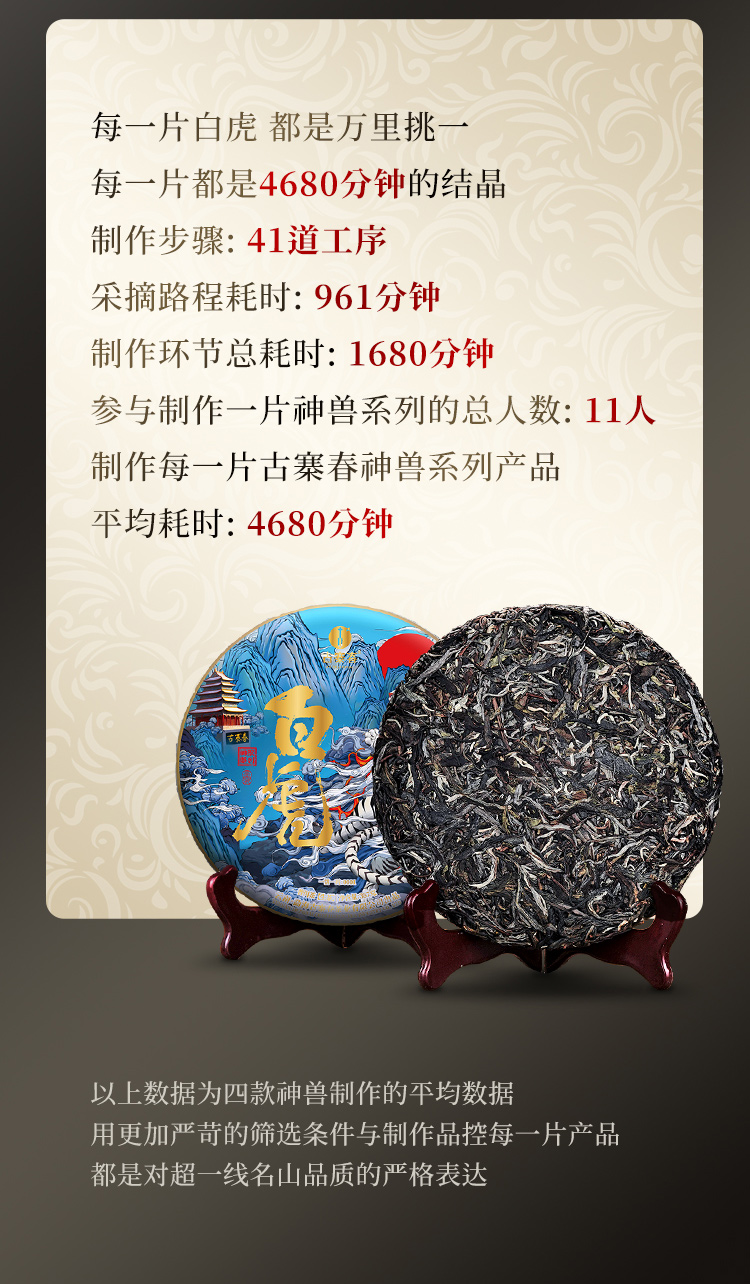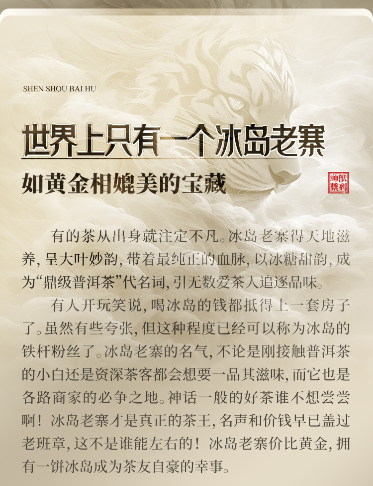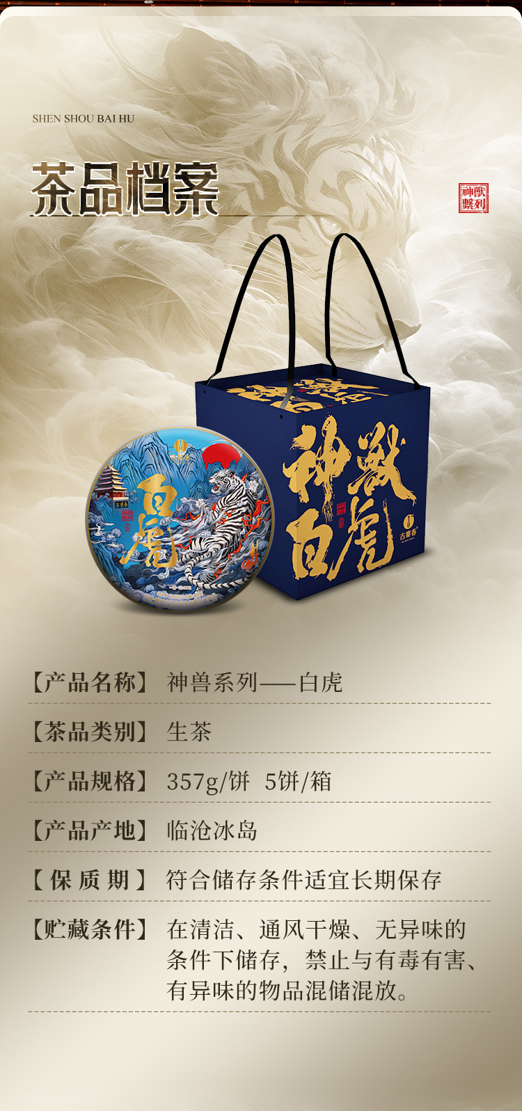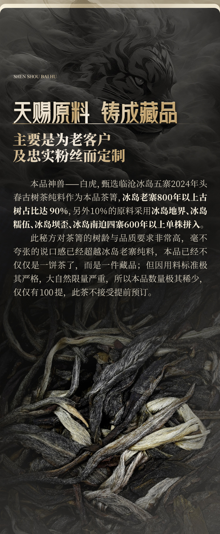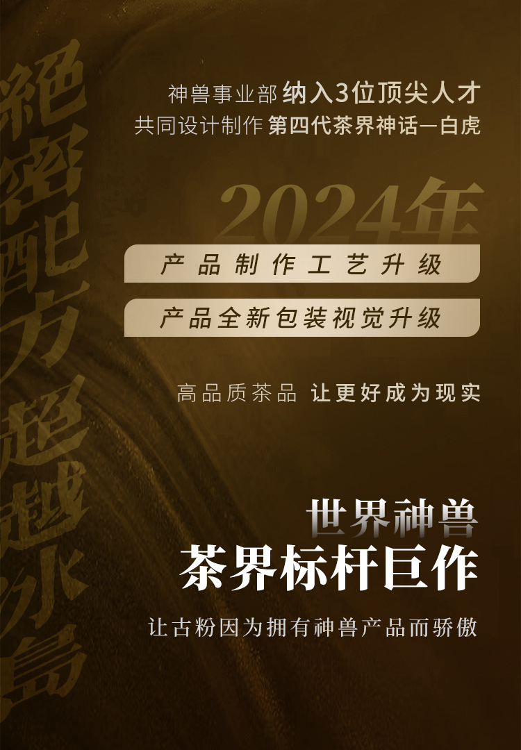 2024年春茶预售【神兽—白虎】超越纯料冰岛老寨的存在,神兽事业部独立出品高奢品牌,首发结束即封藏再无,限量100箱 拍5箱发6箱,前24小时下单加送同款龙珠一罐,每单额外赠送杯托*5