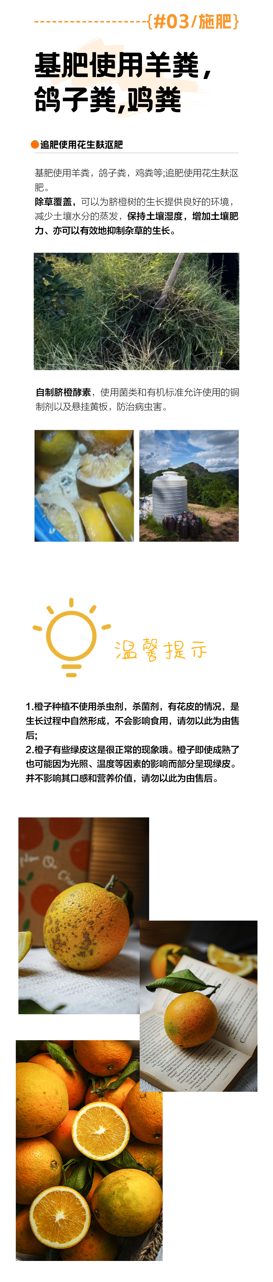 【规格】 5斤装(约10-15个) 9斤装(约12-20个) 19斤装(约24-36个) 【生产者】喻声胜 【产地】江西省赣州市赣县区韩坊镇迳里村 【种植方式】2023开始完全生态管理,不用化学合成的农药、化肥、植物生长调节剂、除草剂等,基肥用羊粪、鸽子粪、鸡粪等,追肥料用花生麸沤肥,自制脐橙发酵物;植保产品主要是菌类等有有机投入品评估证明的制剂;人工除草,基地已经五年没用除草剂。 【储存条件】冷藏存储 【发货方式】全国大部分地区京东包邮发货 【大小果说明】为保证脐橙新鲜采摘以及原生状态发货,不用设备分级,大小果子混装发货。 【售后说明】 1.橙子种植不使用杀虫剂,杀菌剂,有花皮的情况,是生长过程中自然形成,不会影响食用,请勿以此为由售后; 2.橙子有些绿皮这是很正常的现象哦。橙子即使成熟了也可能因为光照、温度等因素的影响而部分呈现绿皮。并不影响其口感和营养价值,请勿以此为由售后。 3.不喜欢、口感问题、拒收、地址电话不详、转寄等不在售后范围内。 4.售后凭证:需提供面单加坏果个数及总个数图片合照,以及快递面单照片。 5.售后时间:生鲜产品签收后24小时内反馈客服处理售后。 6.重量说明:生鲜产品在运输过程中会有小部分水分蒸发流失,收到后重量会稍有减轻,重量损耗在5%以内视为正常,超出5%的,按重量赔付。 7.下单后3天左右发出,受天气或库存等原因影响可能偶有耽误,急单请发货前咨询客服,不接受没有提前沟通的拒收。 |