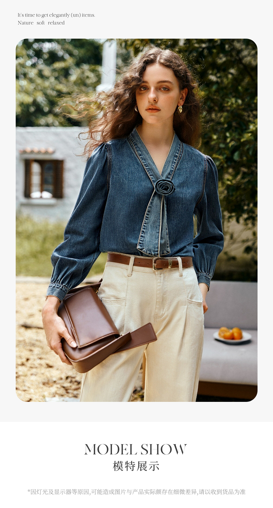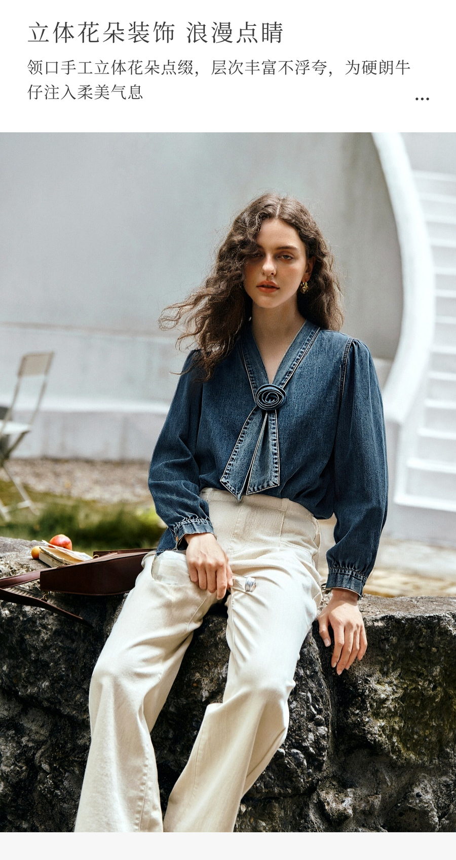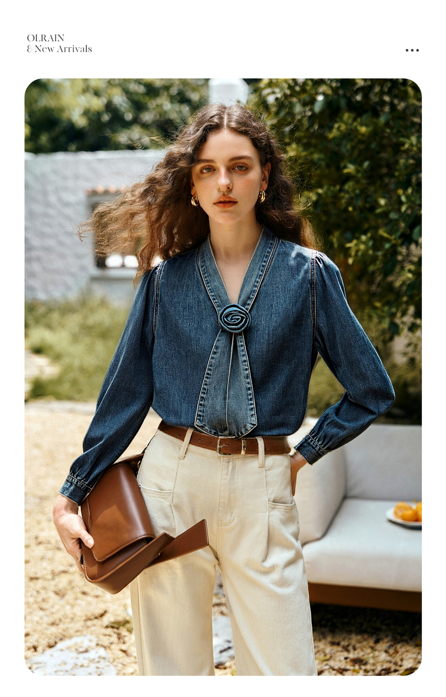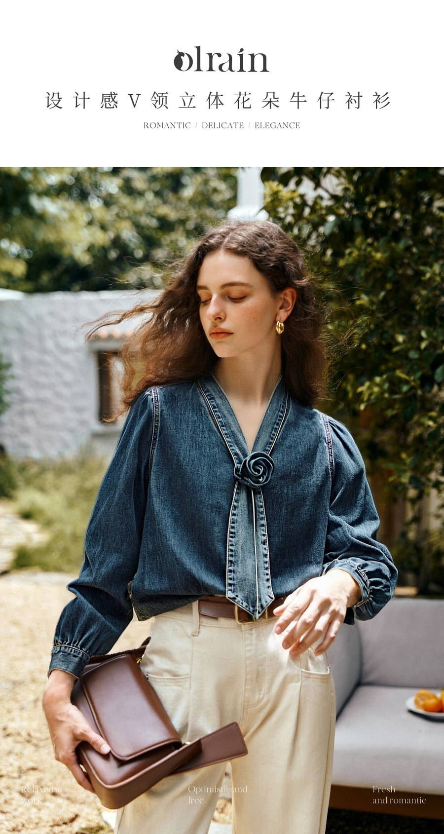 OLrain欧芮儿2025新款女秋季设计感立体花朵V领衬衣长袖牛仔衬衫