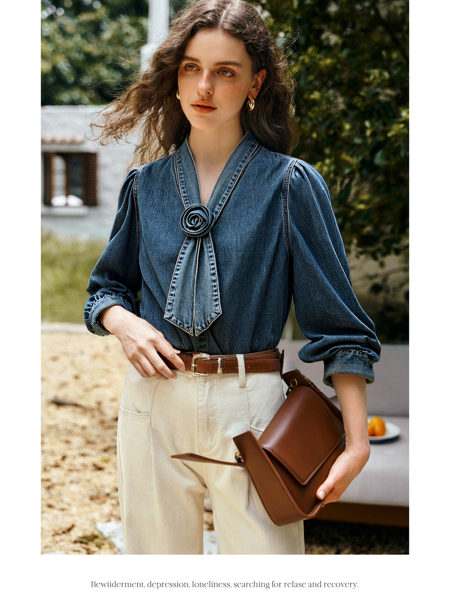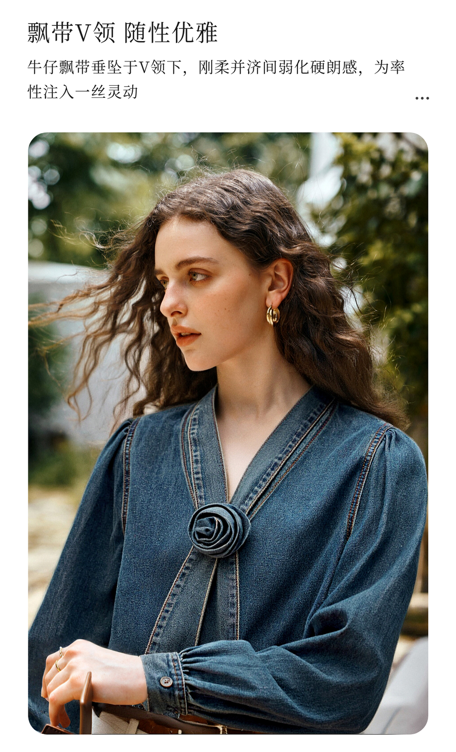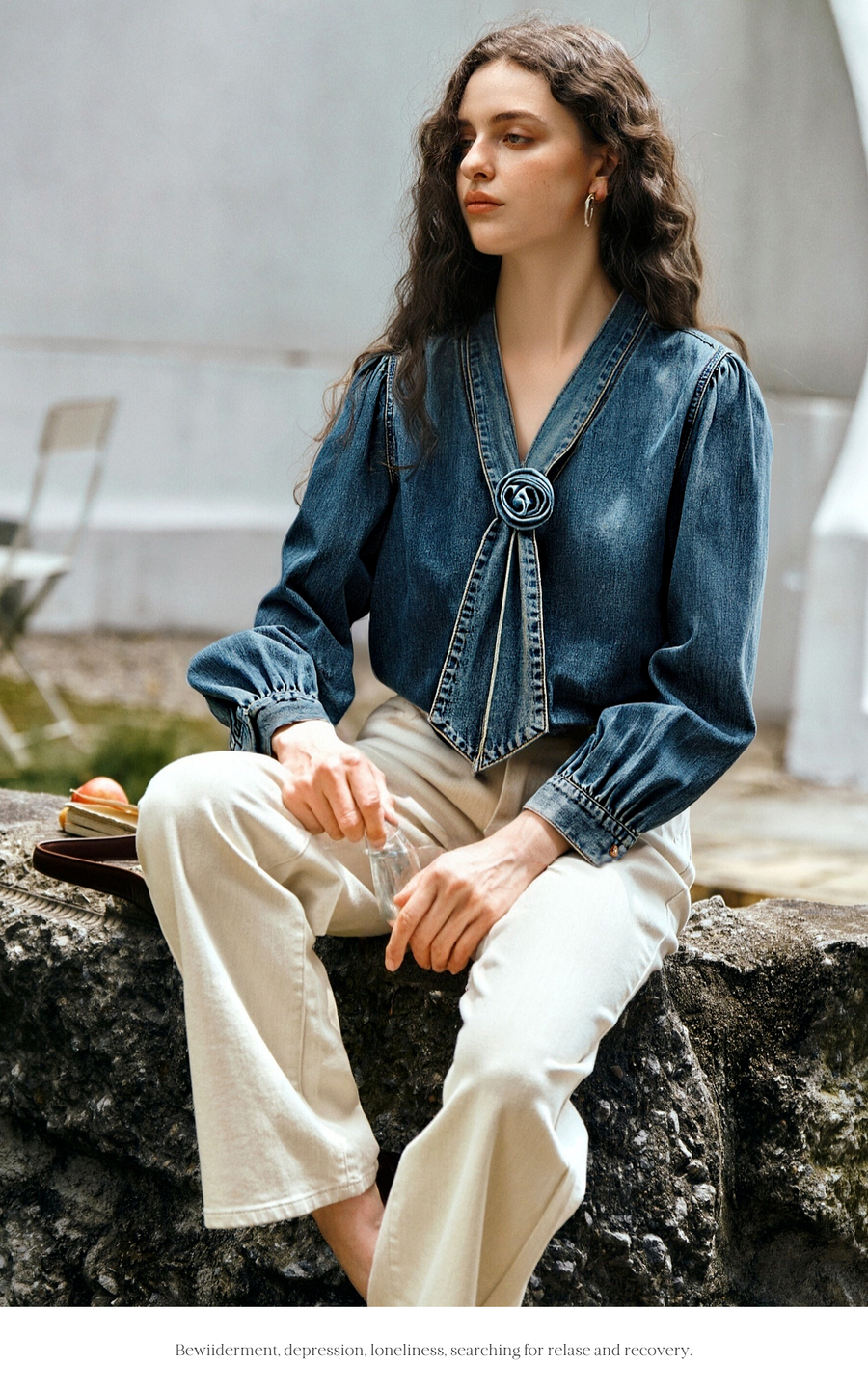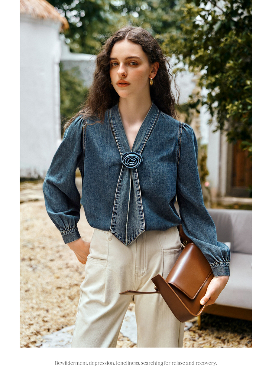 OLrain欧芮儿2025新款女秋季设计感立体花朵V领衬衣长袖牛仔衬衫