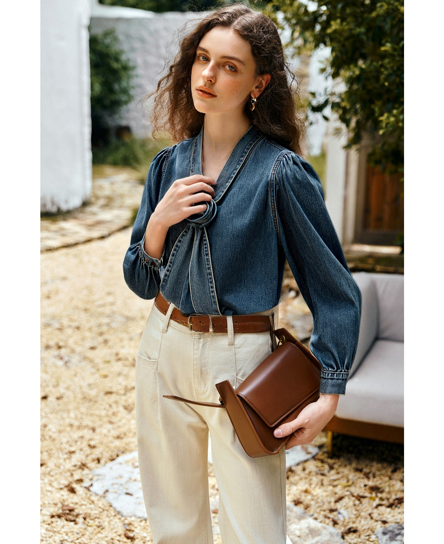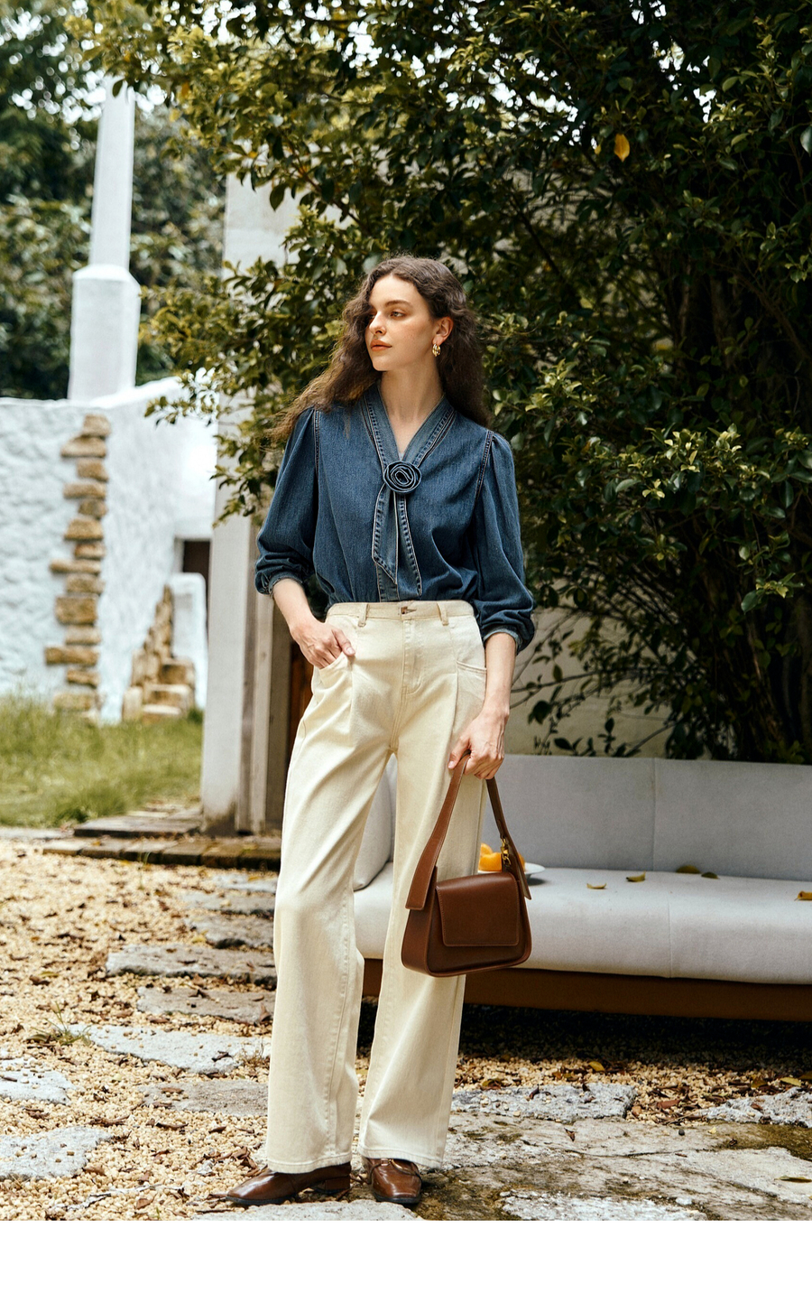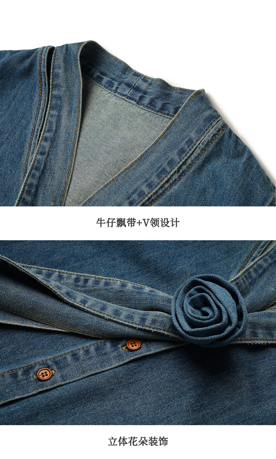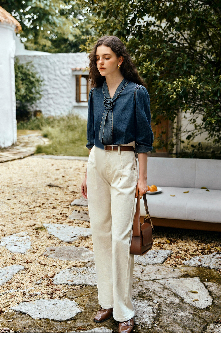 OLrain欧芮儿2025新款女秋季设计感立体花朵V领衬衣长袖牛仔衬衫