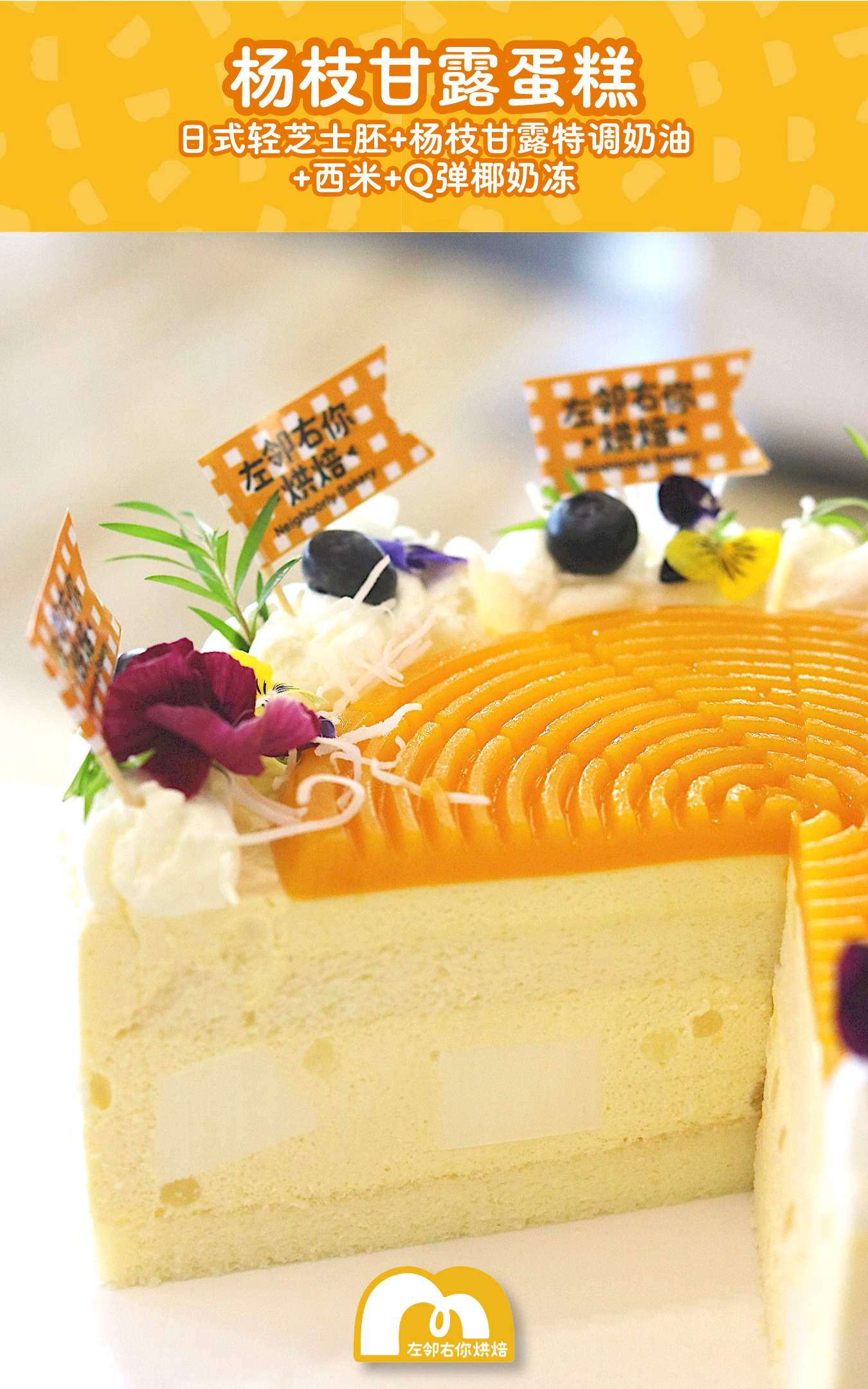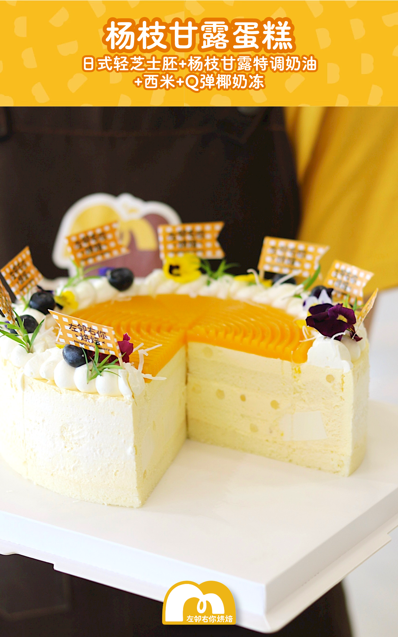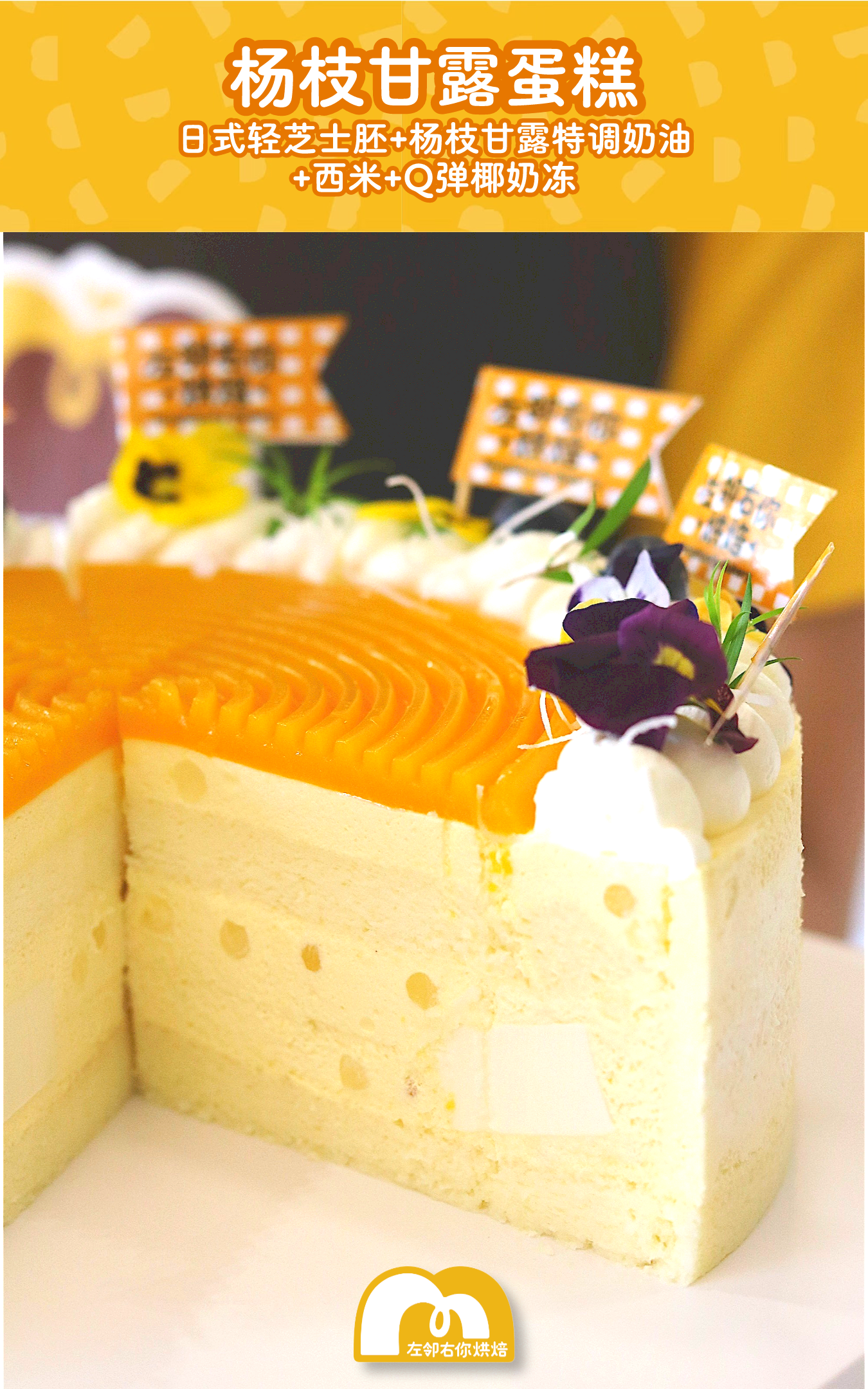 【日式轻芝士胚+杨枝甘露特调奶油+西米+Q弹椰奶冻 】外层装饰是黄金芒果奶冻,与进口马斯卡彭淡奶油