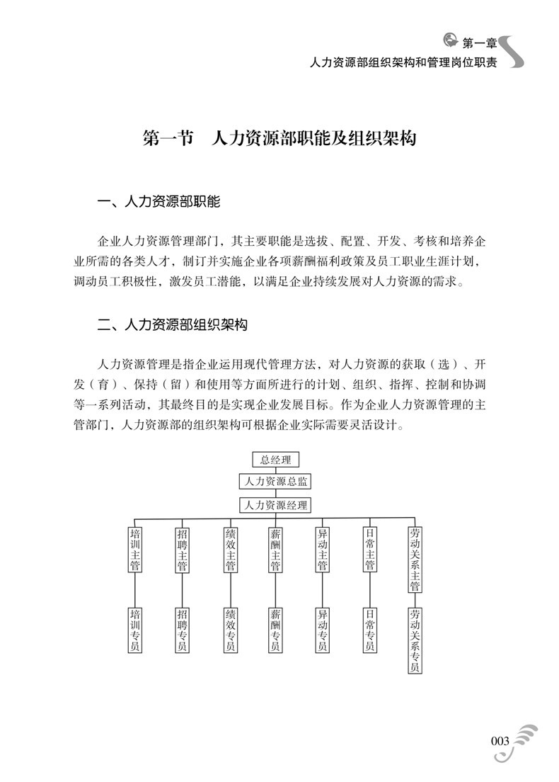 人力资源管理是指企业运用现代管理方法,对人力资源的获取(选)、开发(育)、保持(留)和使用等方面所进行的计划、组织、指挥、控制和协调等一系列活动,其最终目的是实现企业发展目标。作为企业人力资源管理的主管部门,人力资源部的组织架构可根据企业实际需要灵活设计。