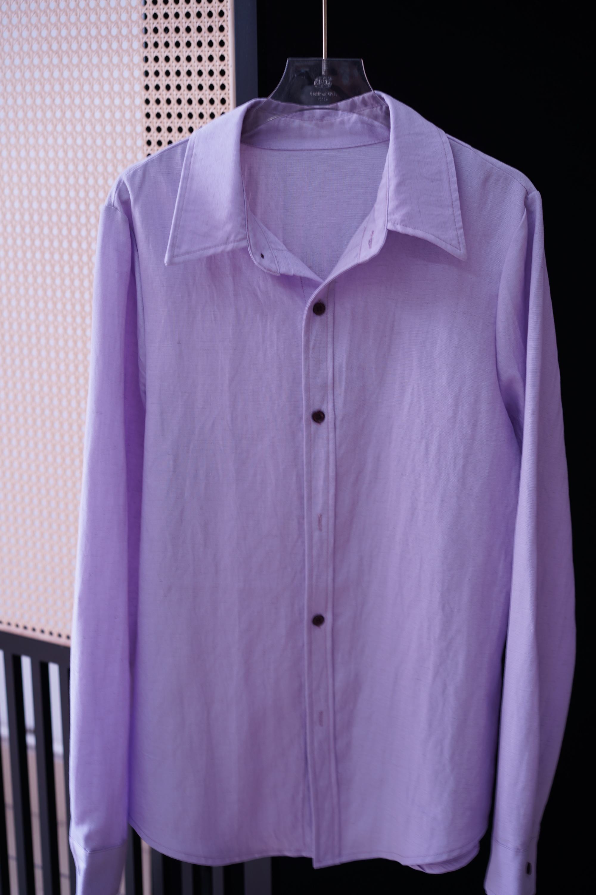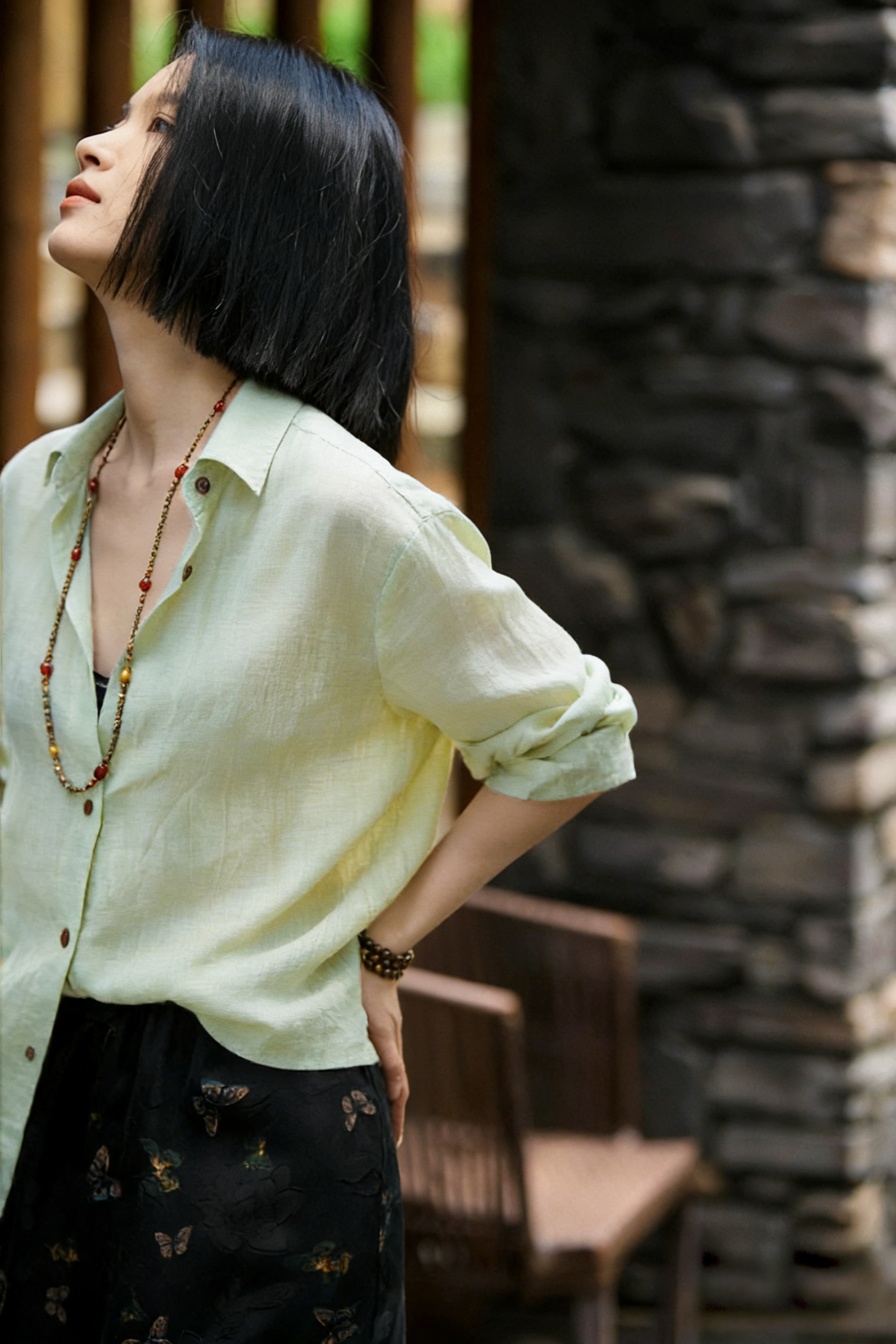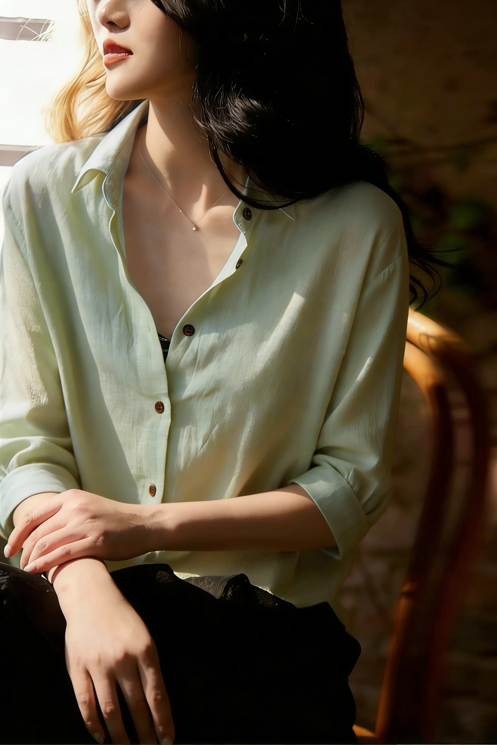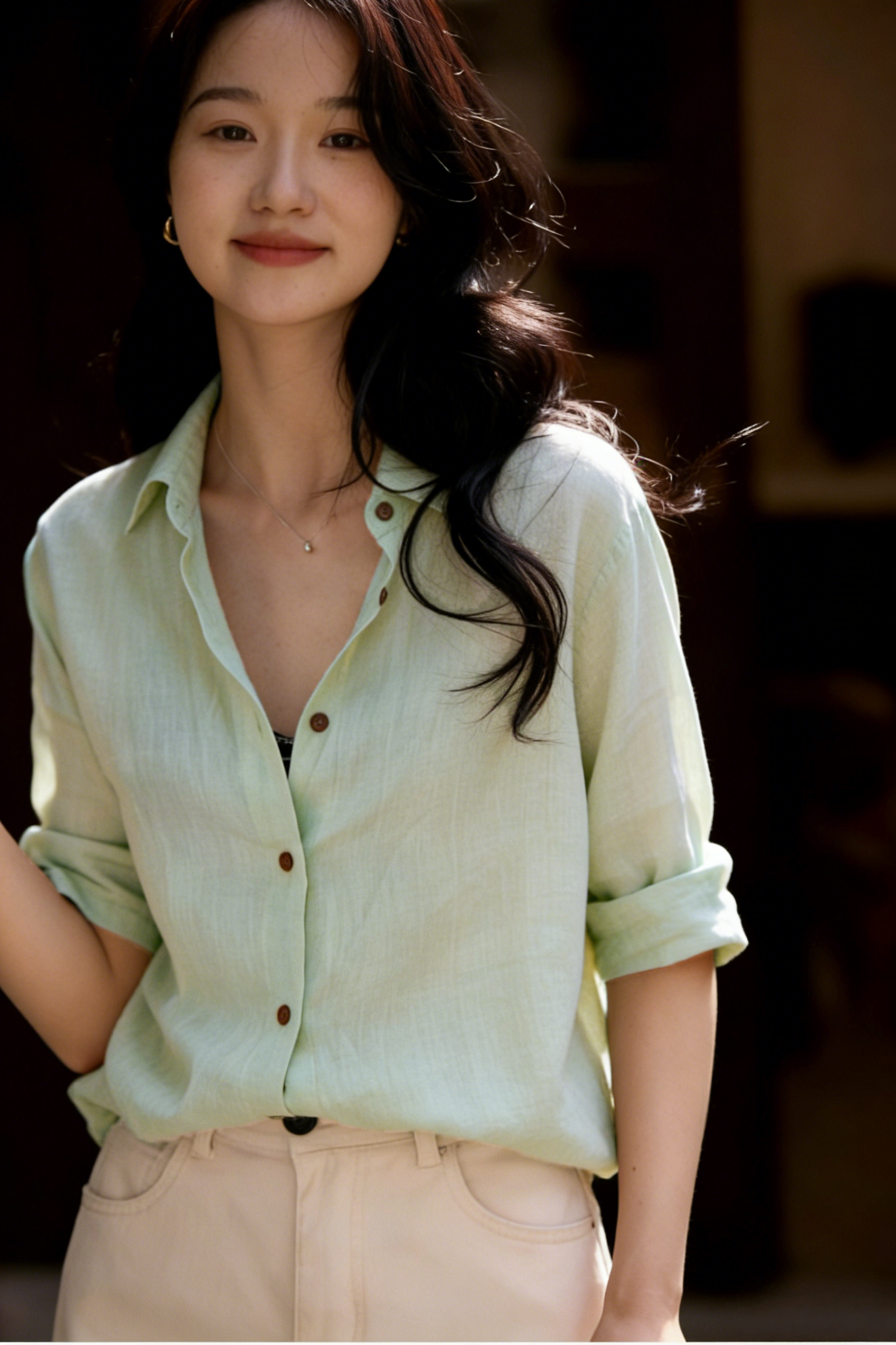 【3-7天发货】松弛感拉满的夏日刚需,烟熏紫&曼波绿天丝亚麻长袖衬衫,显白微宽松版型藏肉,翻领设计修饰脖颈线条,单穿叠穿都高级