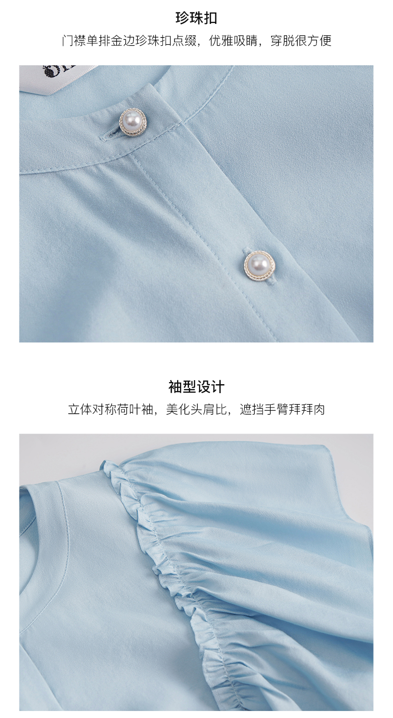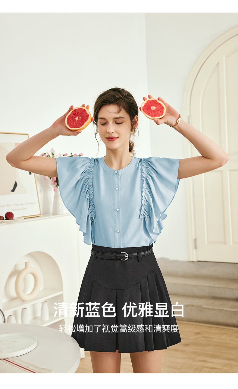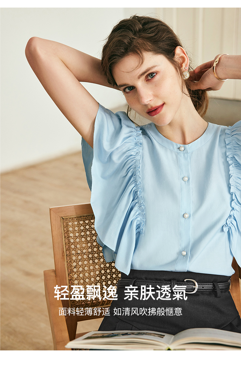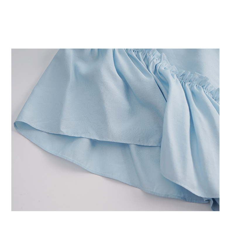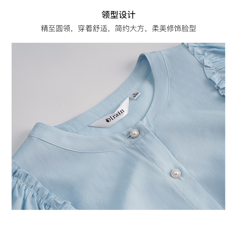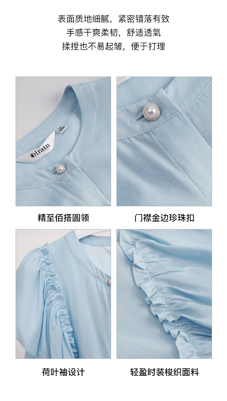 OLrain欧芮儿法式蓝色蕾丝雪纺衫女夏季2023年新款荷叶边薄款小衫