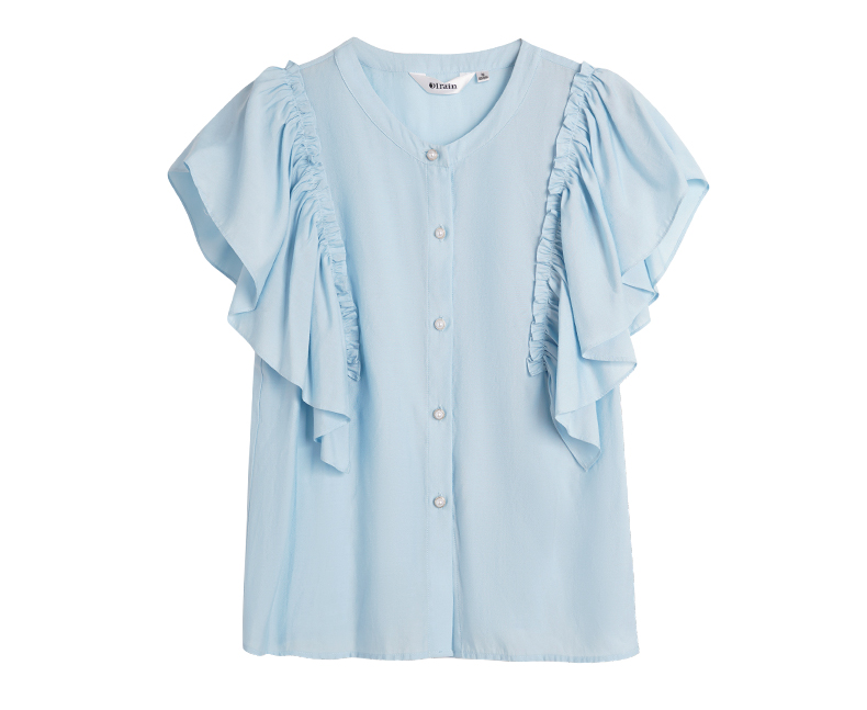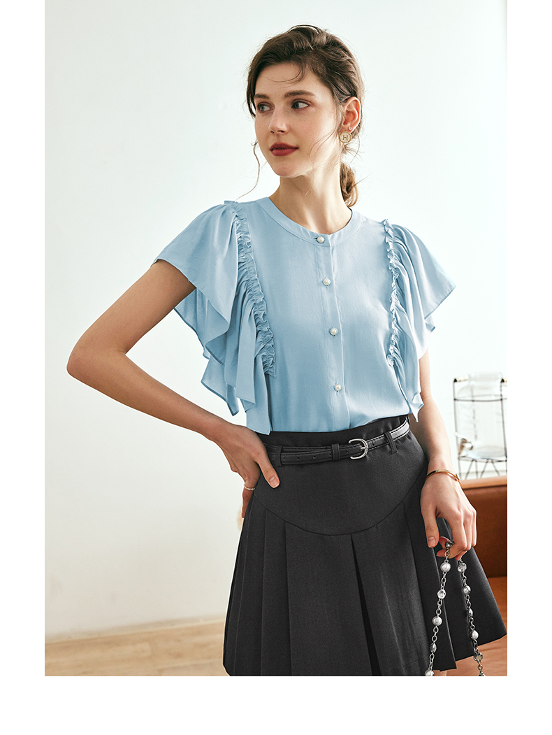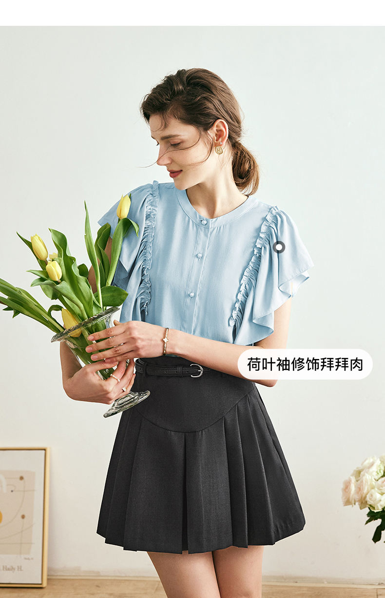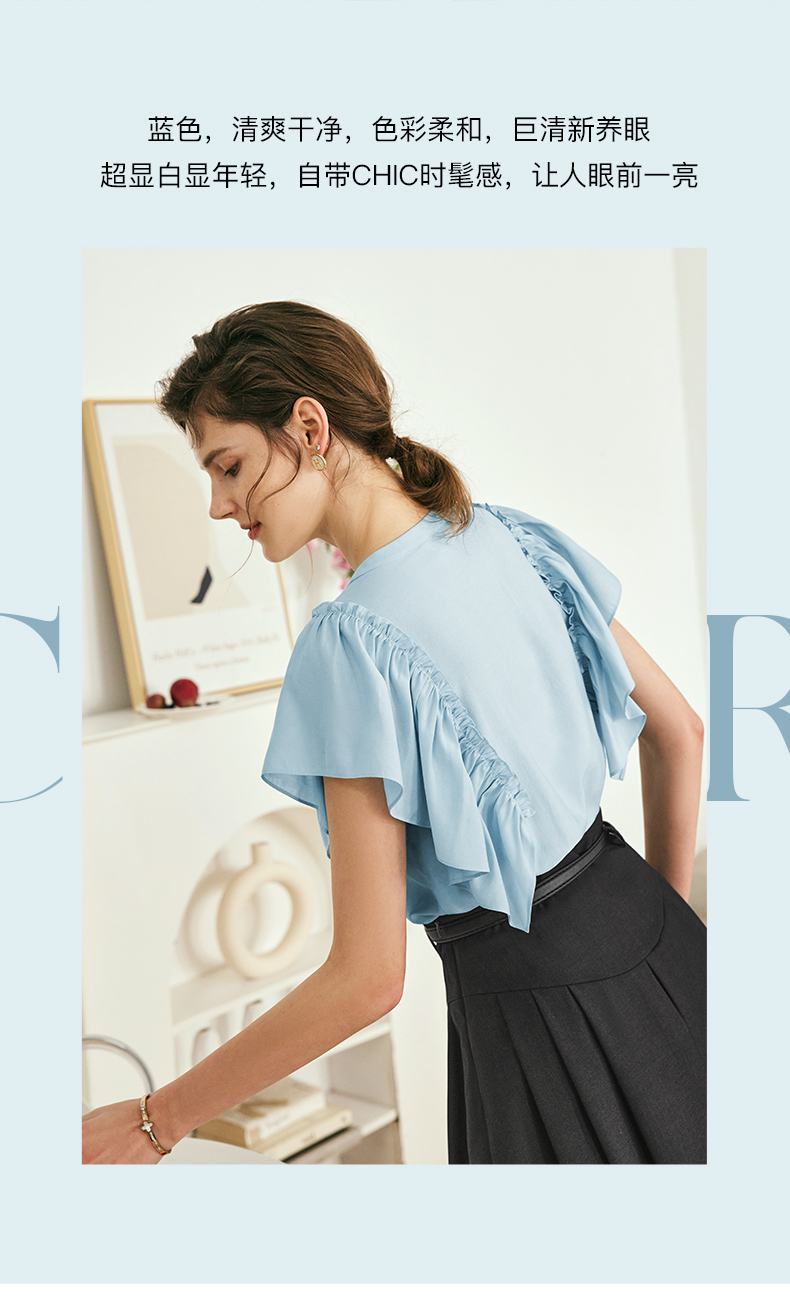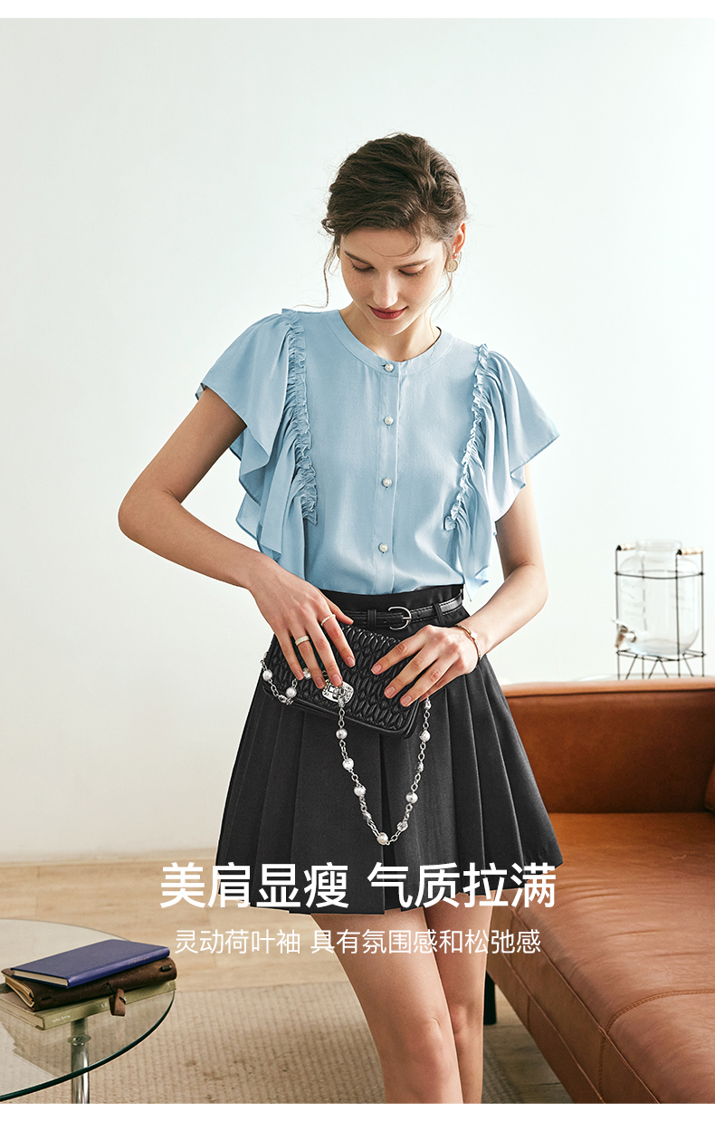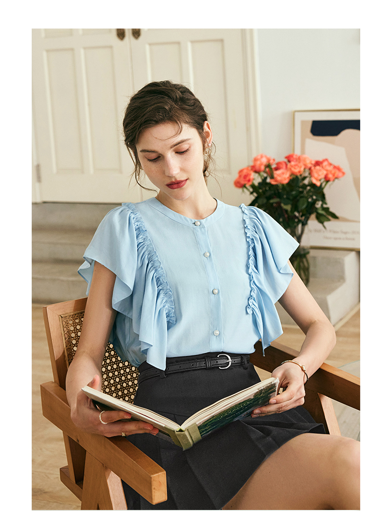 OLrain欧芮儿法式蓝色蕾丝雪纺衫女夏季2023年新款荷叶边薄款小衫