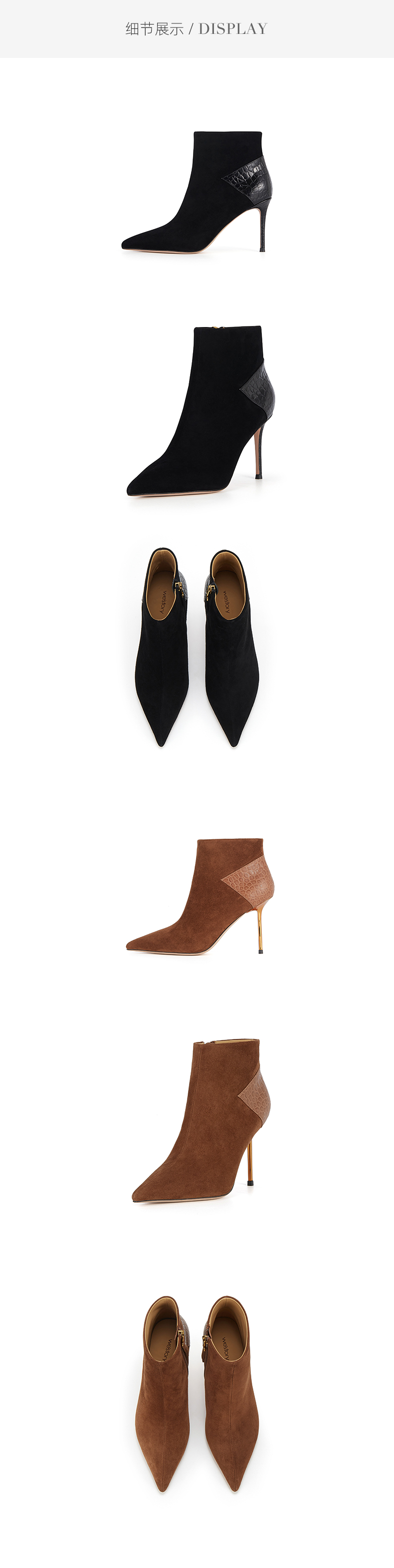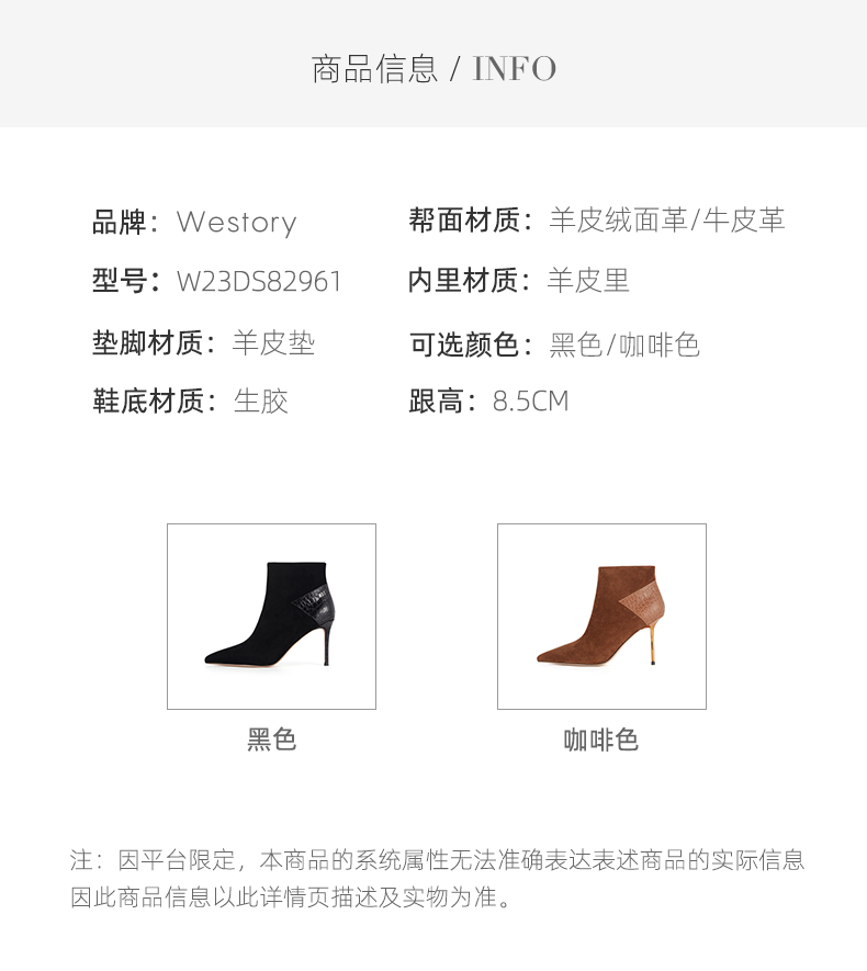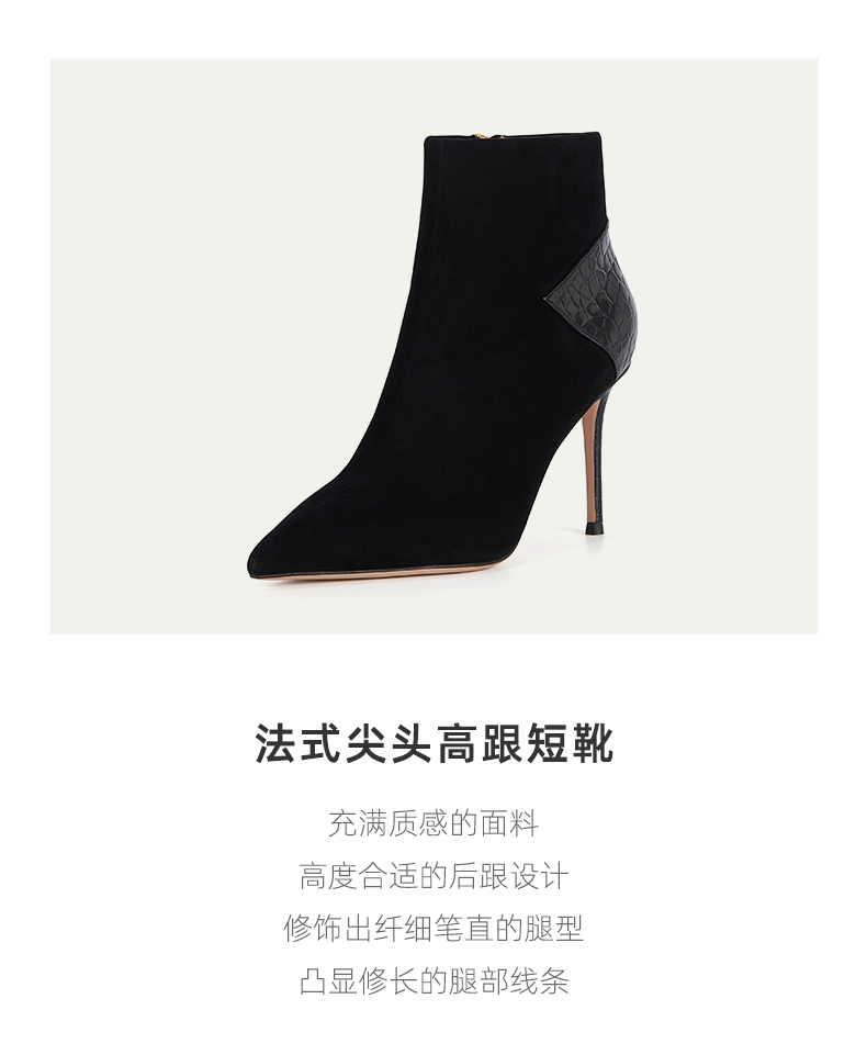westory欧美范儿拼接4寸女靴女王鞋法式尖头高跟短靴真皮气质细跟短筒靴W23DS82961