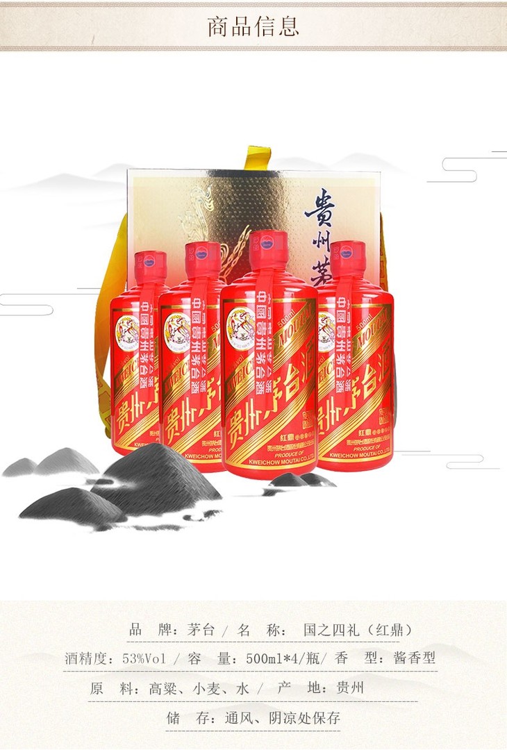 53度 贵州茅台酒 国之四礼 红鼎 500ml*4瓶 礼盒套装