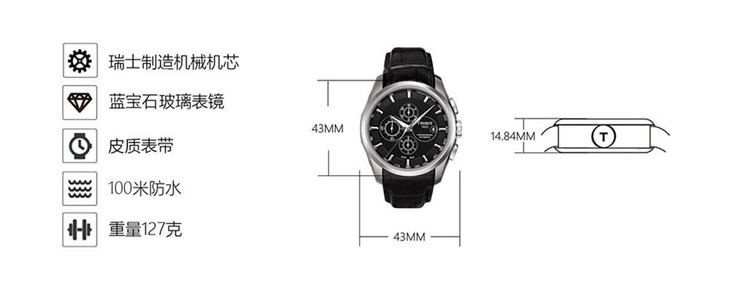 | 防水 | 100 m | 表带 | 黑色皮质表带 按钮式蝴蝶扣 |