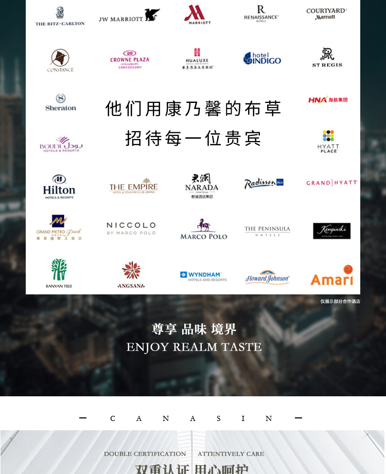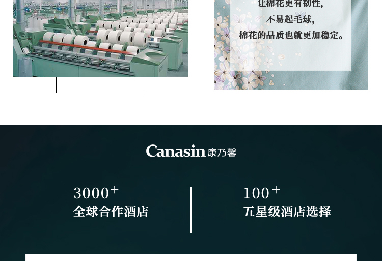 源自五星级酒店的奢华家纺品牌,康乃馨首次提出打造“酒店+家纺”的全新概念,将更为严格的五星级酒店纺织品品质标准与家纺相结合,完美诠释“酒店品质家纺”的舒适感受与奢华品味。