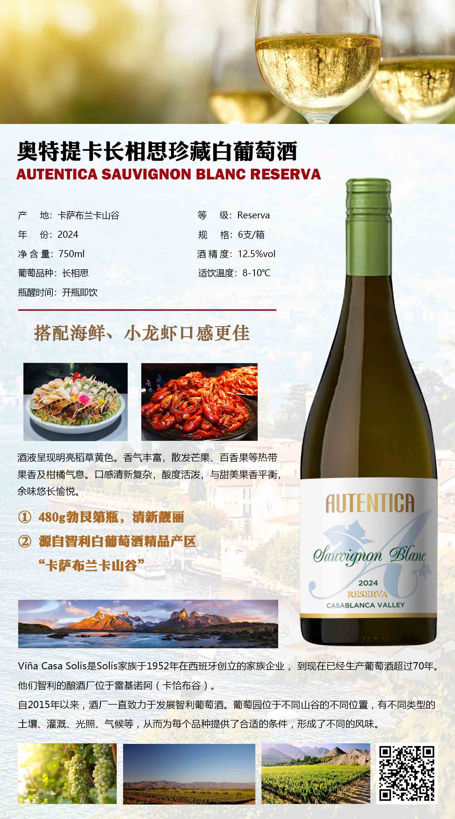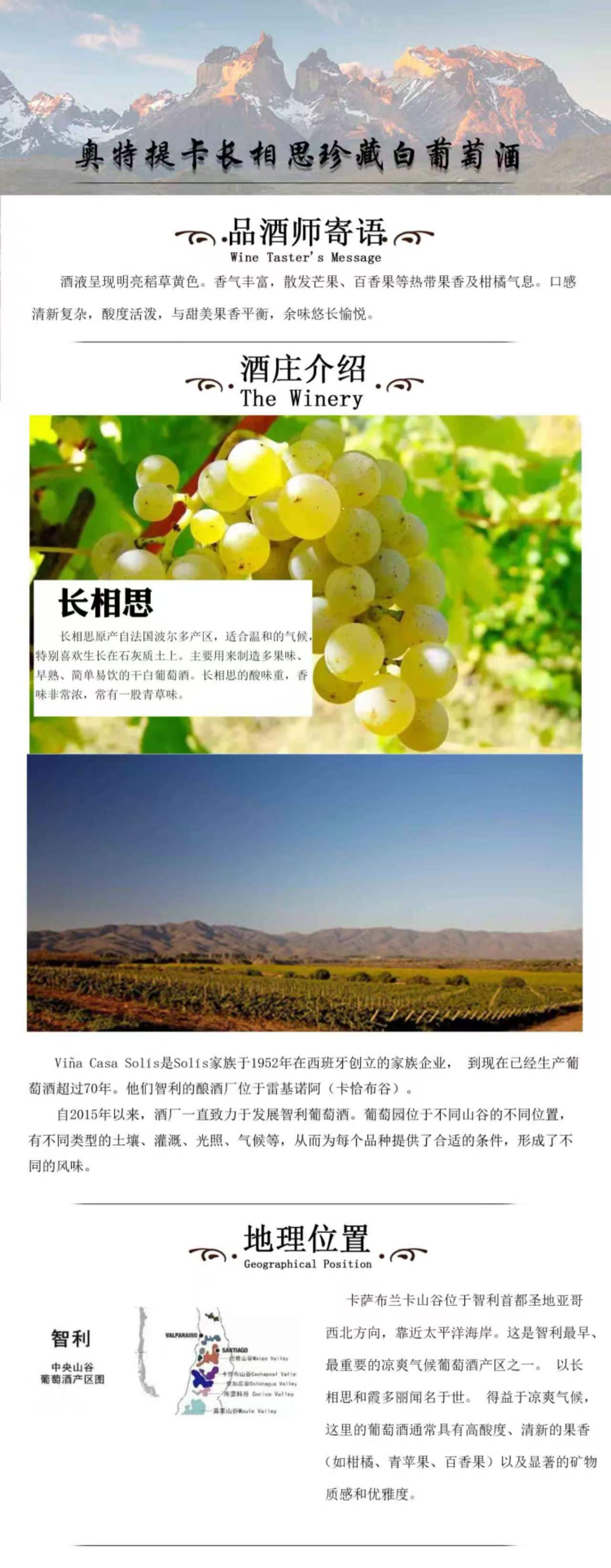 智利卡萨布兰卡山谷长相思珍藏白葡萄酒12.5%vol六支装