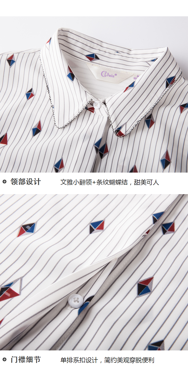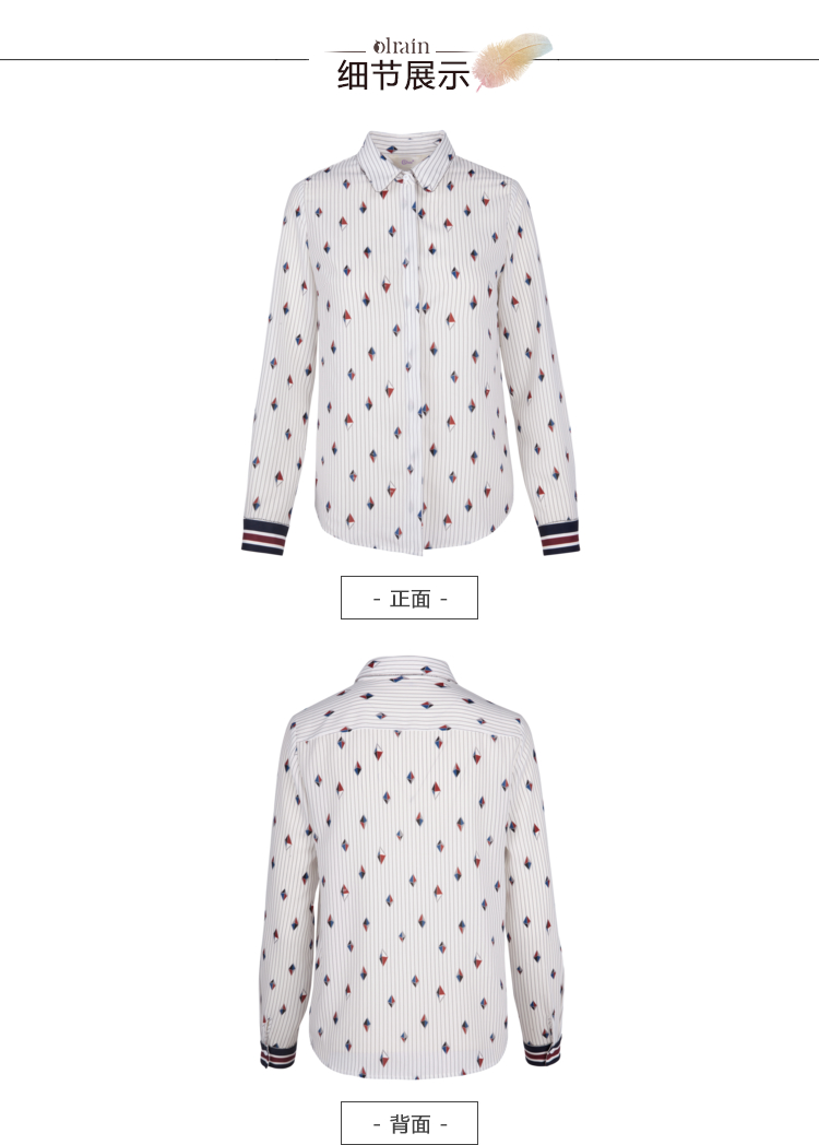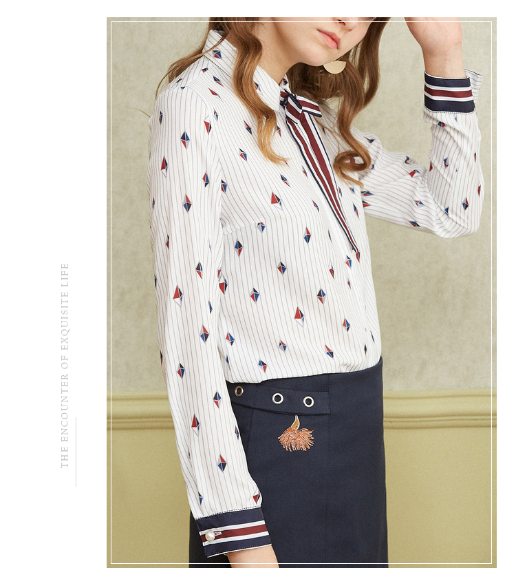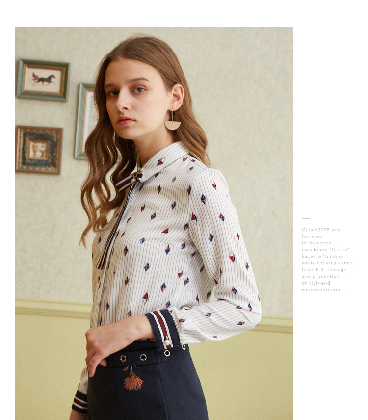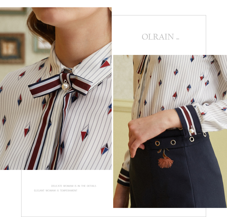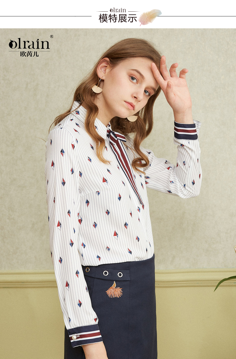 欧芮儿2018秋装新款显瘦图案印花方领衬衣女打底条纹衬衫女长袖