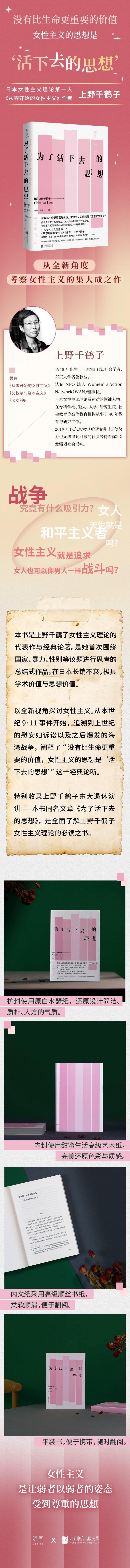 《为了活下去的思想》是日本女性主义理论先驱上野千鹤子,围绕国家、暴力、性别等议题进行思考的总结式作品。她从本世纪的9·11事件开始,追溯到上世纪的慰安妇诉讼以及之后爆发的海湾战争,在这些暴力事件中,思考性别这一不确定因素在国家和暴力体系的新构成中是如何发挥作用的。她发出了“逃出去,活下去!”的呼号,进一步确认与阐释了“女性主义是让弱者以弱者的姿态受到尊重的思想。”