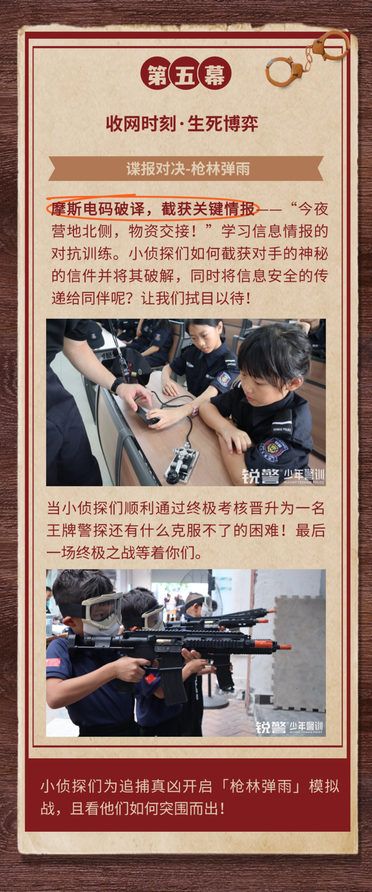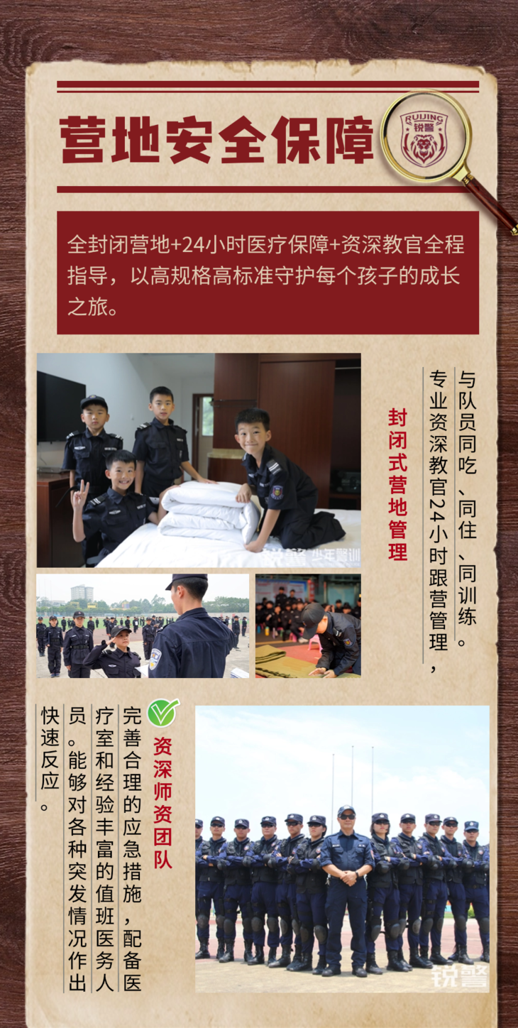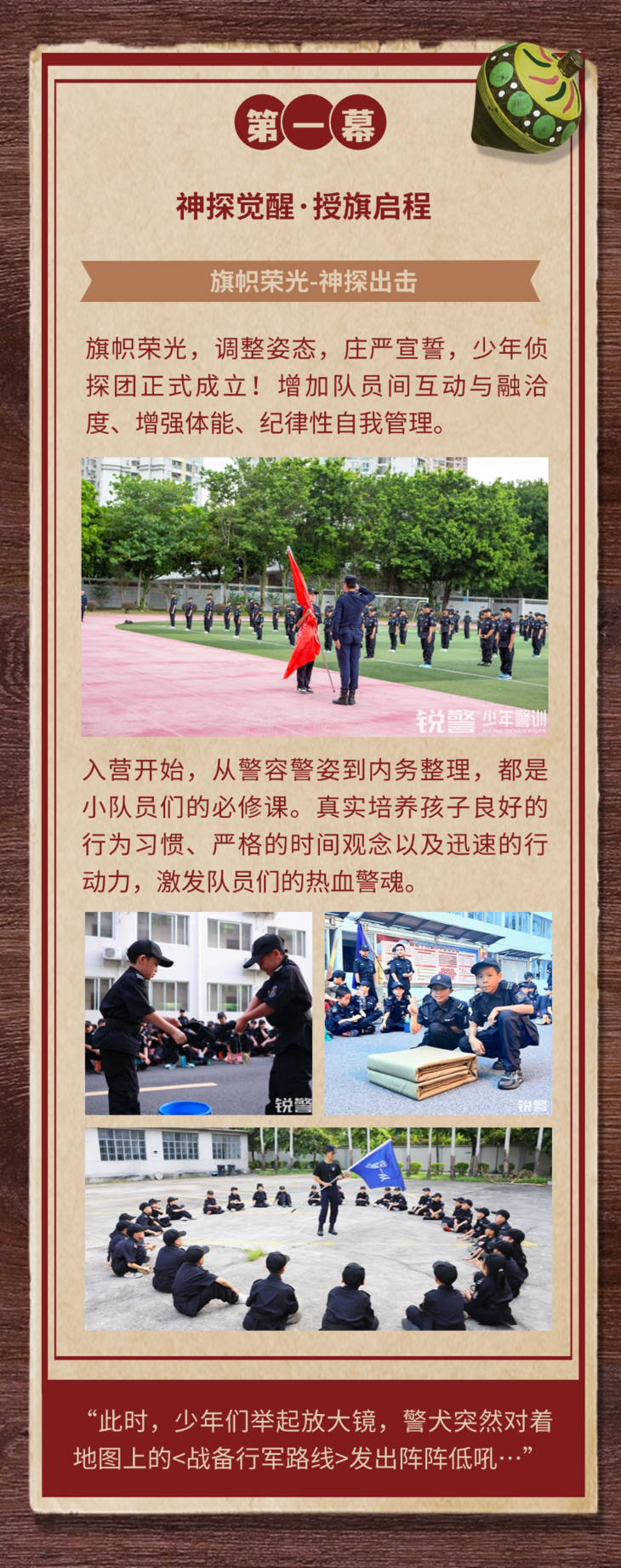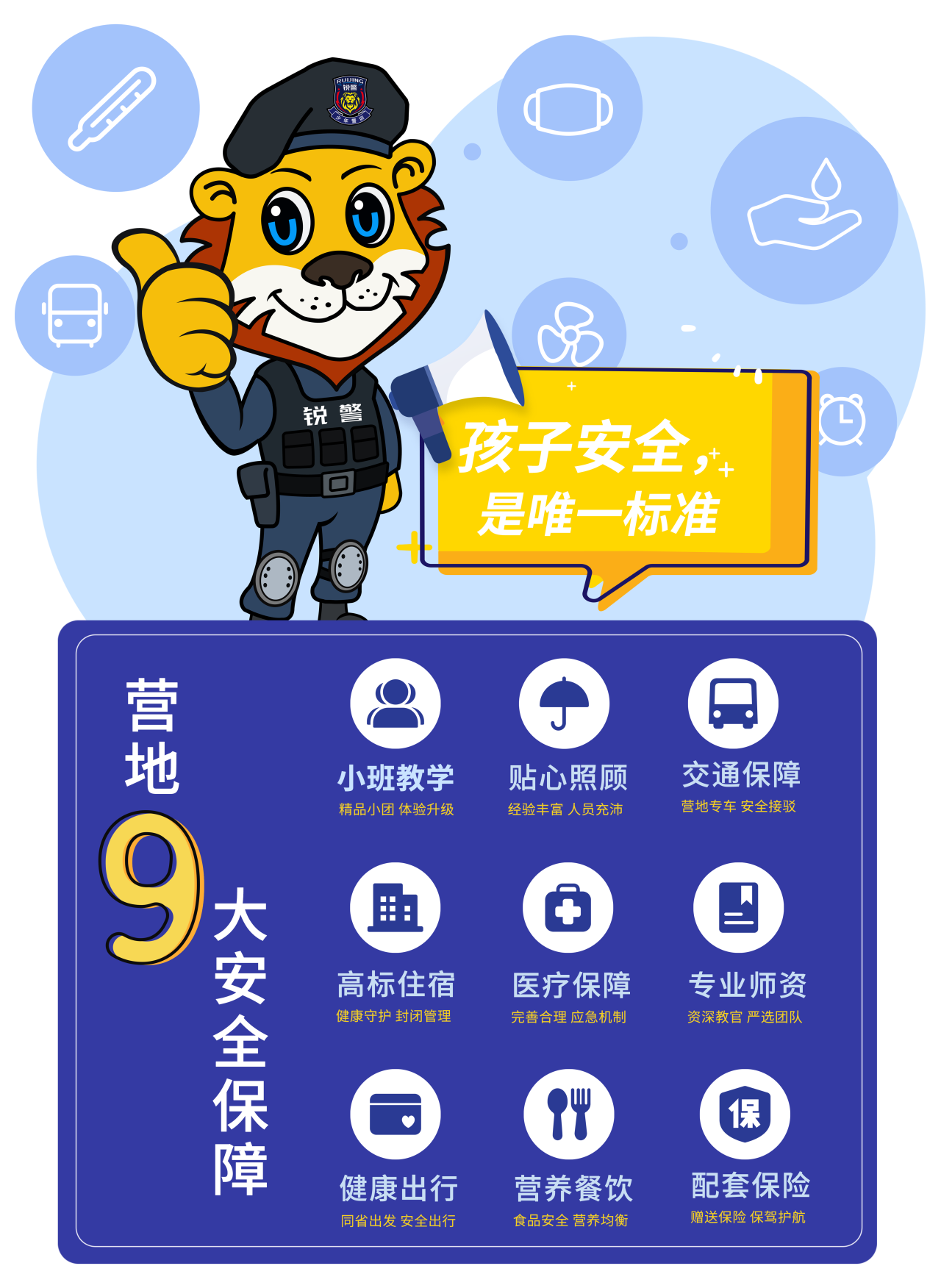 - 锐警少年警训致力于打造“营地教育+安全教育”领航品牌。以专业的警务特色课程体系,为青少年提供沉浸式安全教育,锻造外展自我、内拓素质的现代英武少年。