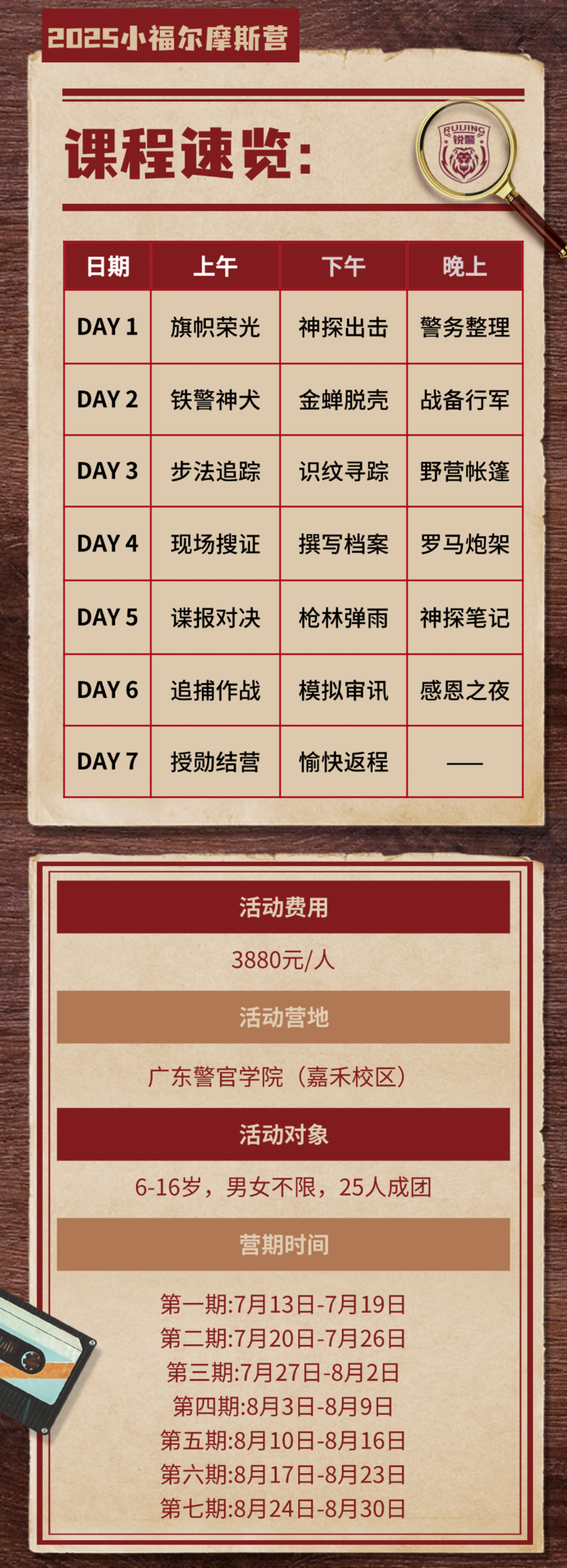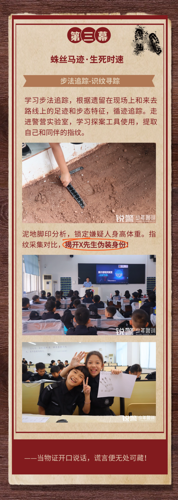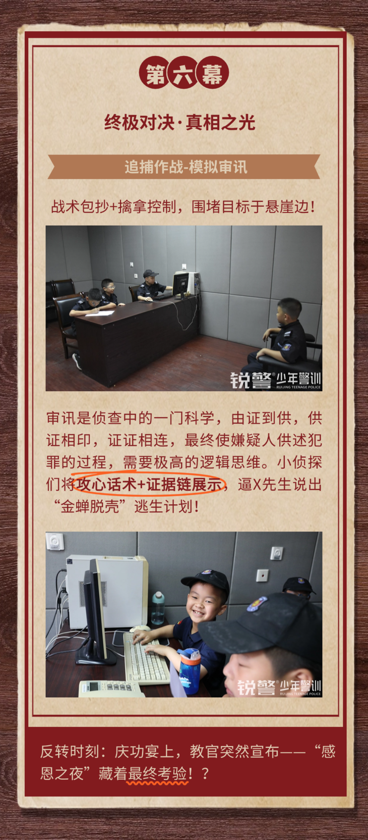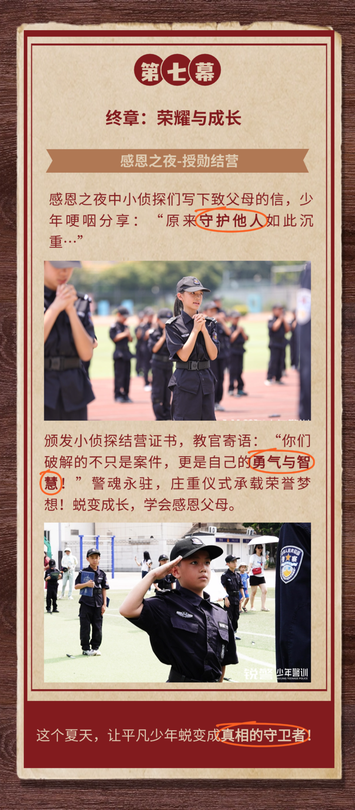 - 锐警少年警训致力于打造“营地教育+安全教育”领航品牌。以专业的警务特色课程体系,为青少年提供沉浸式安全教育,锻造外展自我、内拓素质的现代英武少年。