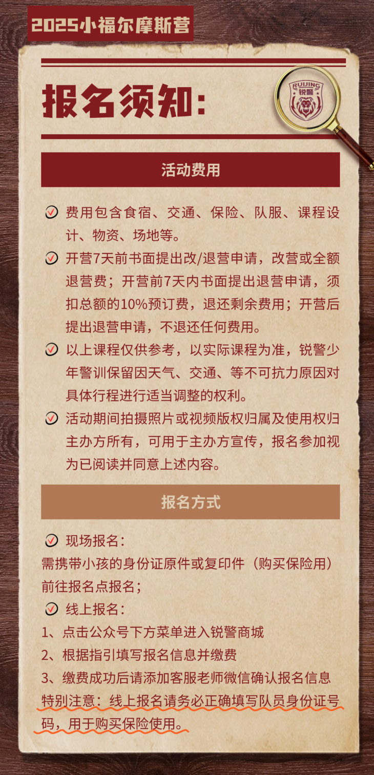 营员通过网络页面报名或以其他方式接受《锐警少年警训冬夏令营报名须知》,即表示营员与本司已达成协议并同意接受报名须知的全部约定内容以及与报名须知有关的已经发布或将来可能发布的各项规则、页面提示、操作流程、公告或通知。