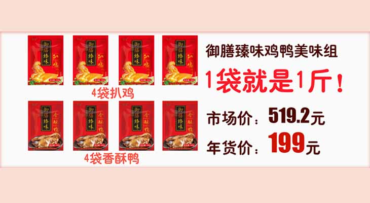 组件:扒鸡500g/袋*4,香酥鸭500g/袋*4