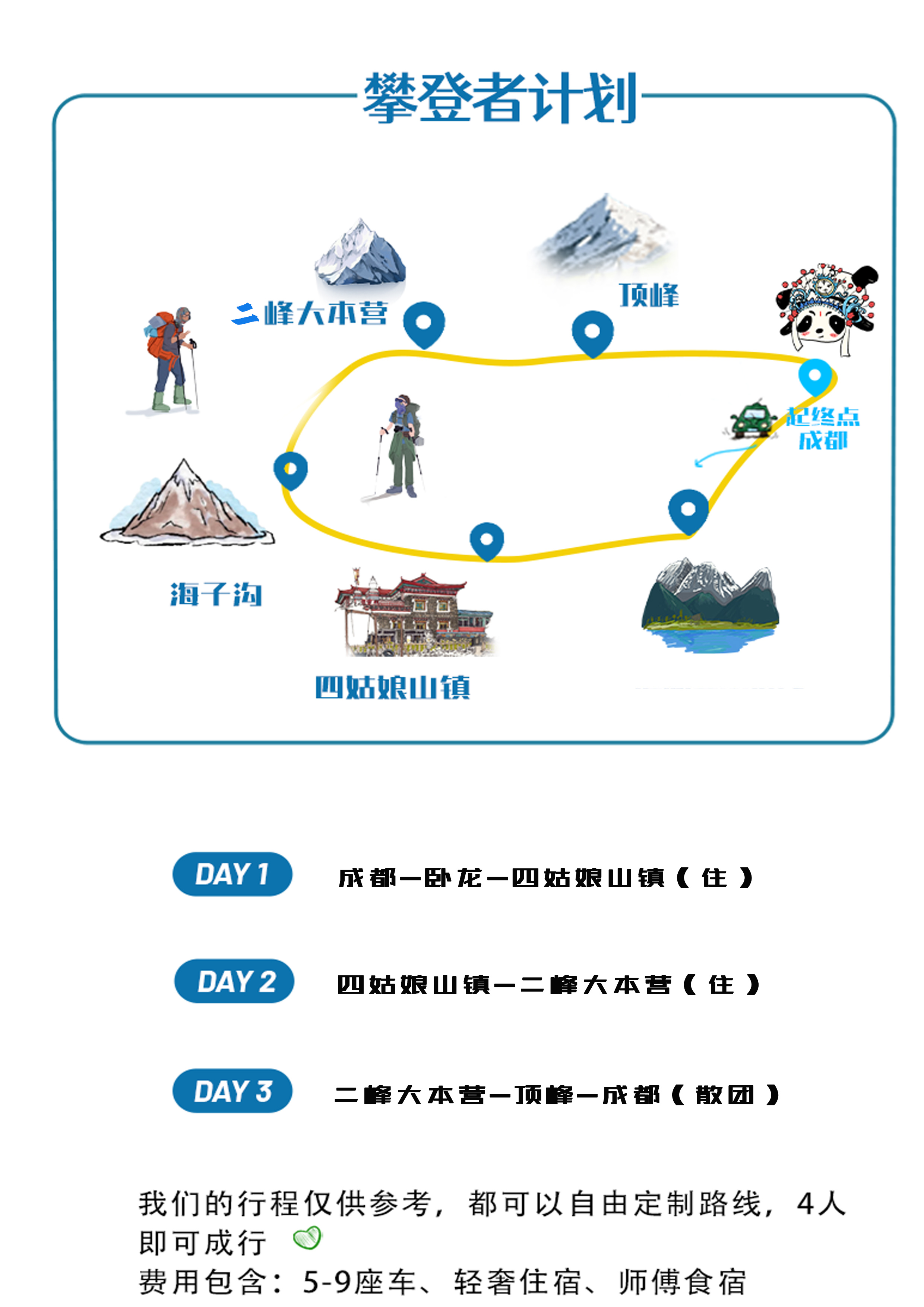 凌晨2:00起床,协作为队员准备早餐和烧开水。早餐后3:00出发冲顶,经过缓坡、大平台、碎石坡、垭口和冲顶道到达顶峰。大本营出发到顶峰全程5.5km,一般5-7小时登顶,在顶峰拍照留言后返回大本营,到达大本营后,收拾装备下山回到四姑娘山镇。然后乘坐车量,返回成都。