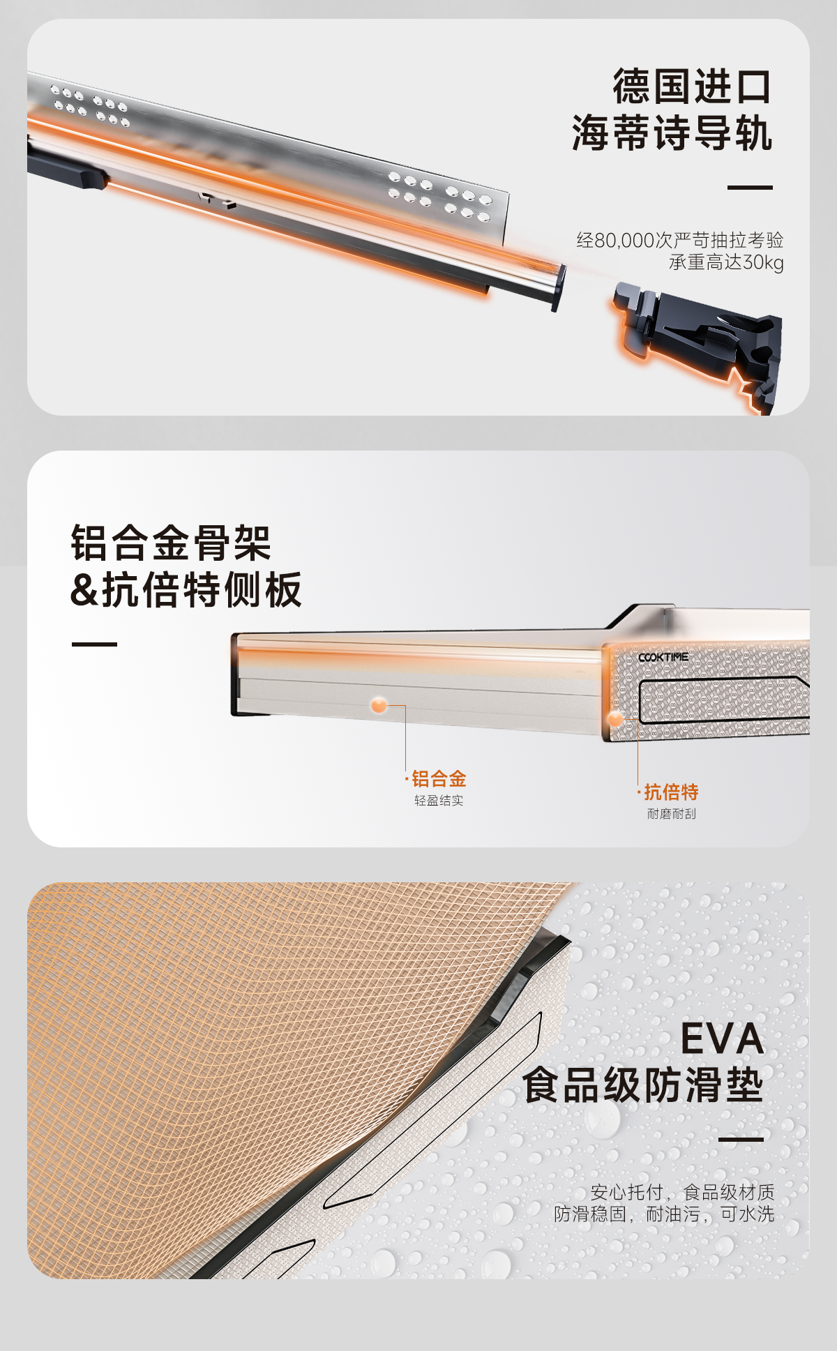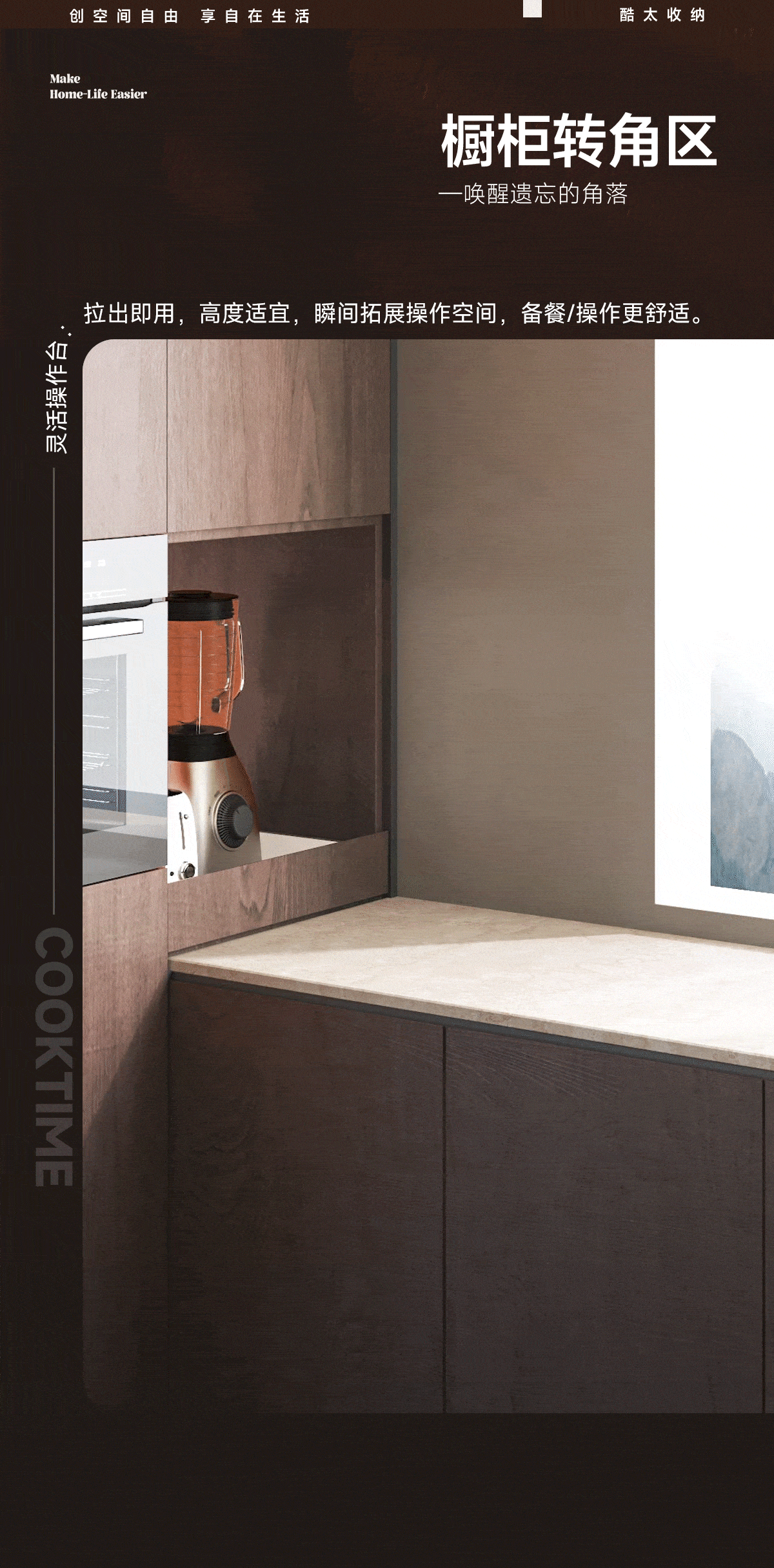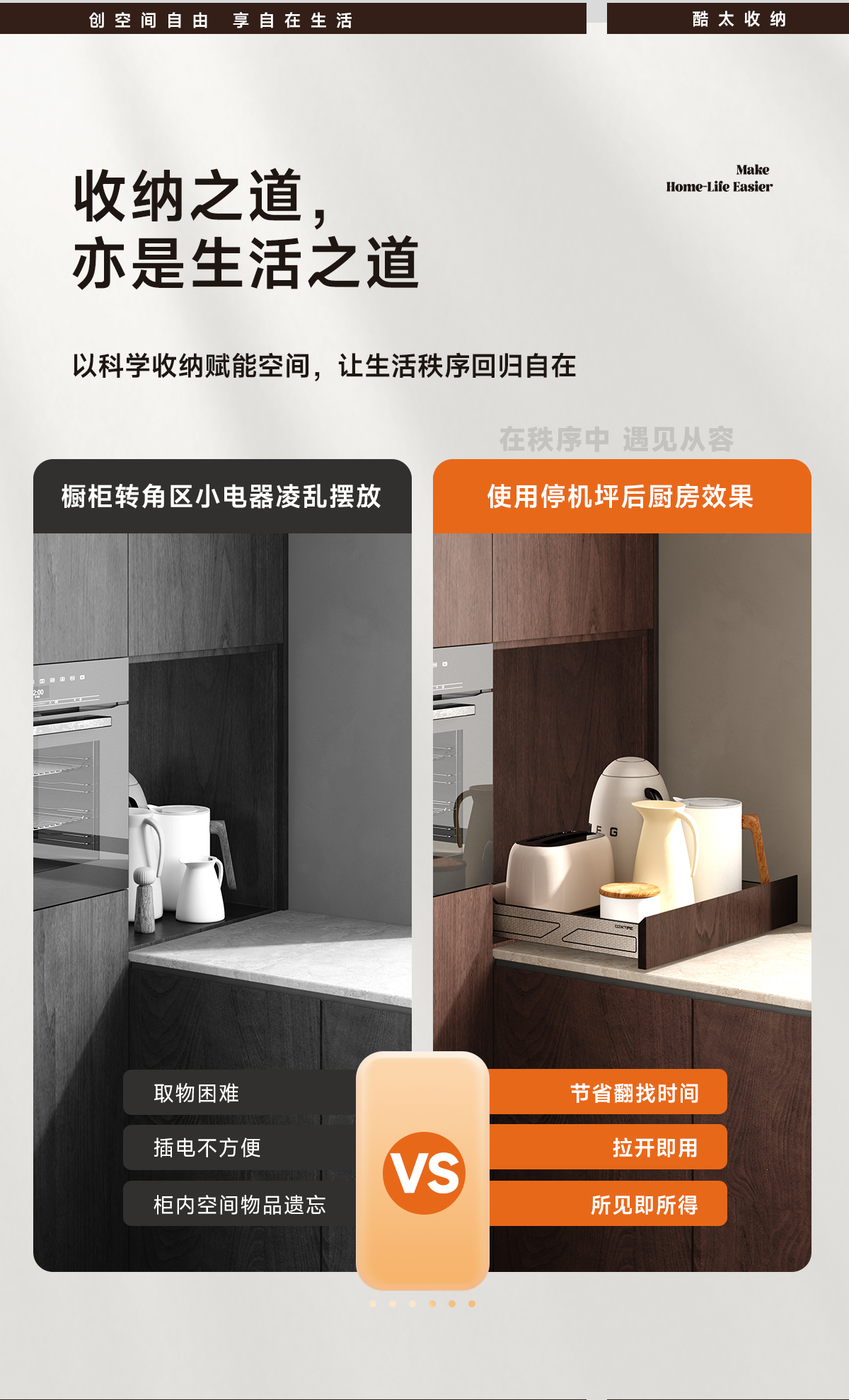 酷太坚持8年自主研发,已获得专利证书130项,拥有一套领先市场的厨房收纳系统,为千万中国家庭解决厨房脏乱差,缔造厨房新生活。