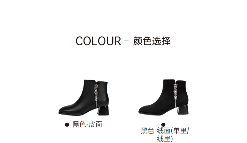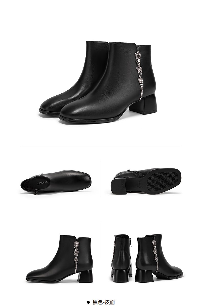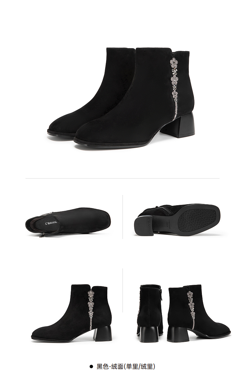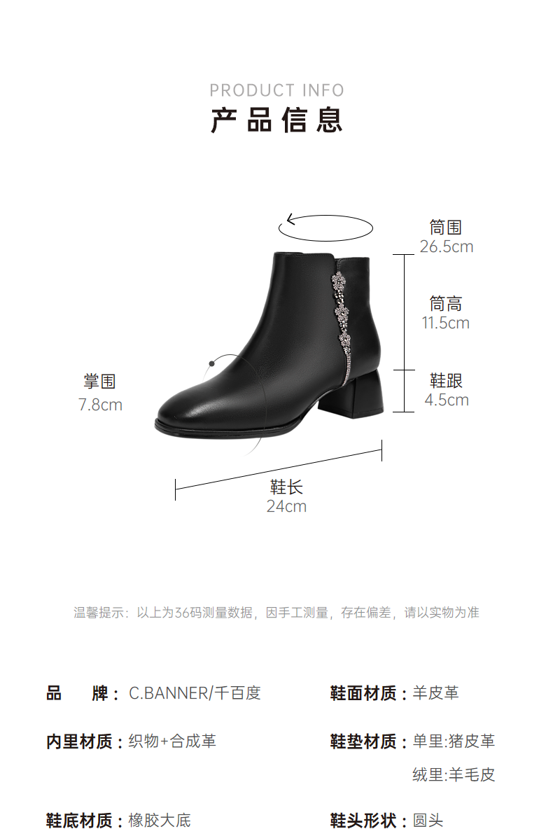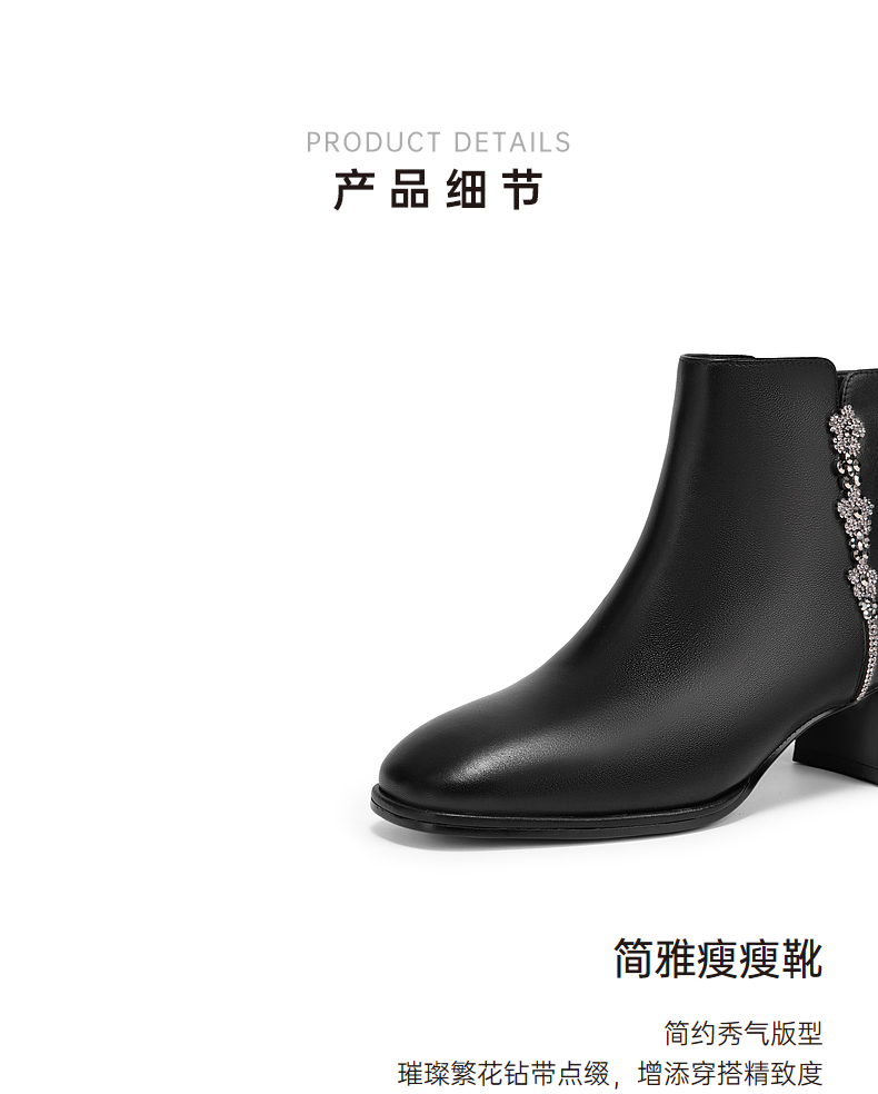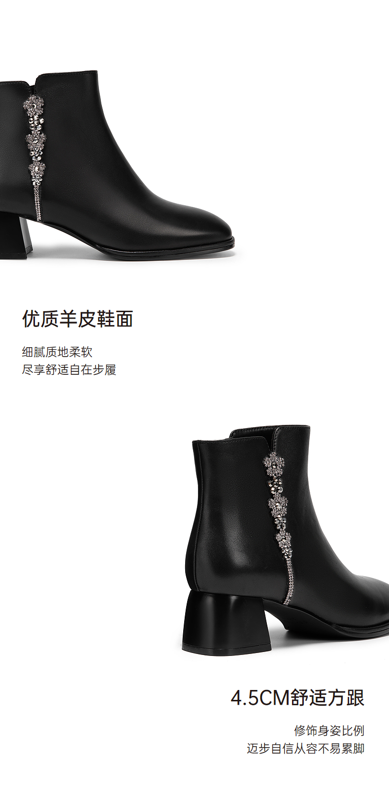 千百度羊皮钻带粗高跟时装靴女冬季通勤方跟洋气小短靴子A24576589