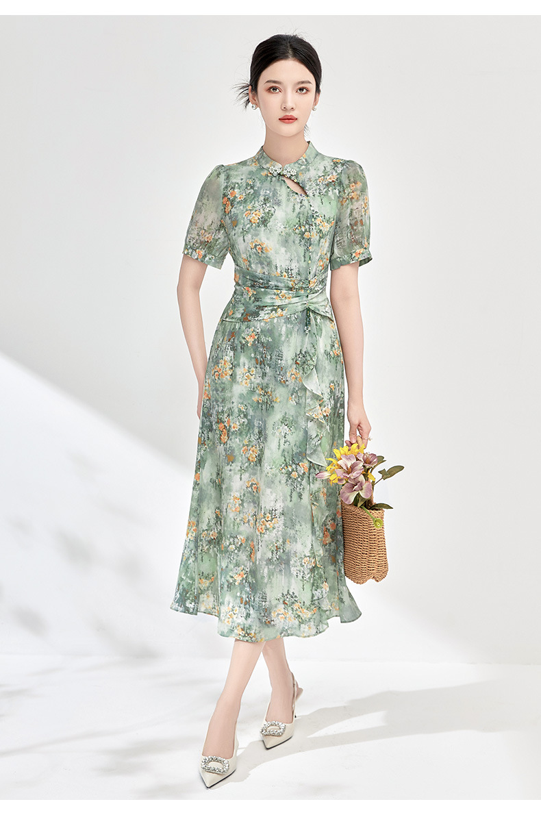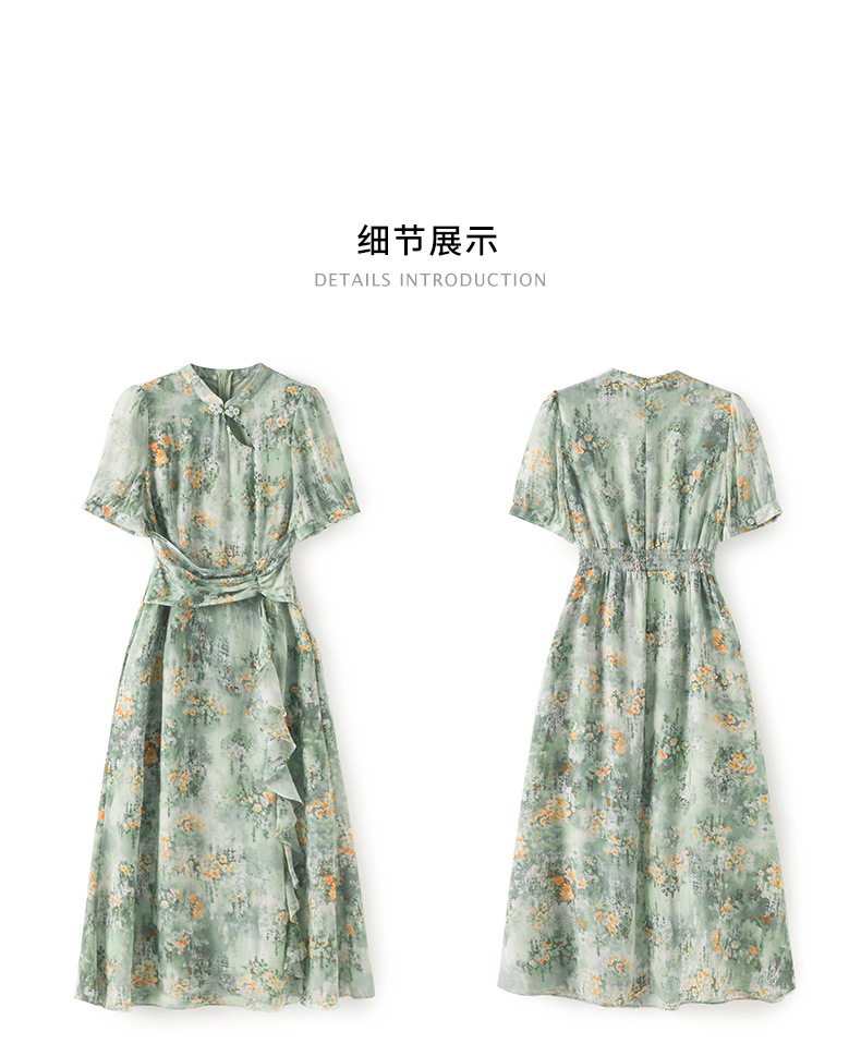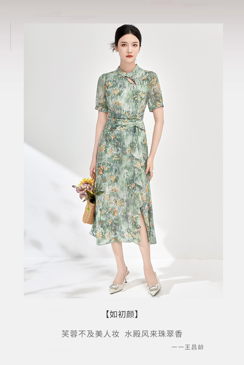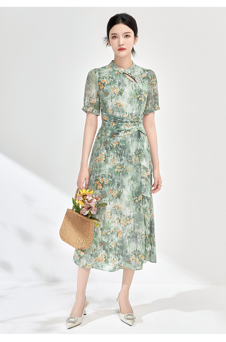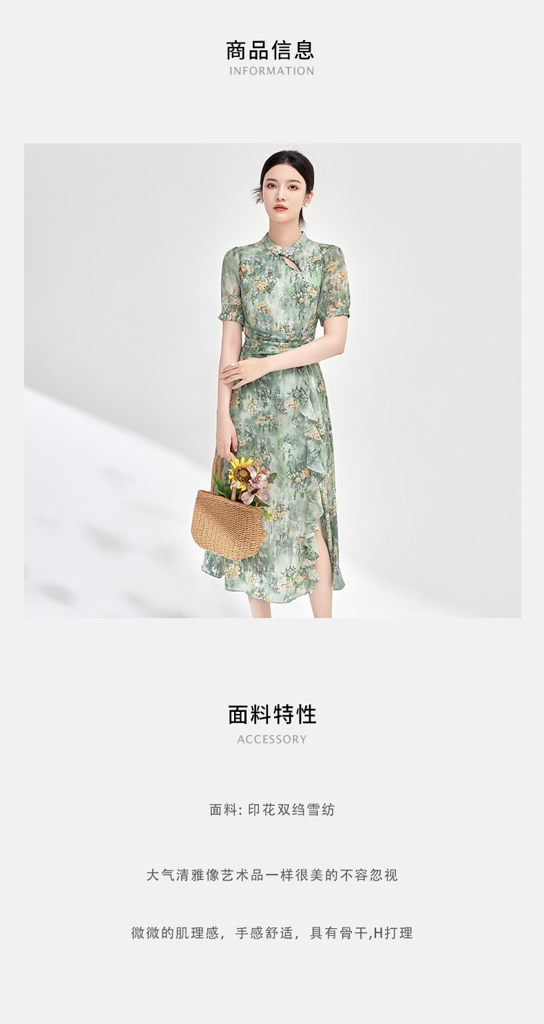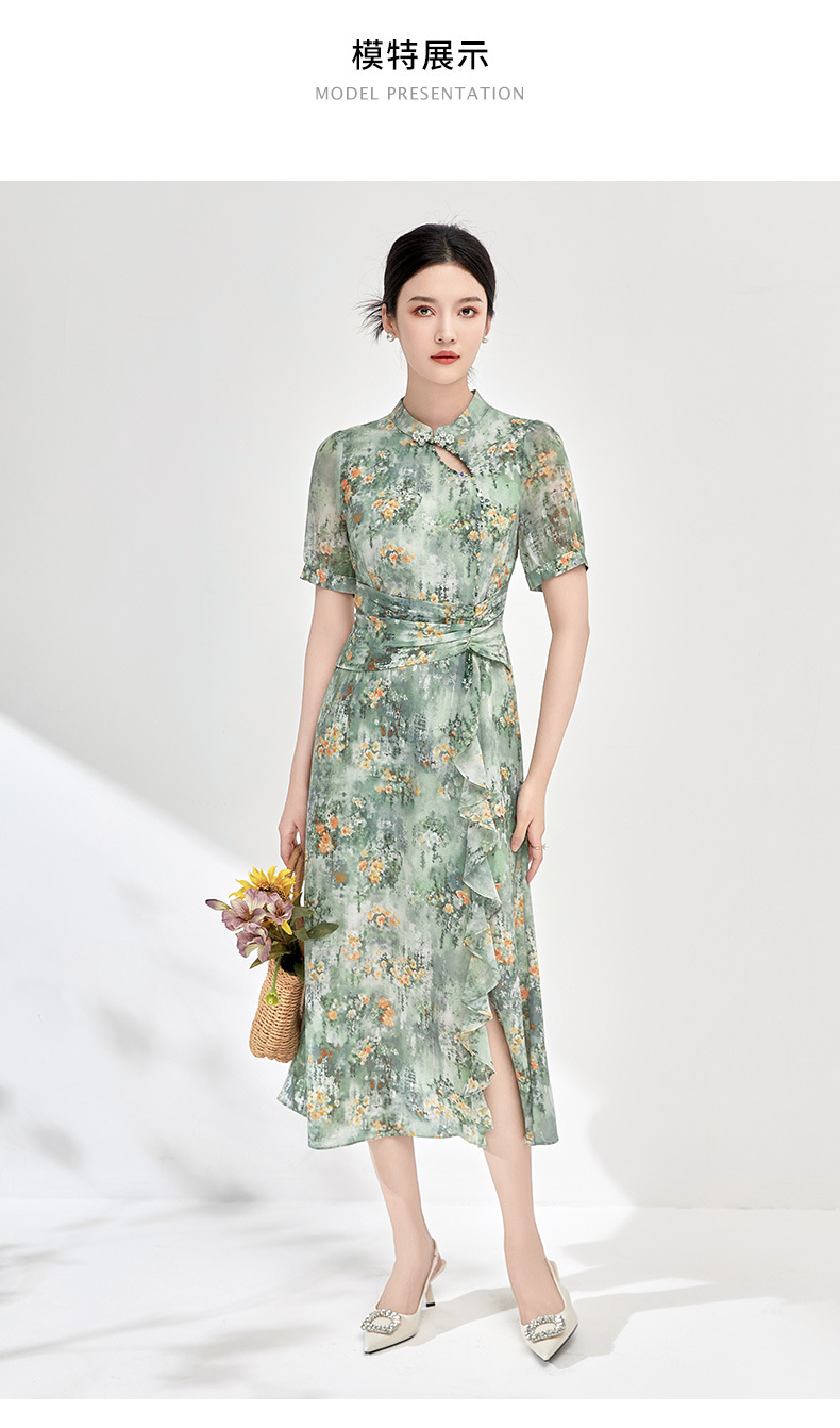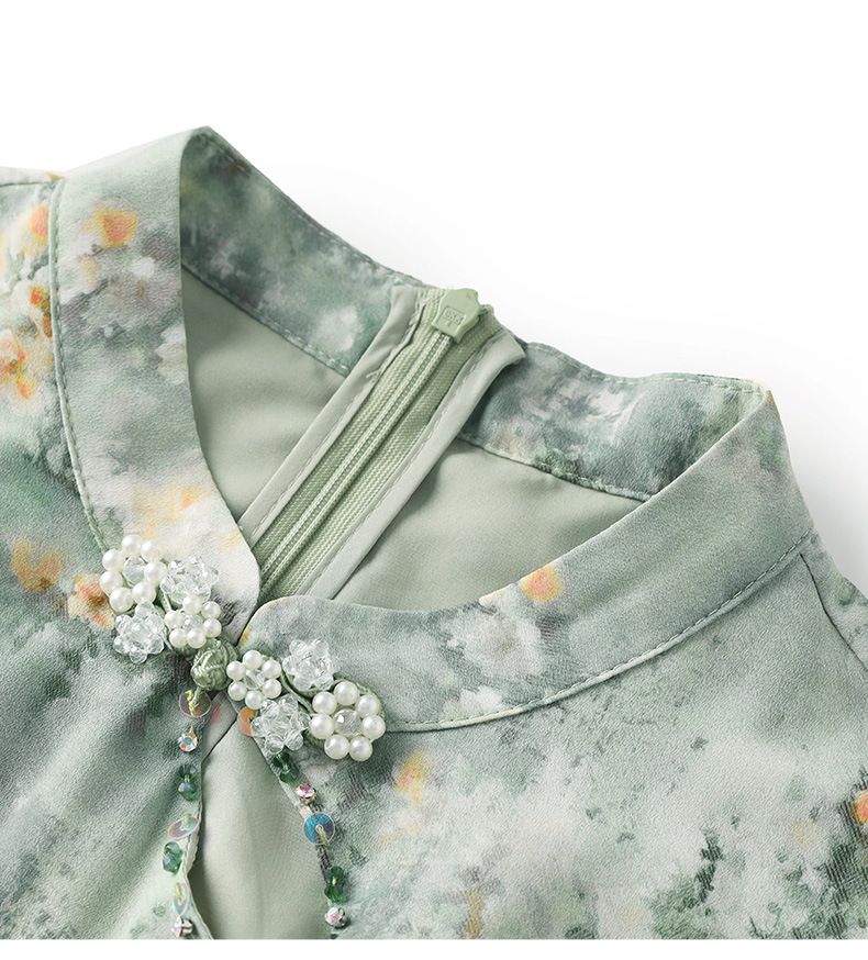 重工钉珠新中式旗袍,改良法式复古雪纺印花连衣裙WLZD-2413206