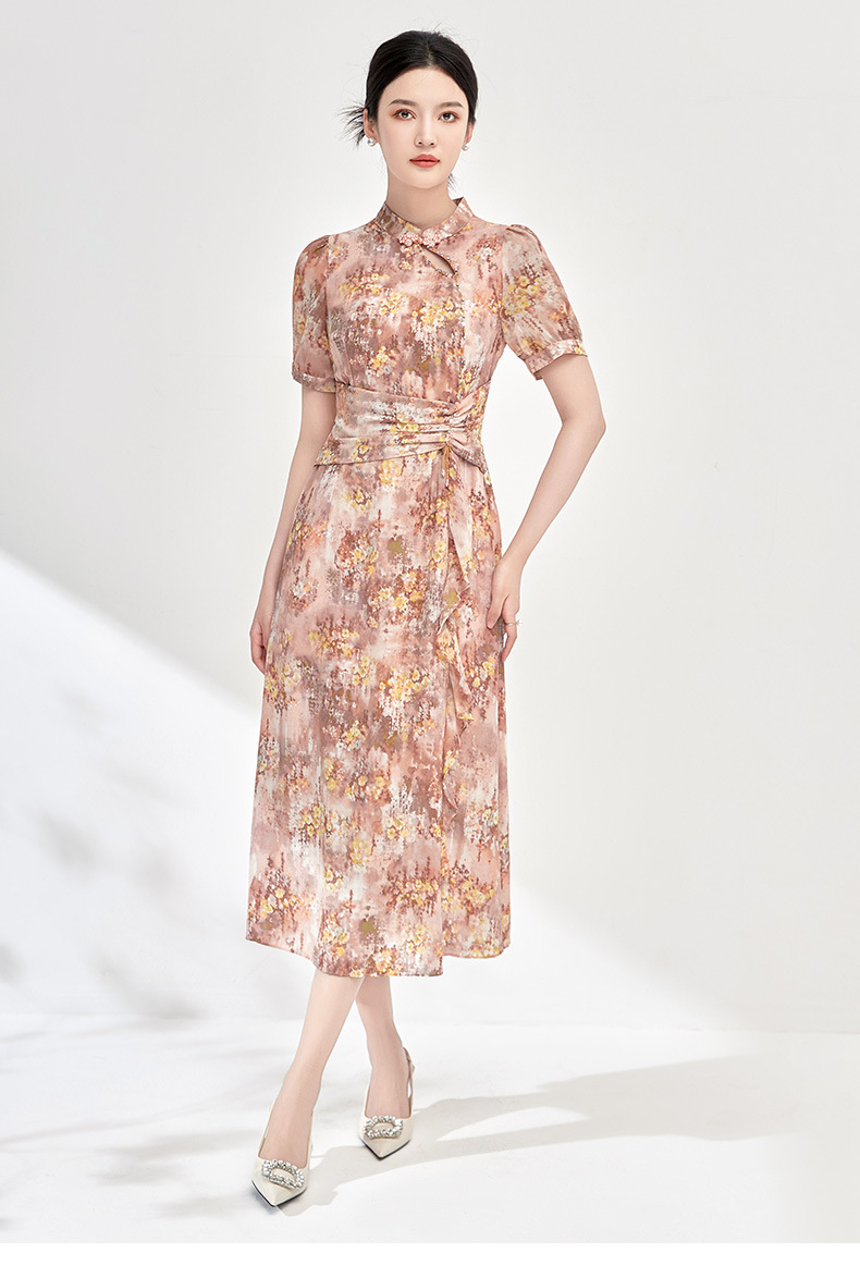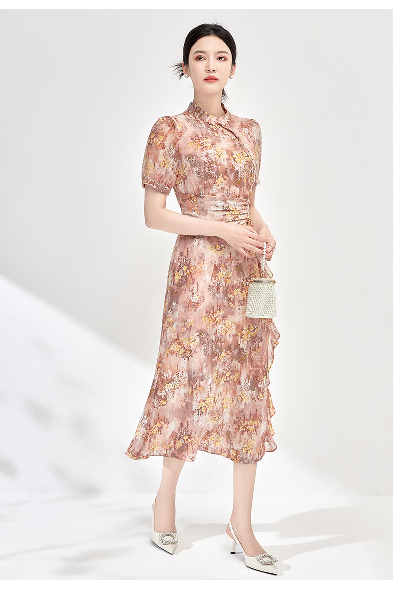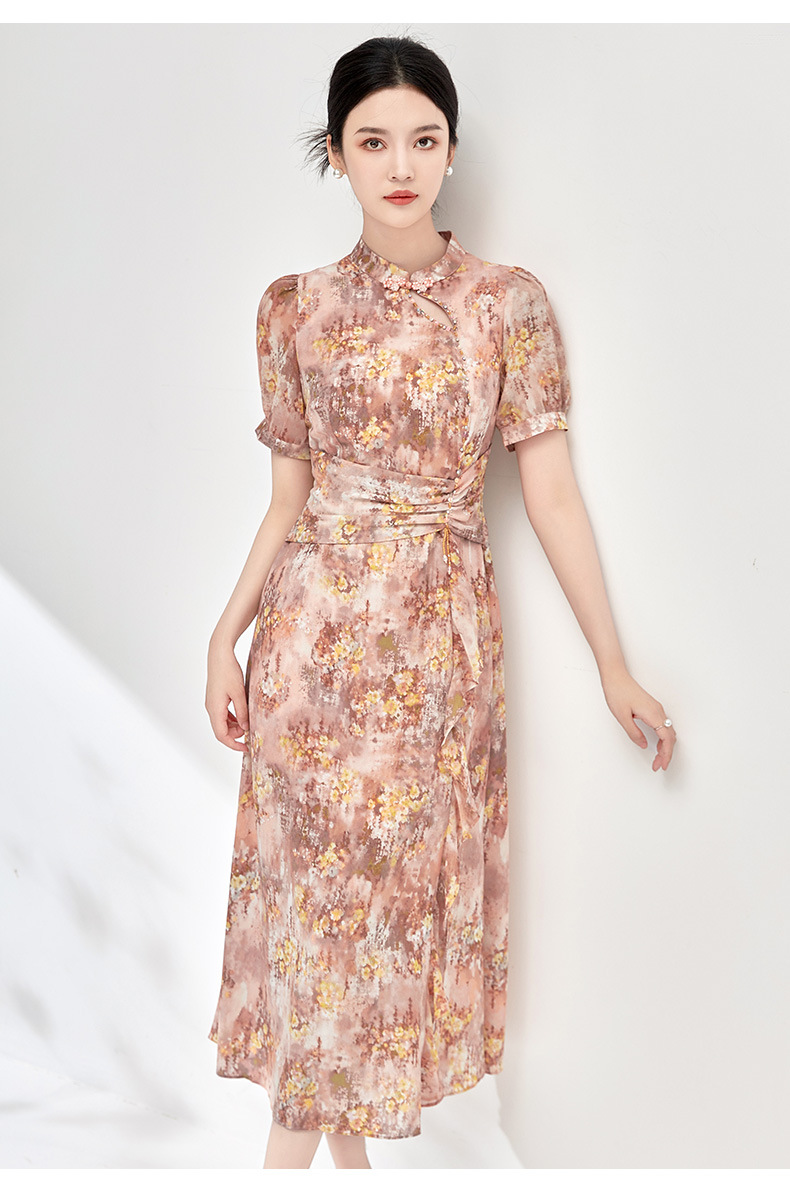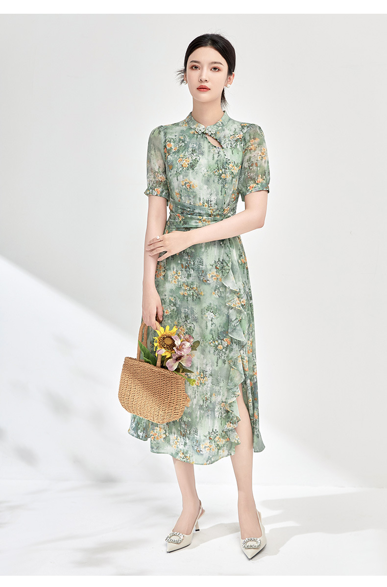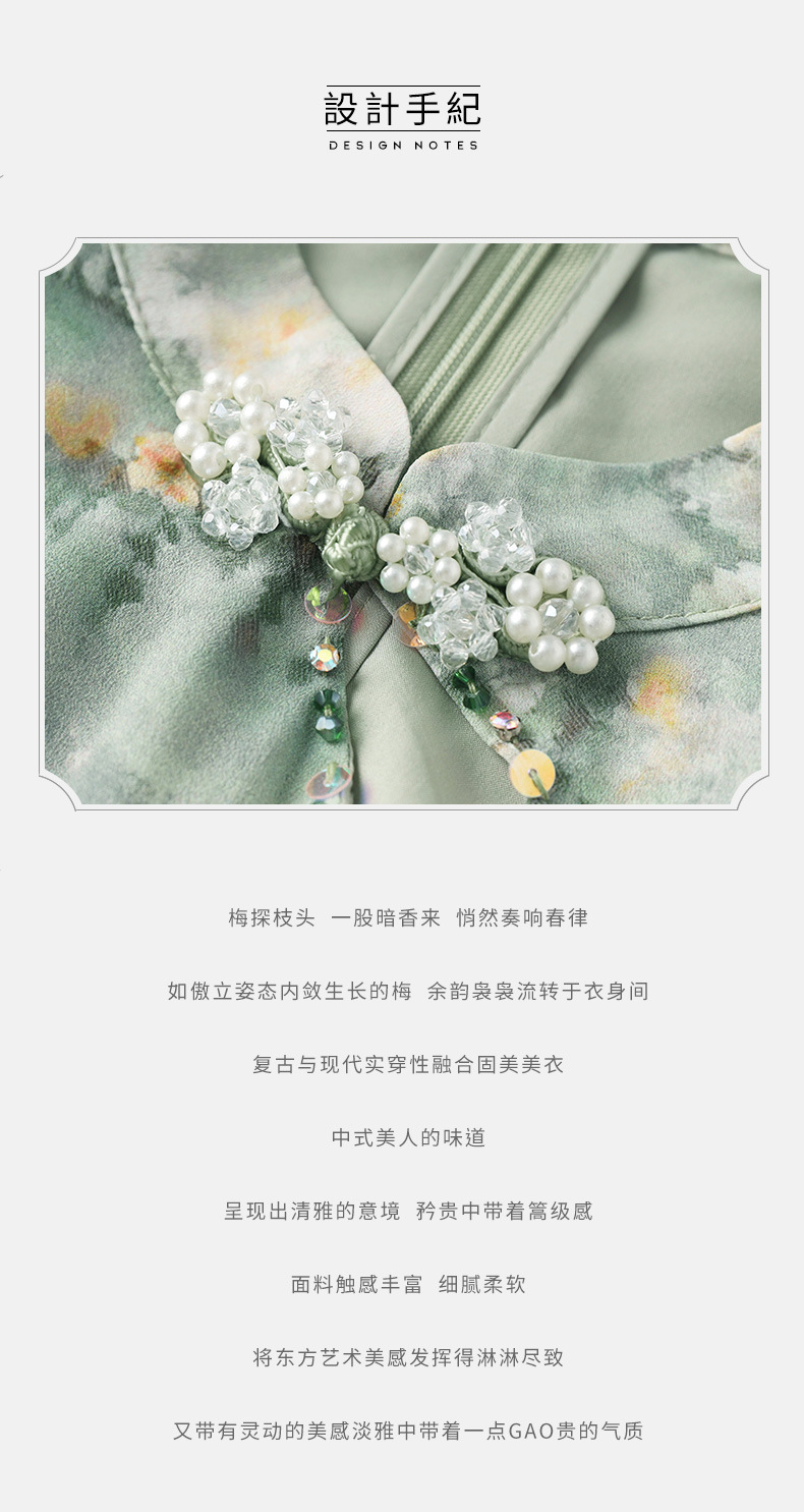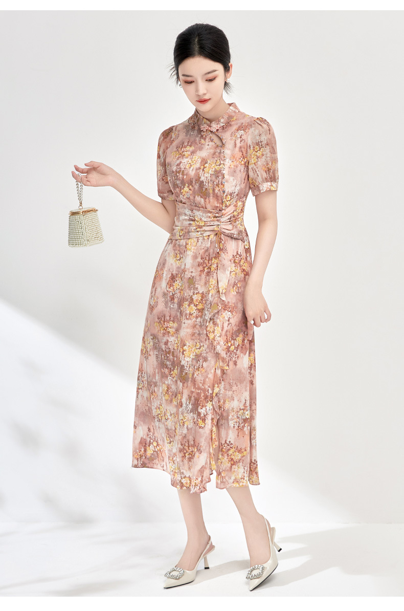 重工钉珠新中式旗袍,改良法式复古雪纺印花连衣裙WLZD-2413206