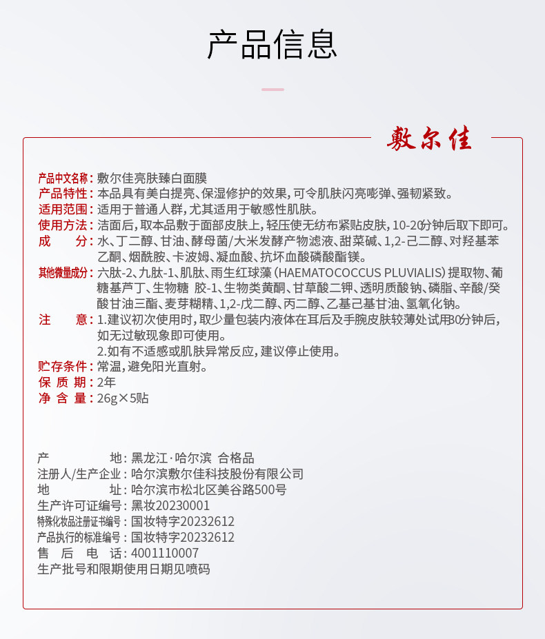 敷尔佳亮肤臻白面膜 补水美白去黄气暗沉淡斑提亮肤色紧致保湿修护