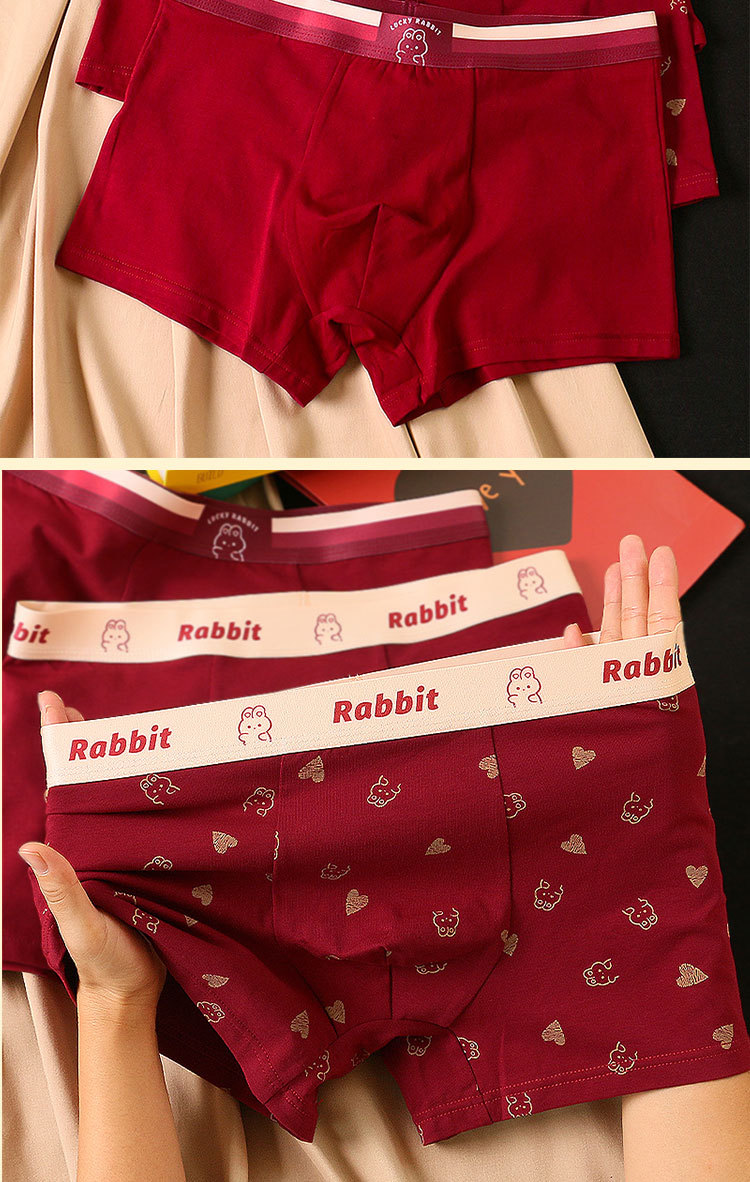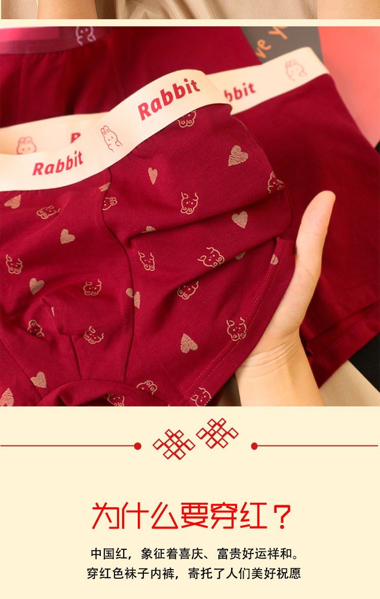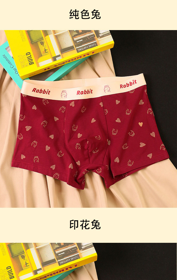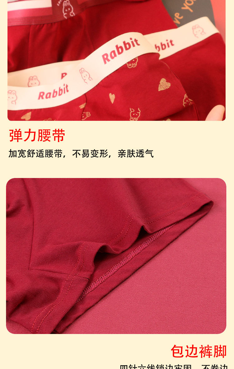 礼盒装内裤【男士红色四角裤】纯棉平角短裤衩 可爱兔子印花 结婚内裤本命年