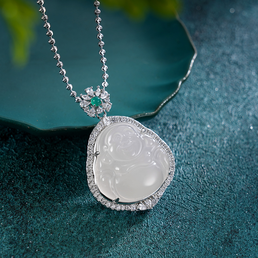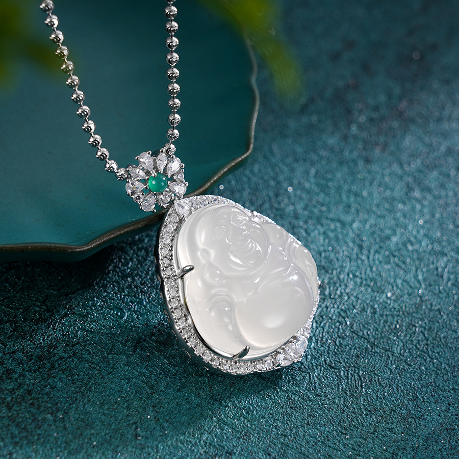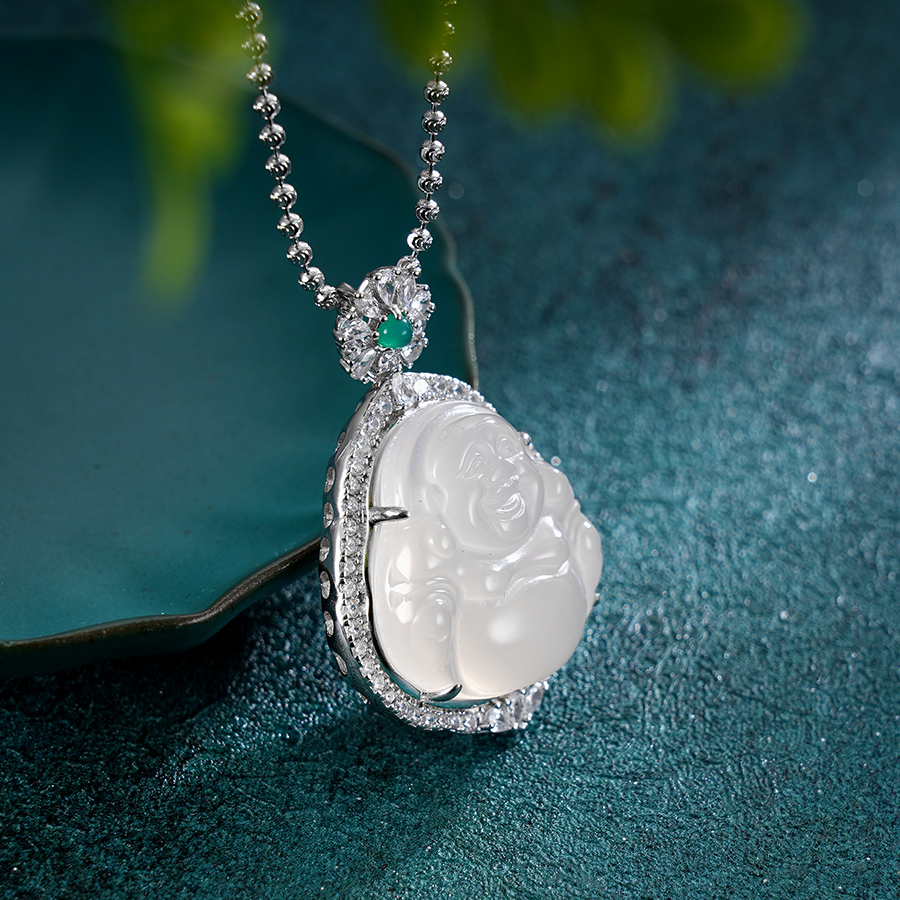 子佩集S925银【笑口常开】套链【DZ017223】纯银白玉髓弥勒佛项链2408