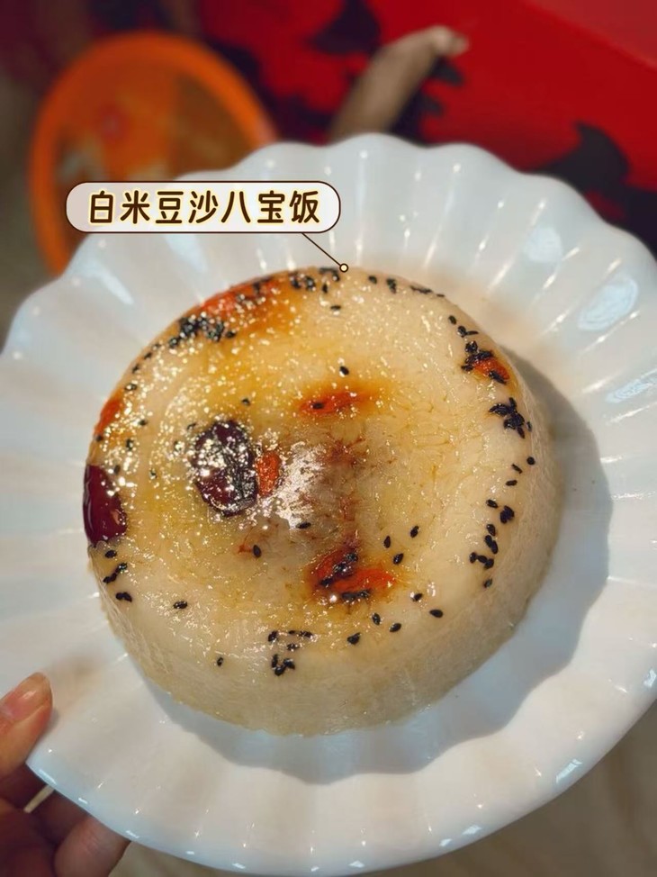 豆沙八宝饭:糯米,豆沙馅,食用猪油,白砂糖,食用盐,饮用水,红枣,枸杞,黑芝麻