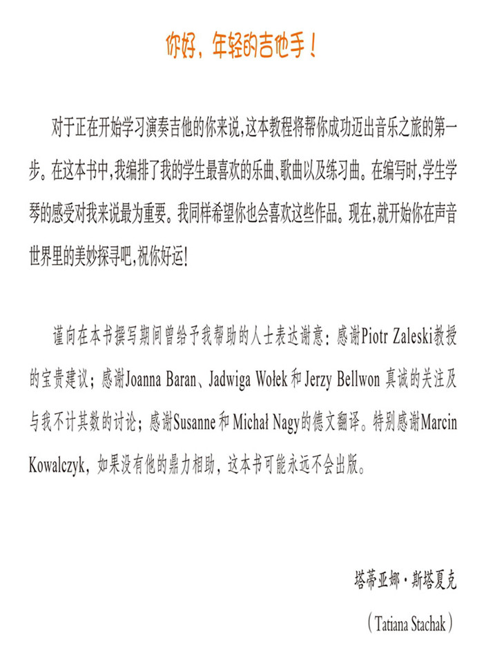 塔蒂亚娜·斯塔夏克,波兰吉他演奏家,出版社特约吉他板块主编。本书为波兰引进版图书,编辑策划并组稿。本套书分为基础篇和进阶篇两个分册。这是一套针对儿童的、从零起步学吉他的教程,其独奏曲旋律简洁,节奏生动,非常符合儿童审美需求;所配图画运用水彩画风,色彩柔美,线条讲究,与吉他作品的谱例相得益彰,有机地互动;随机呈现的演奏技法要点和乐理知识,阐述清晰,简明扼要,容易掌握。这套教程曾送到专业吉他老师处审阅,被充分肯定,称为“儿童吉他汤普森”。此外,它以四种语言呈现,版权已顺利输出到德国和奥地利。