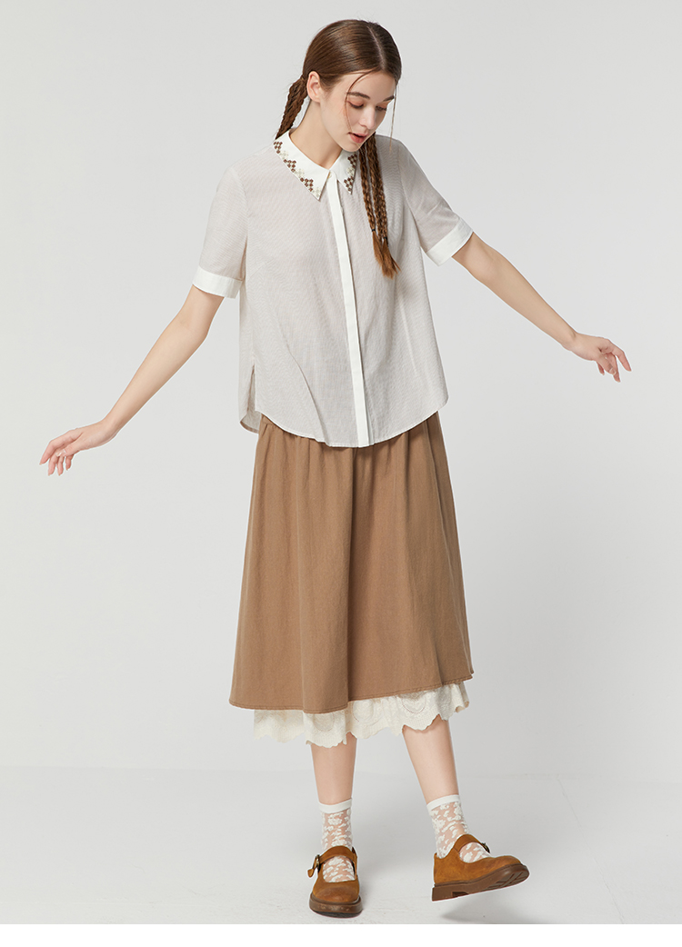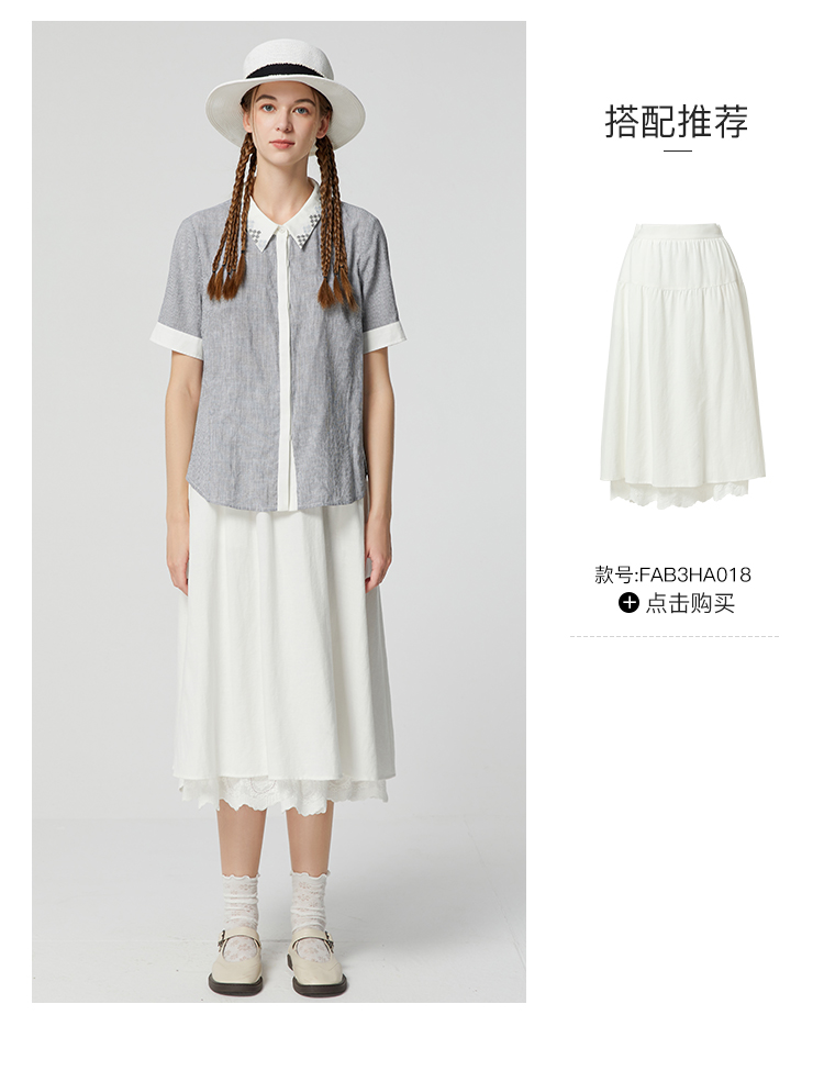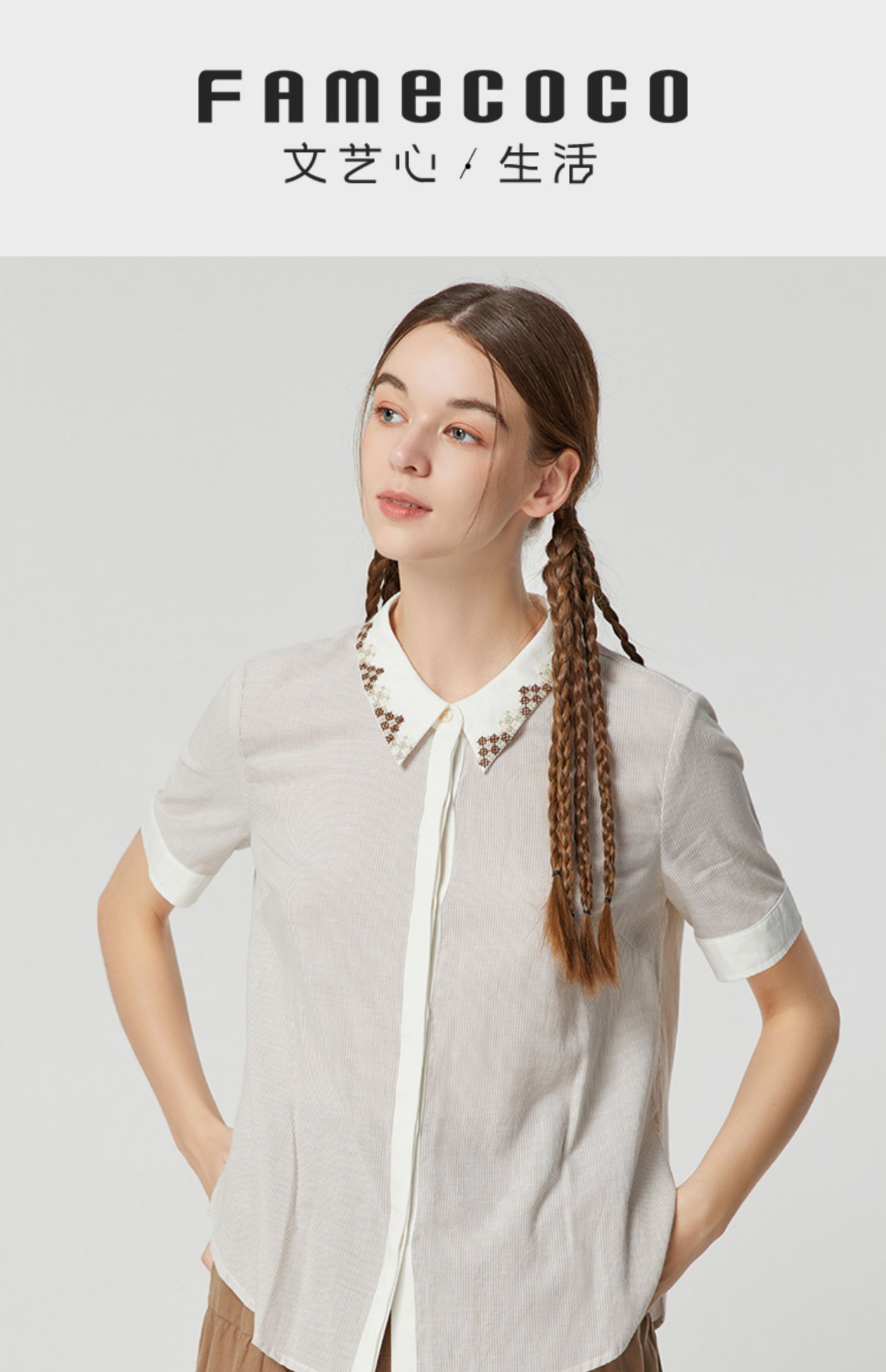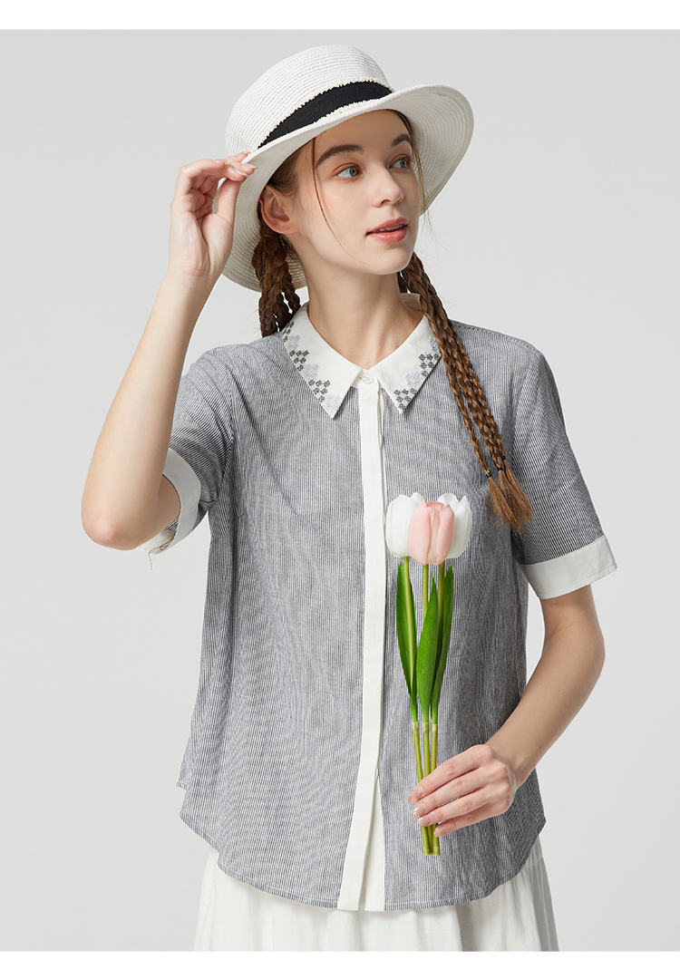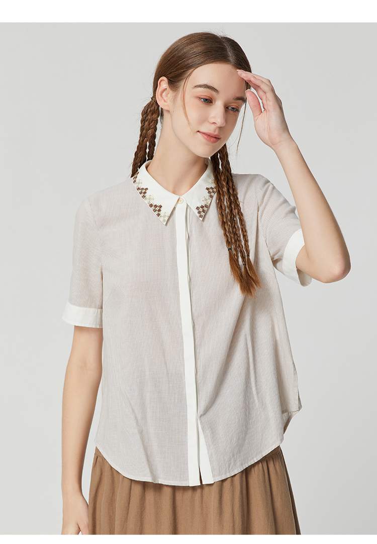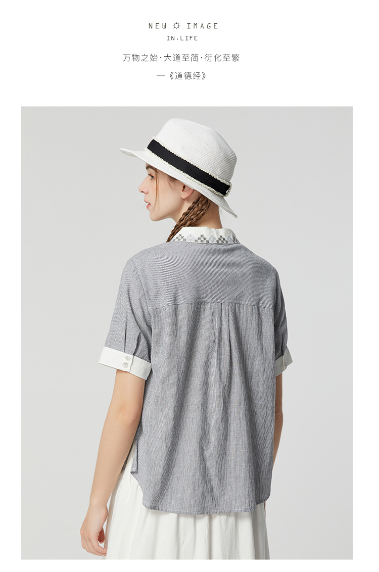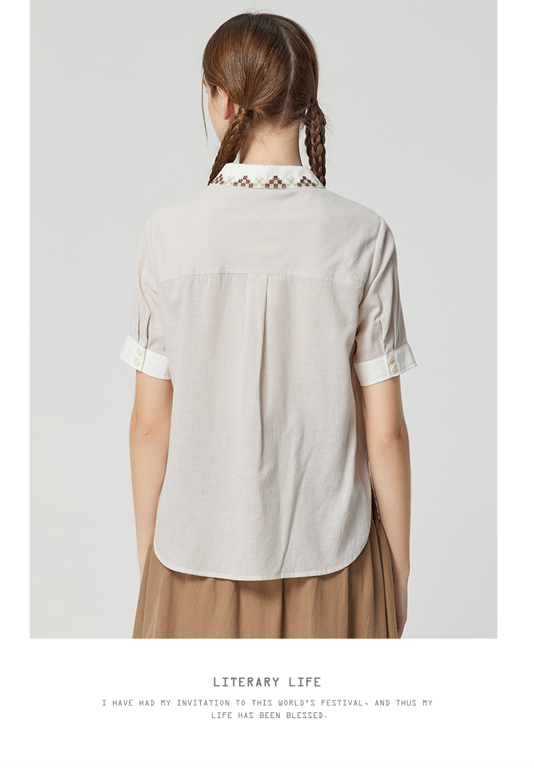 famecoco范可儿文艺复古棉麻衬衫女夏款撞色刺绣翻领小衫FAB3BH011