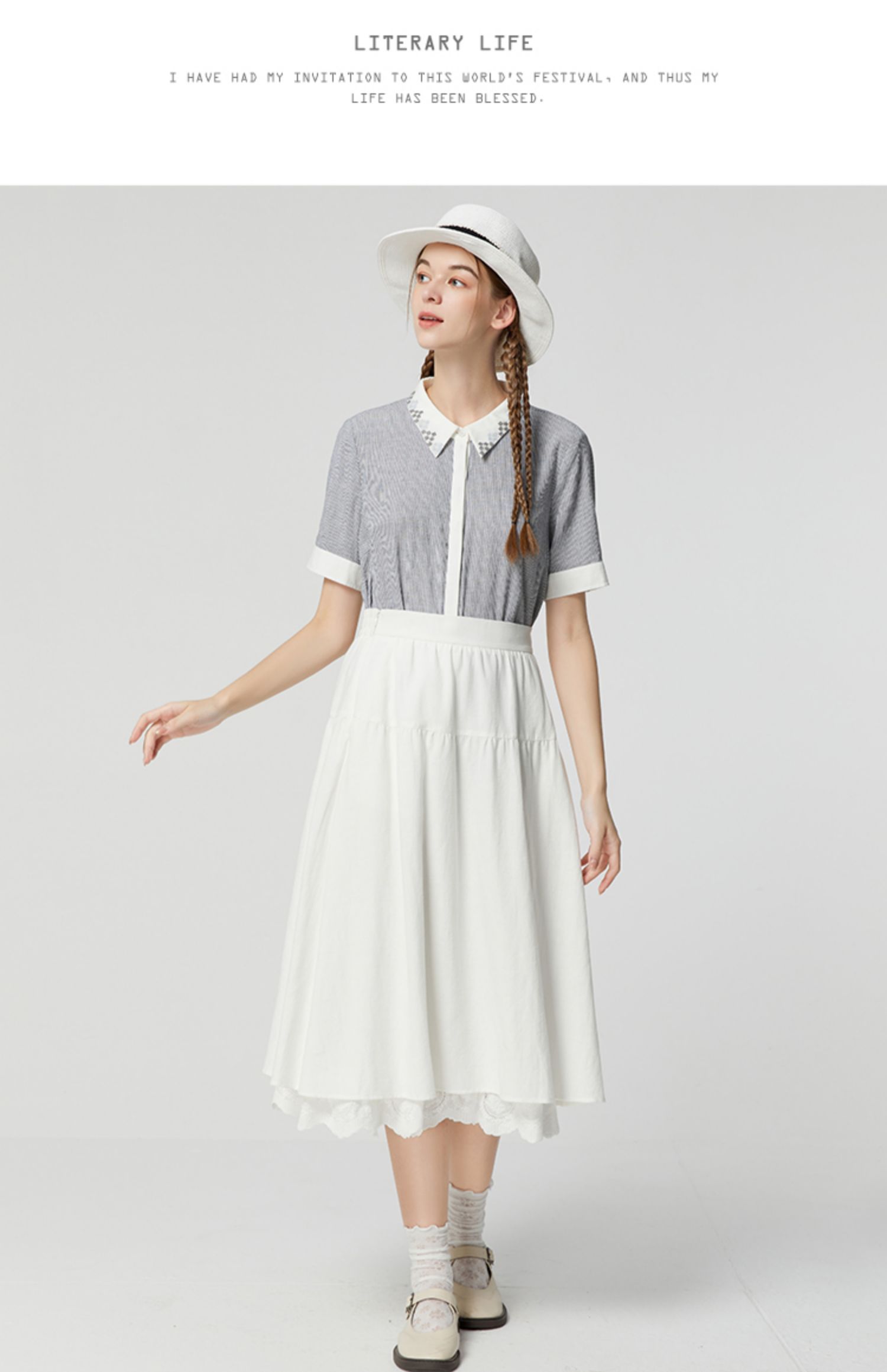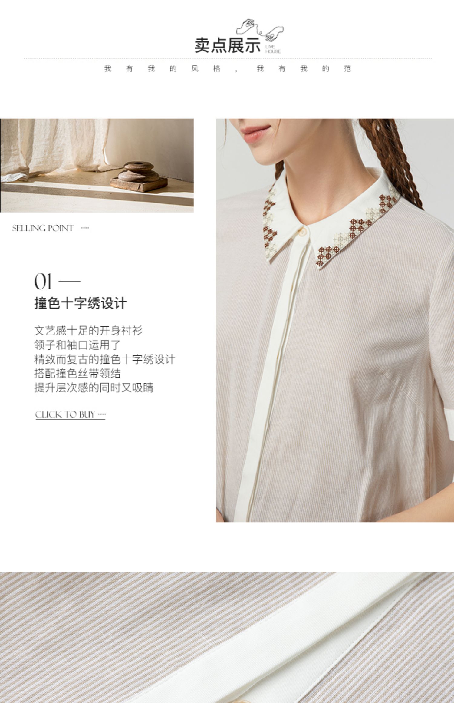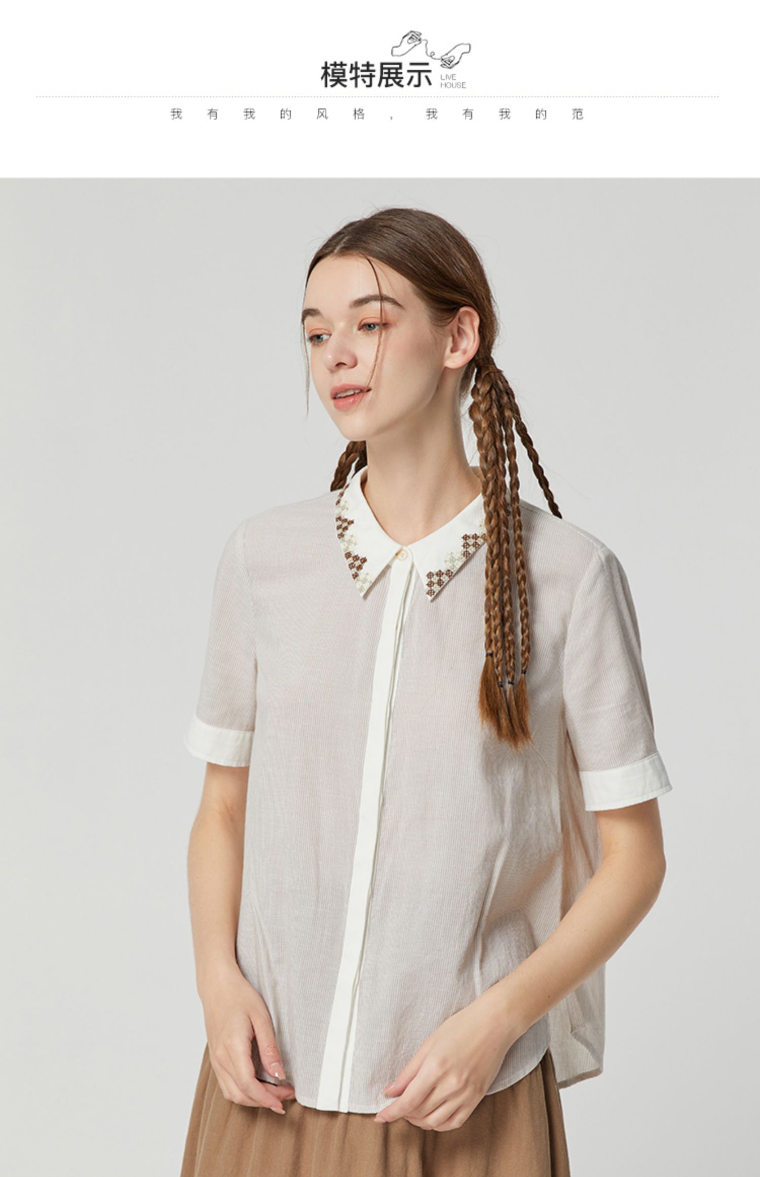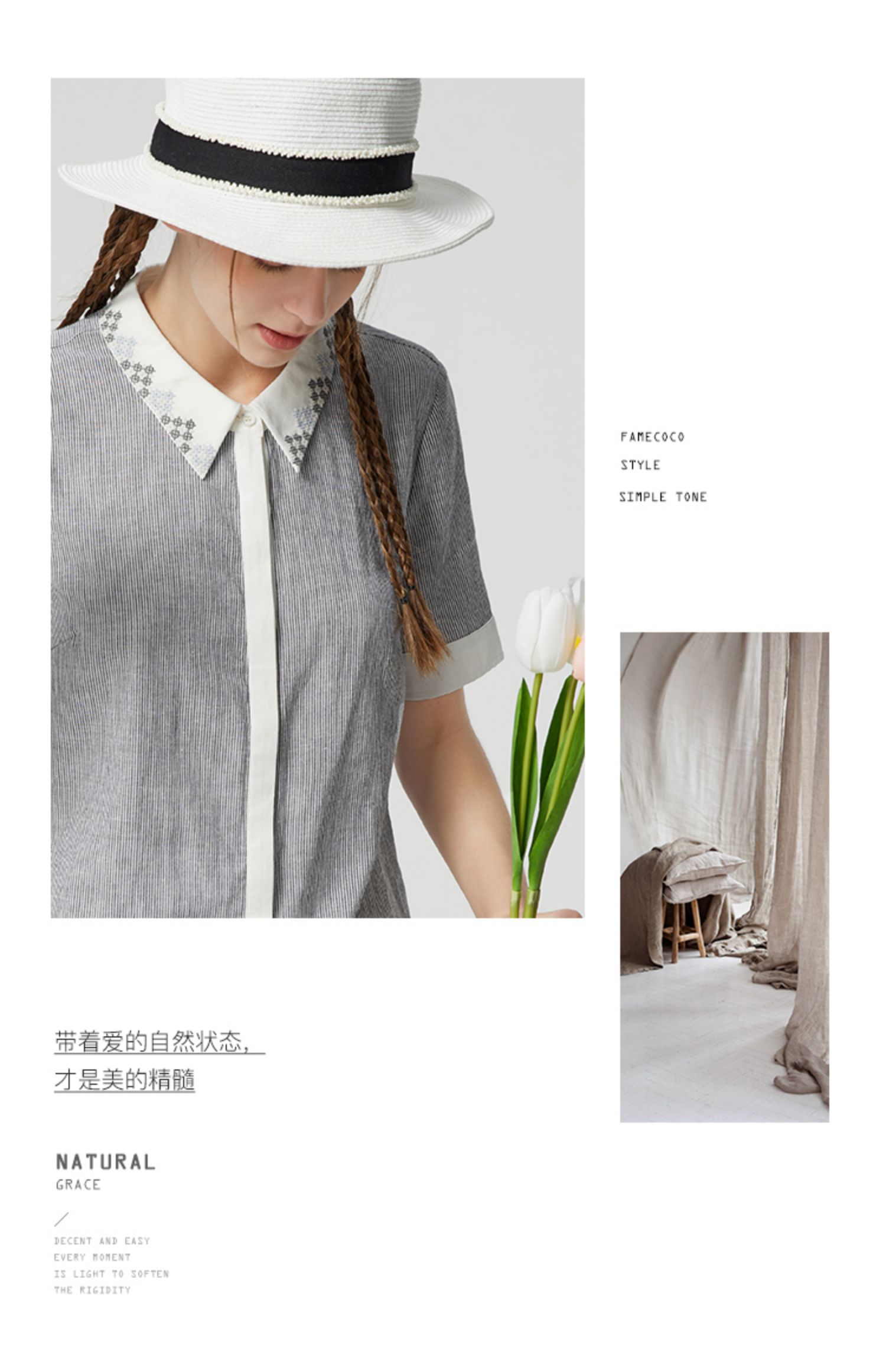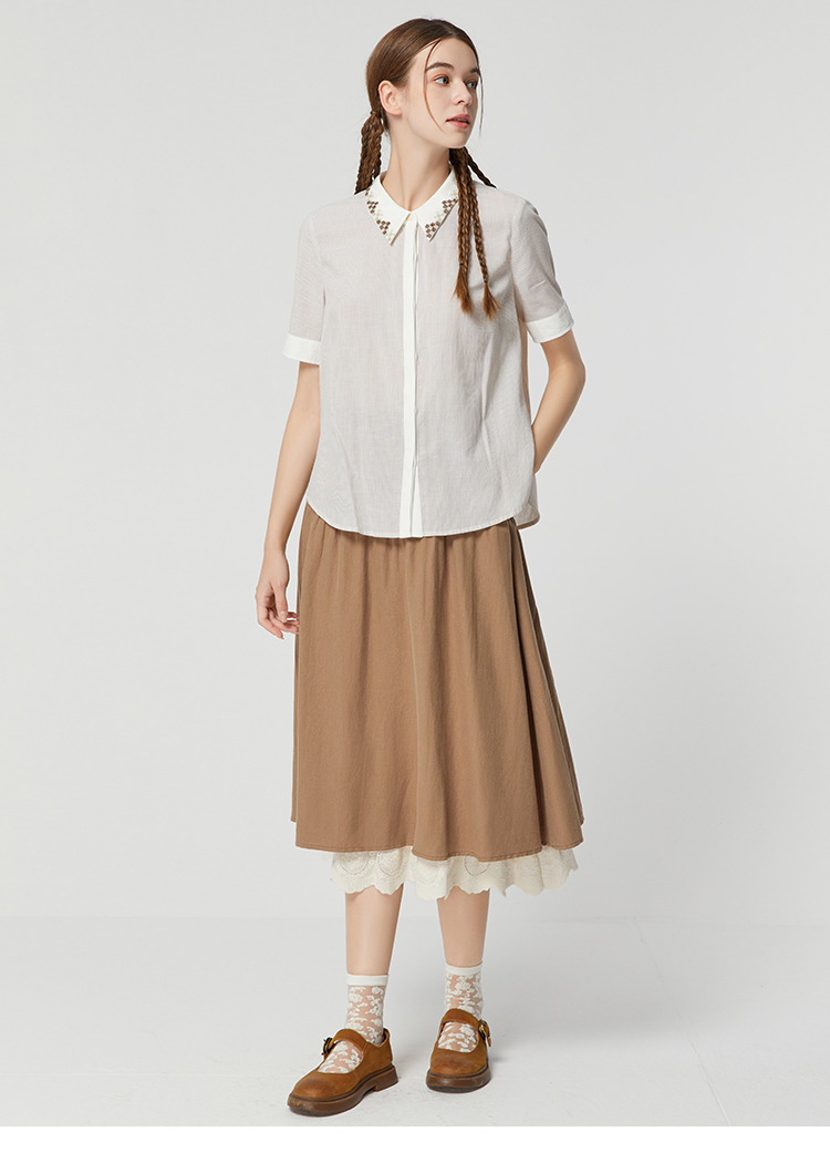 famecoco范可儿文艺复古棉麻衬衫女夏款撞色刺绣翻领小衫FAB3BH011