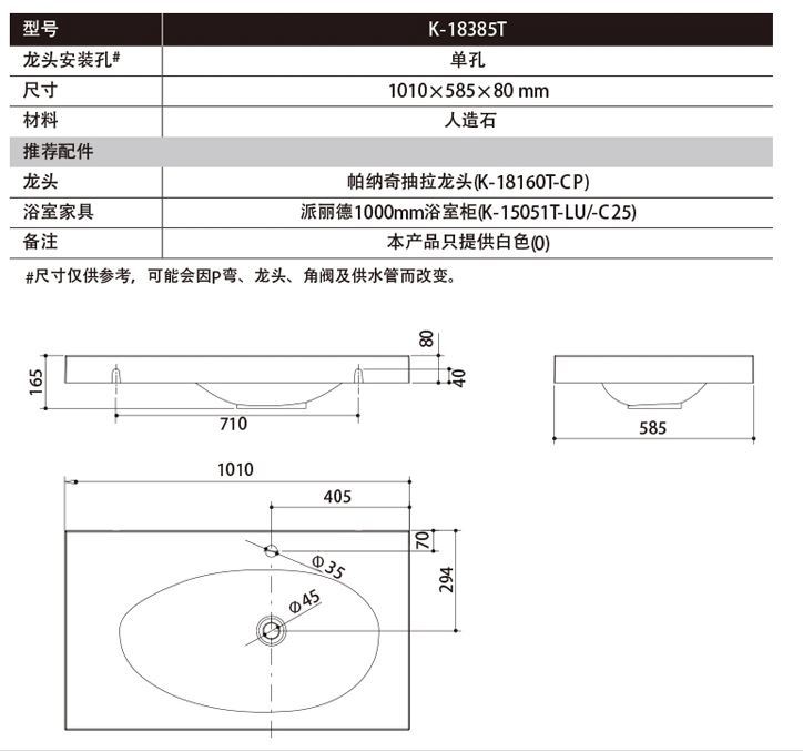 科勒派丽德1010mm一体化台盆在右18385T-0