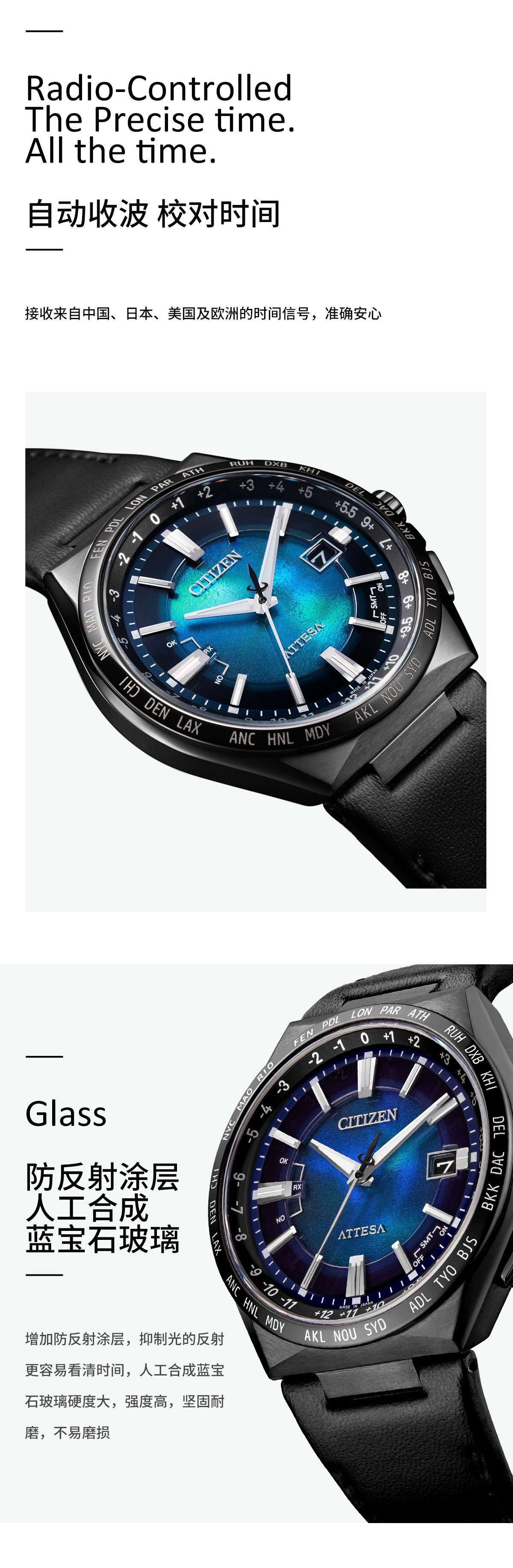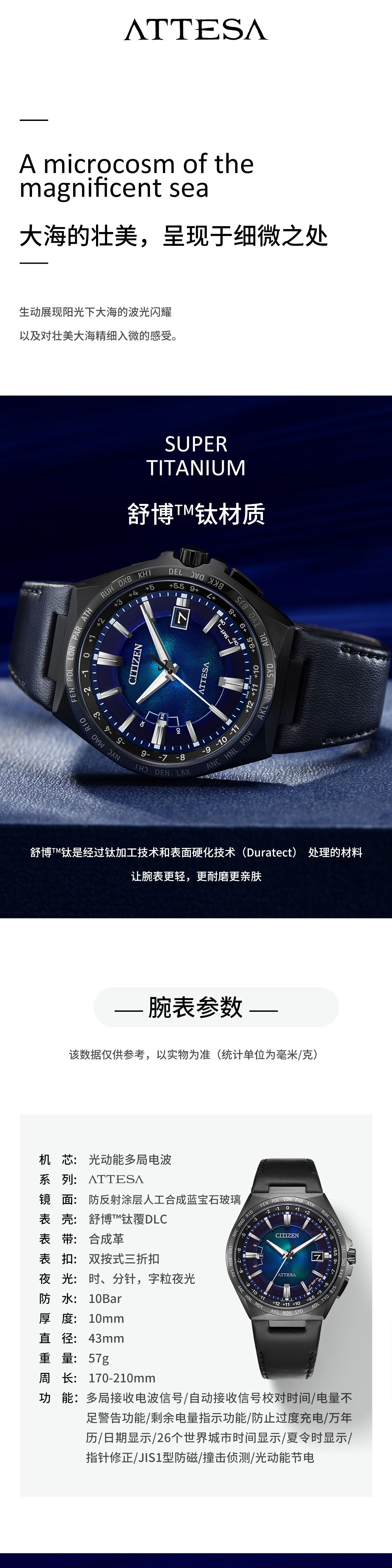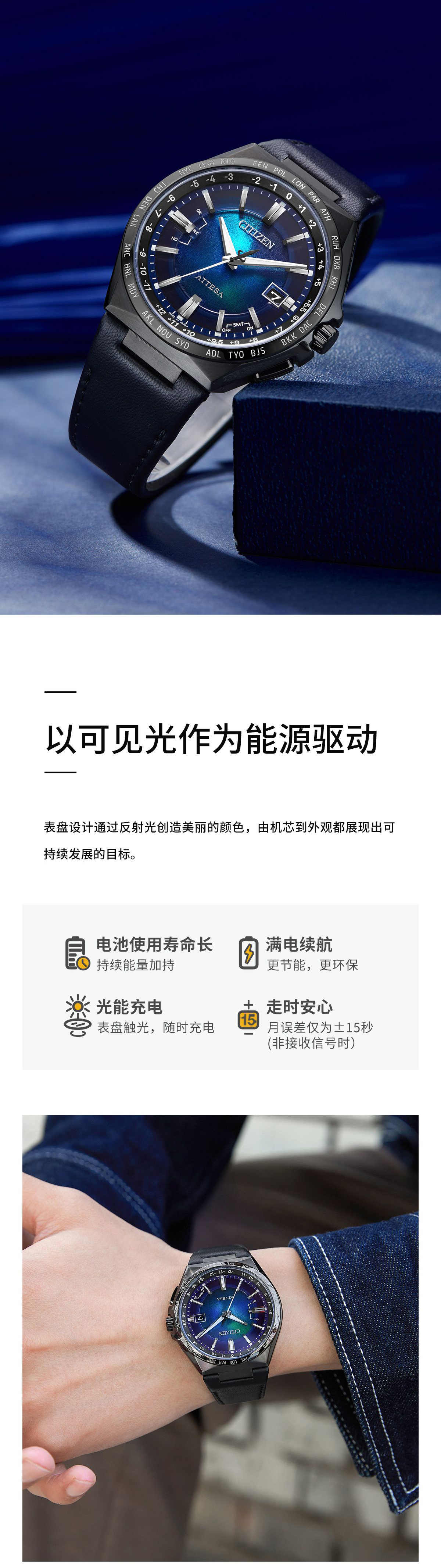 西铁城/CITIZEN蓝色海洋系列ATTESA系列舒博钛海蓝盘商务电波皮带男士手表CB0215-18L