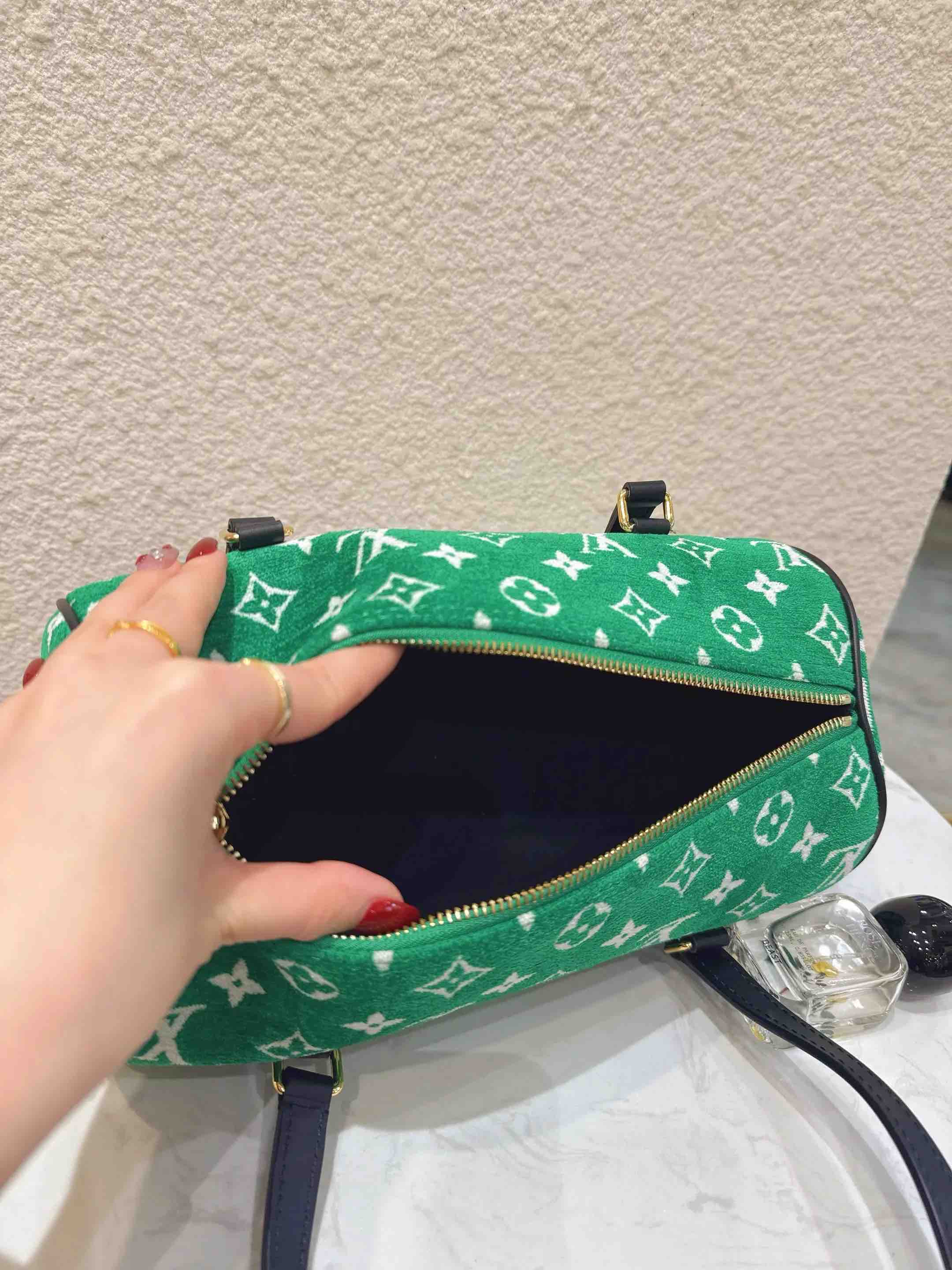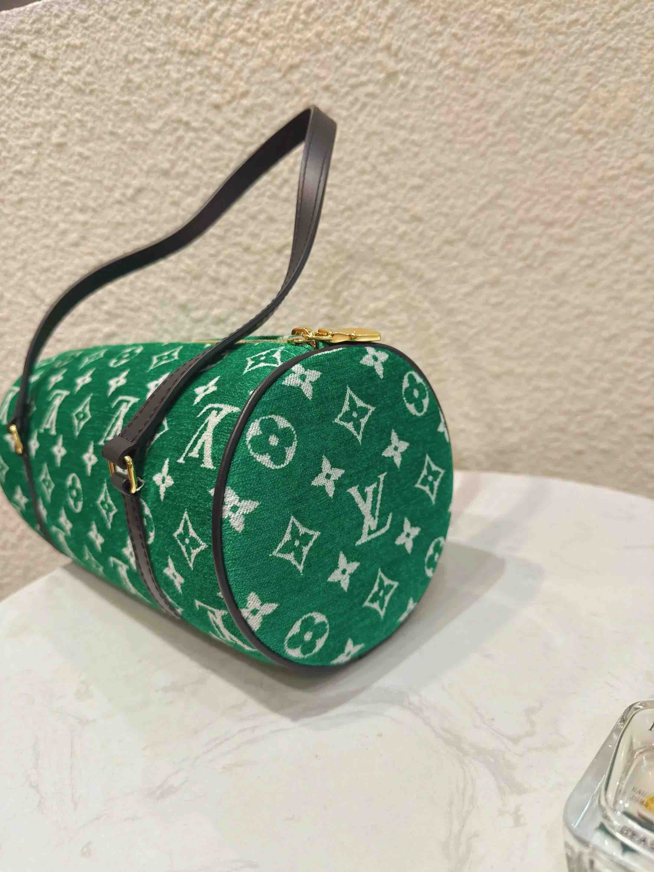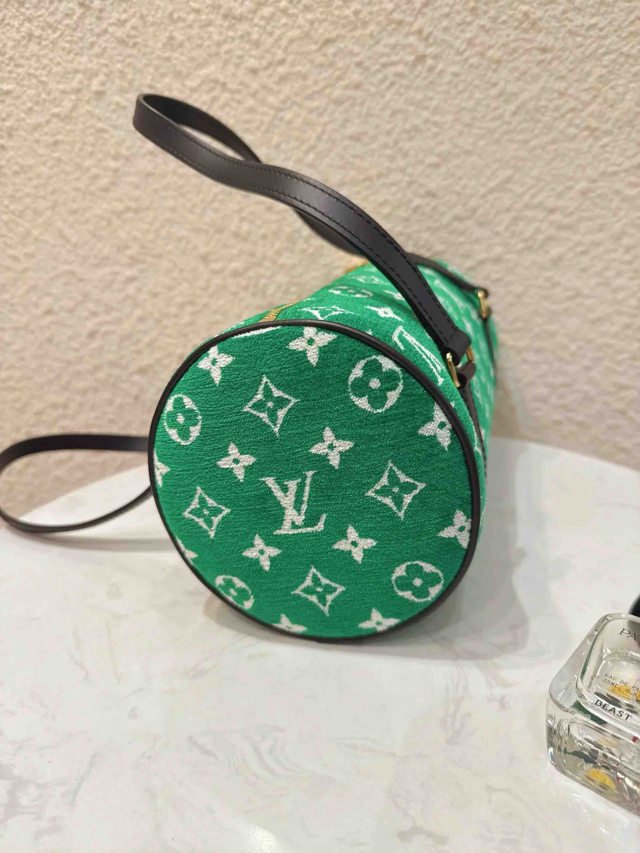 【商品详情】正品二手 LV 22年限定 巴比龙 绿色 提花 天鹅绒 圆筒包🍸98新 26*14 配件:防尘袋。个性时尚复古
