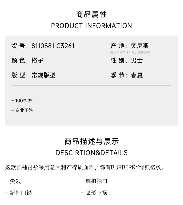 BURBERRY 巴宝莉 男士格纹棉质长袖衬衫 格子 8110881 C3261